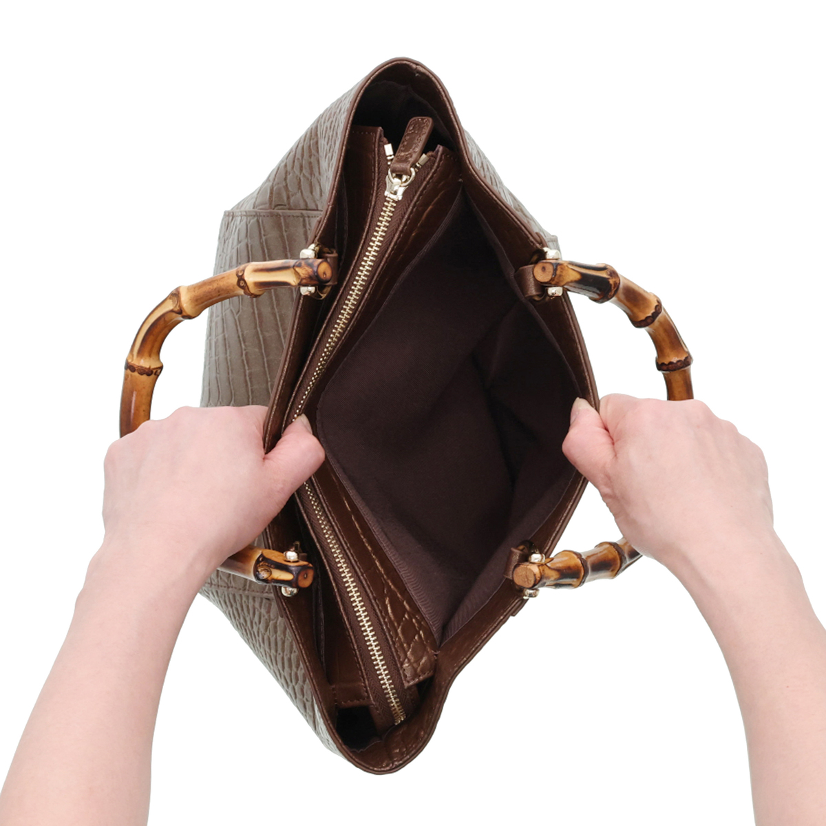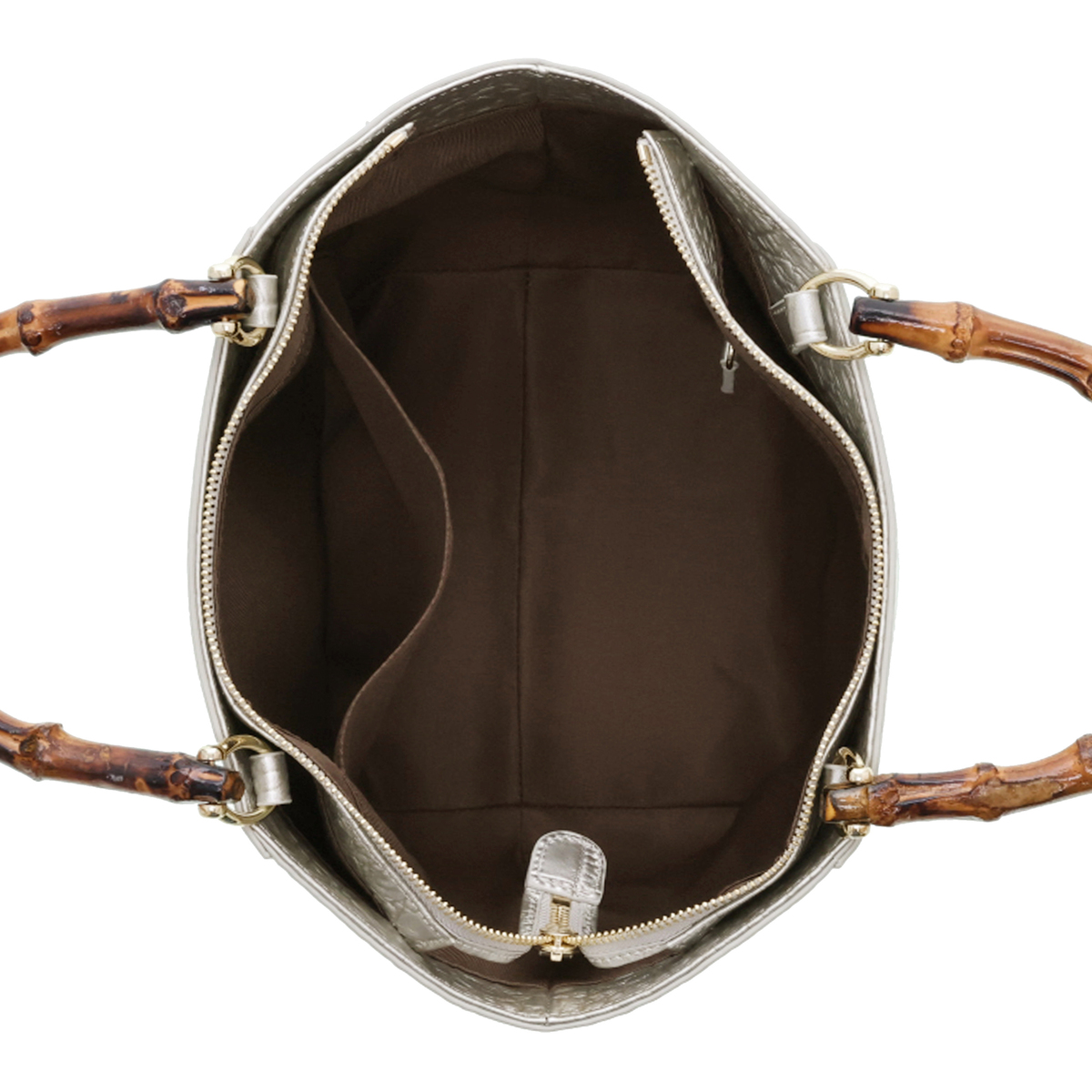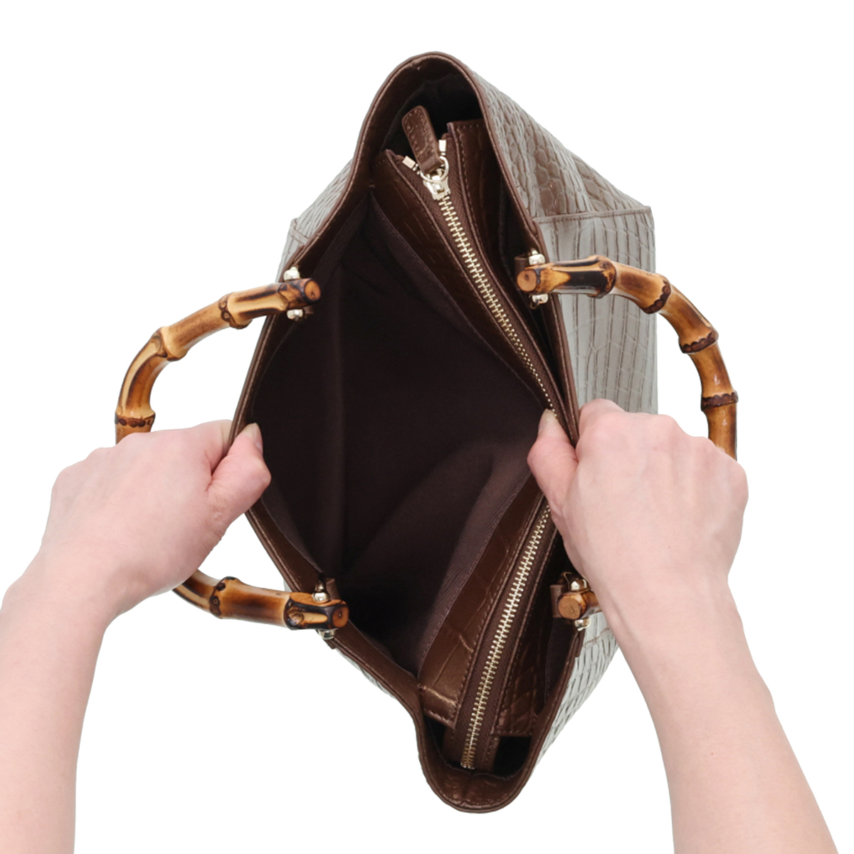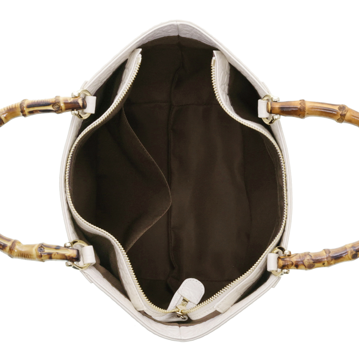 ハンドル以外の表面や底面、ファスナーサイド、ショルダーなどは全て牛革仕立て。ハンドルにはバンブーを採用し、ゴールドカラーの金具がさりげなく華やかさを添えます