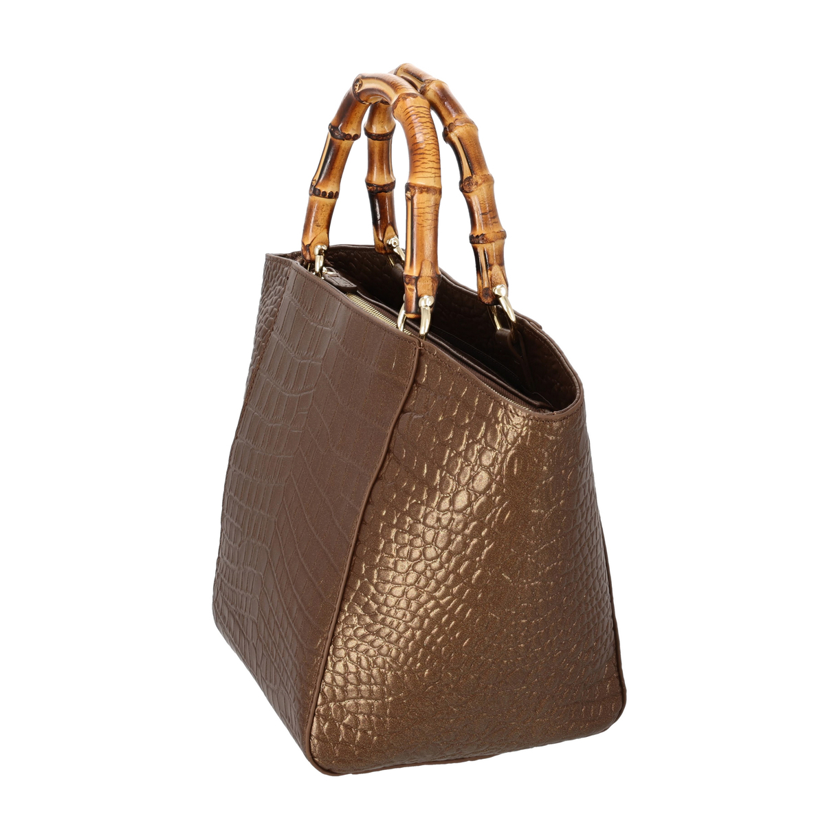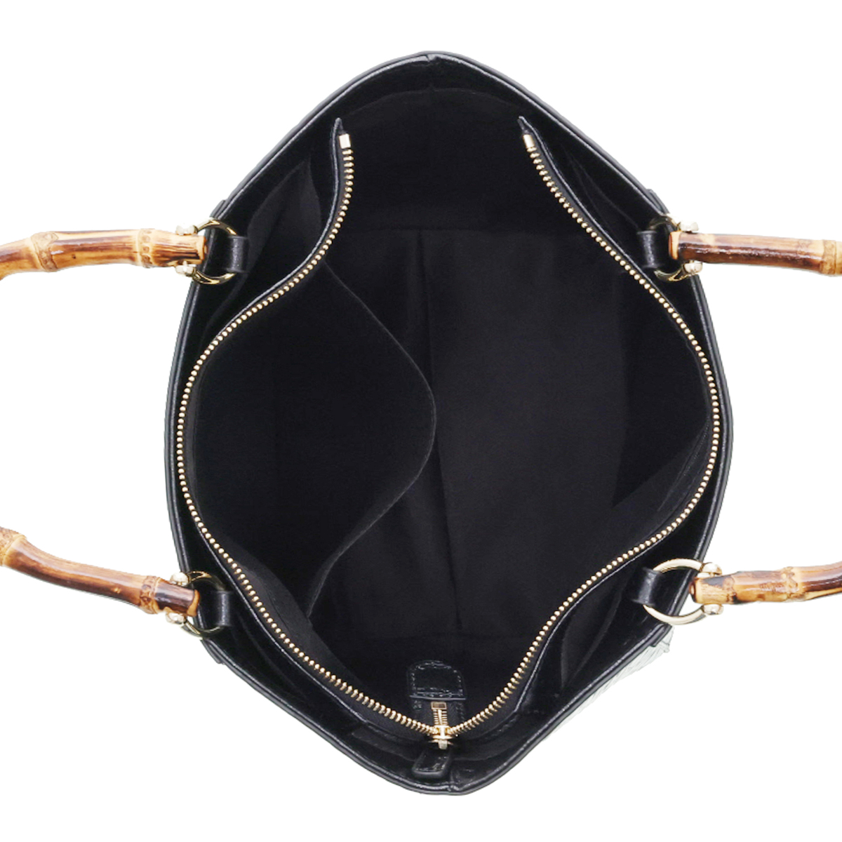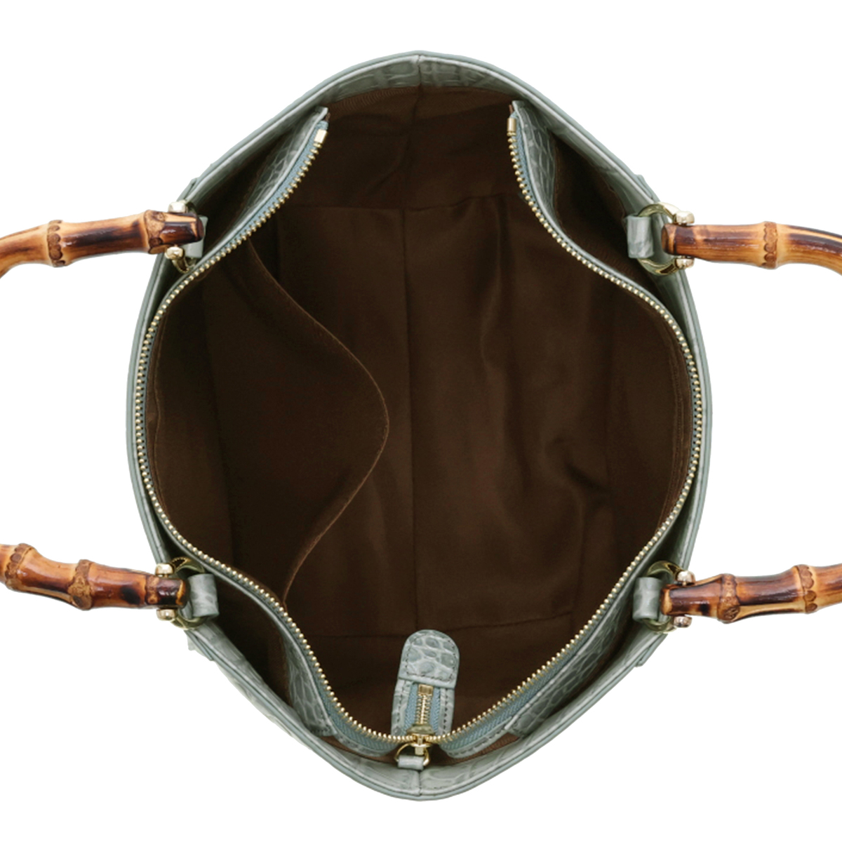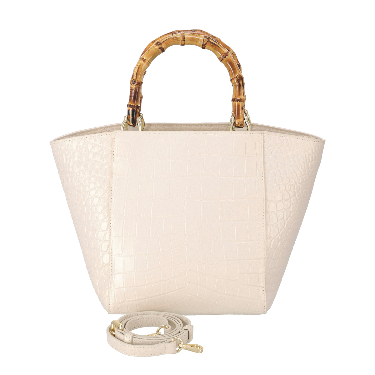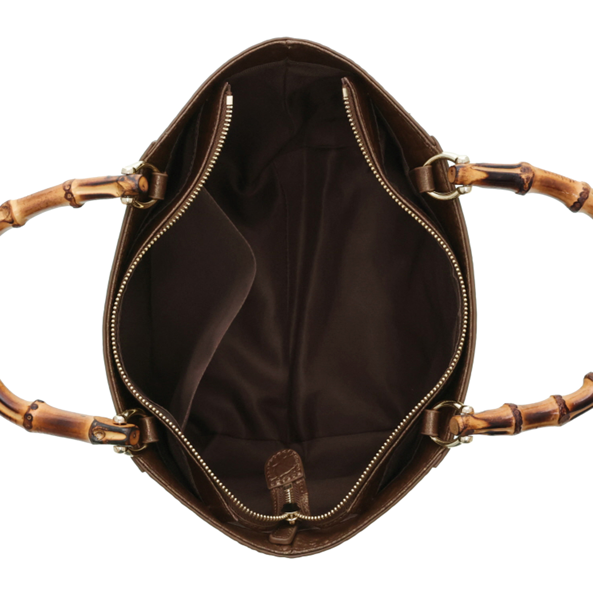 ハンドル以外の表面や底面、ファスナーサイド、ショルダーなどは全て牛革仕立て。ハンドルにはバンブーを採用し、ゴールドカラーの金具がさりげなく華やかさを添えます