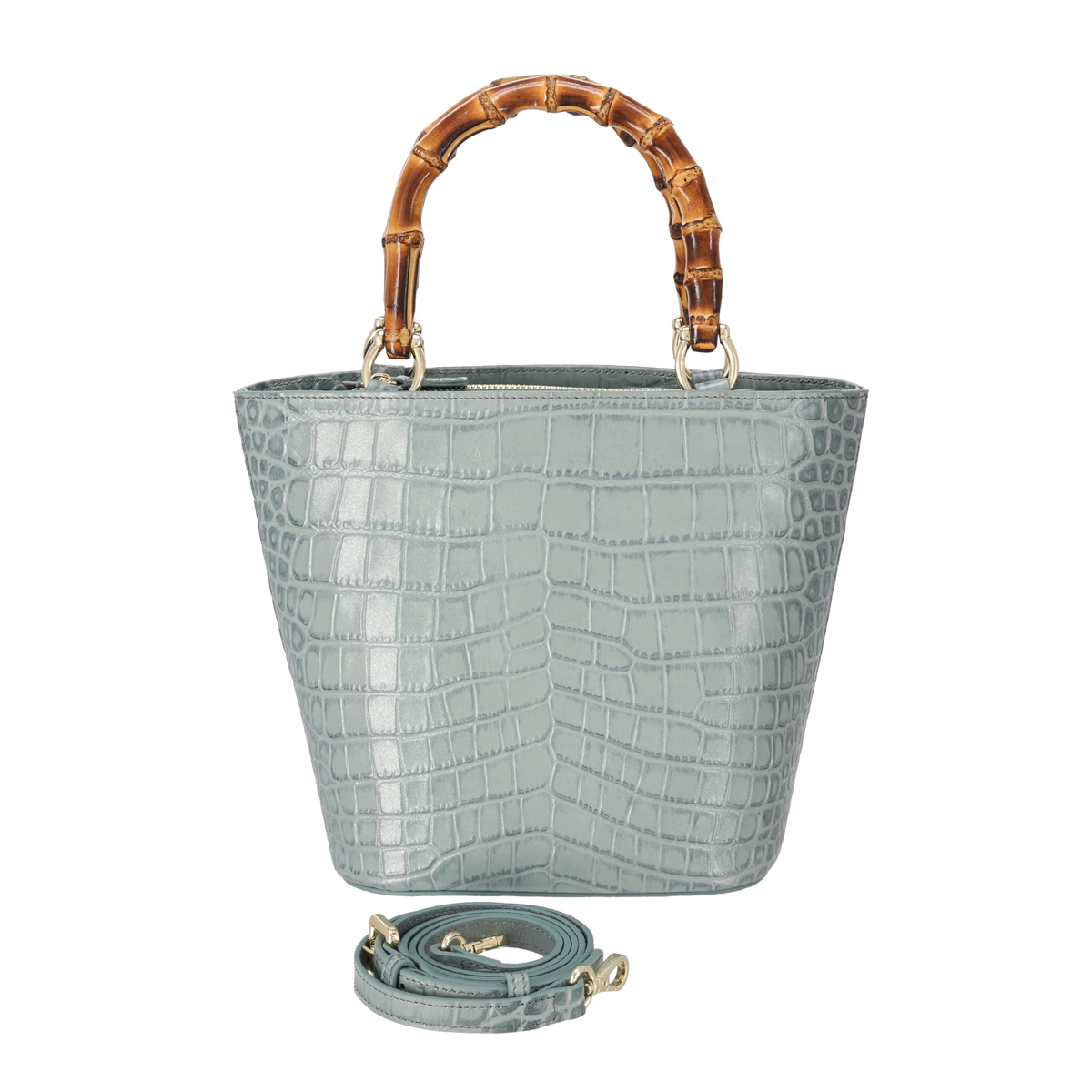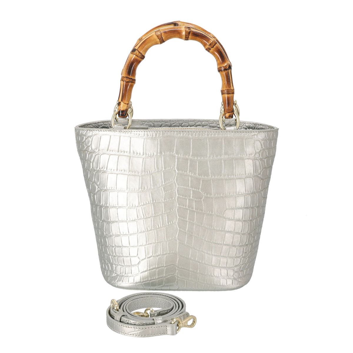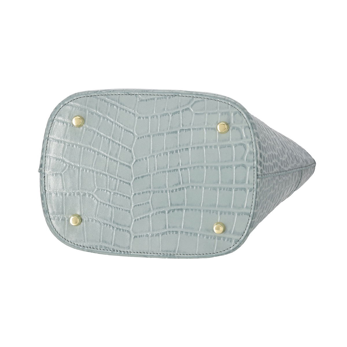 本体にしっかりと牛革を使用。またシルバー以外はラメ加工を施し、上品なきらめき感をプラスしています。牛革素材にしっかりと入れたクロコの型押し。通常型押しを施すと牛革に圧がかかるので硬くなりますが、ソフトな仕上げになっています