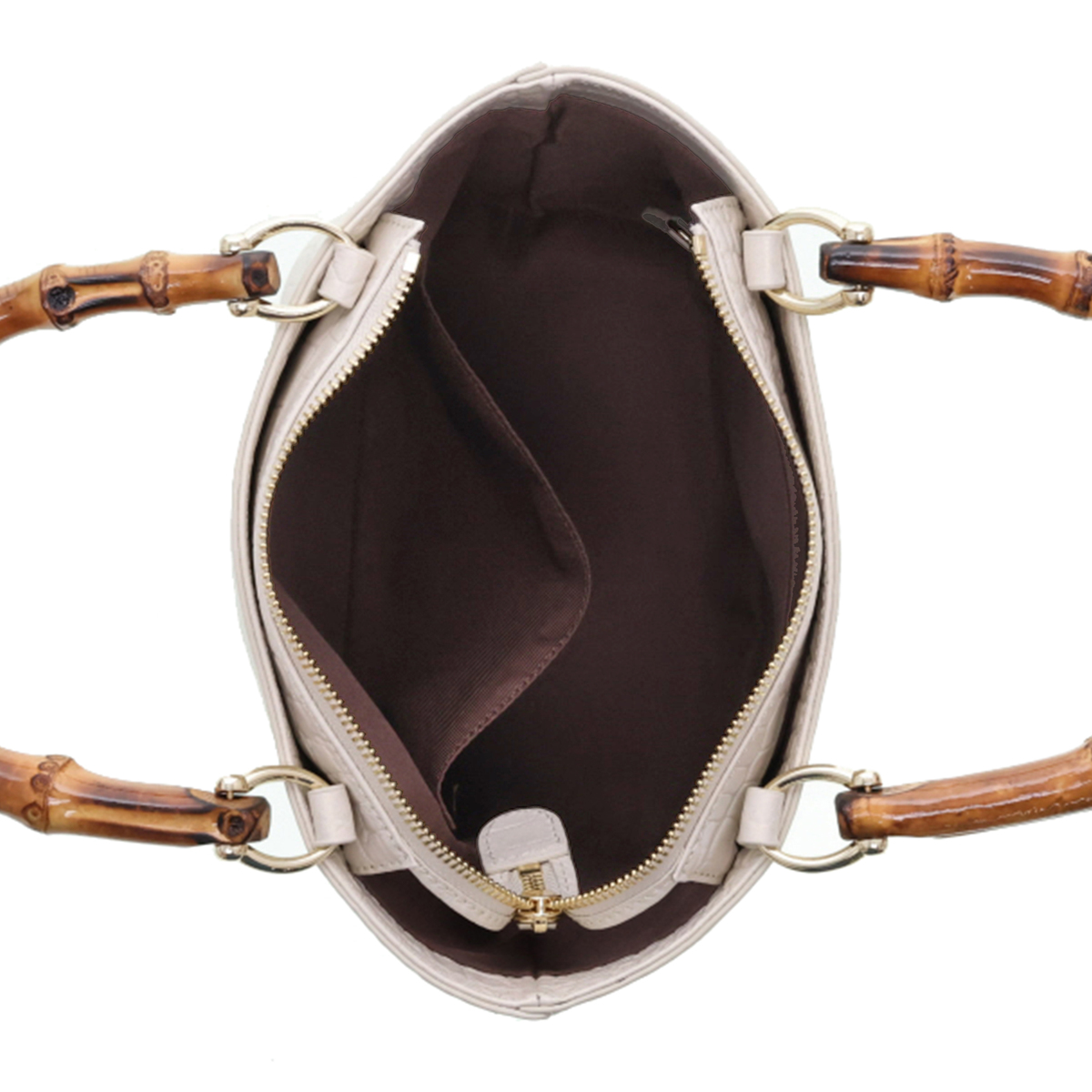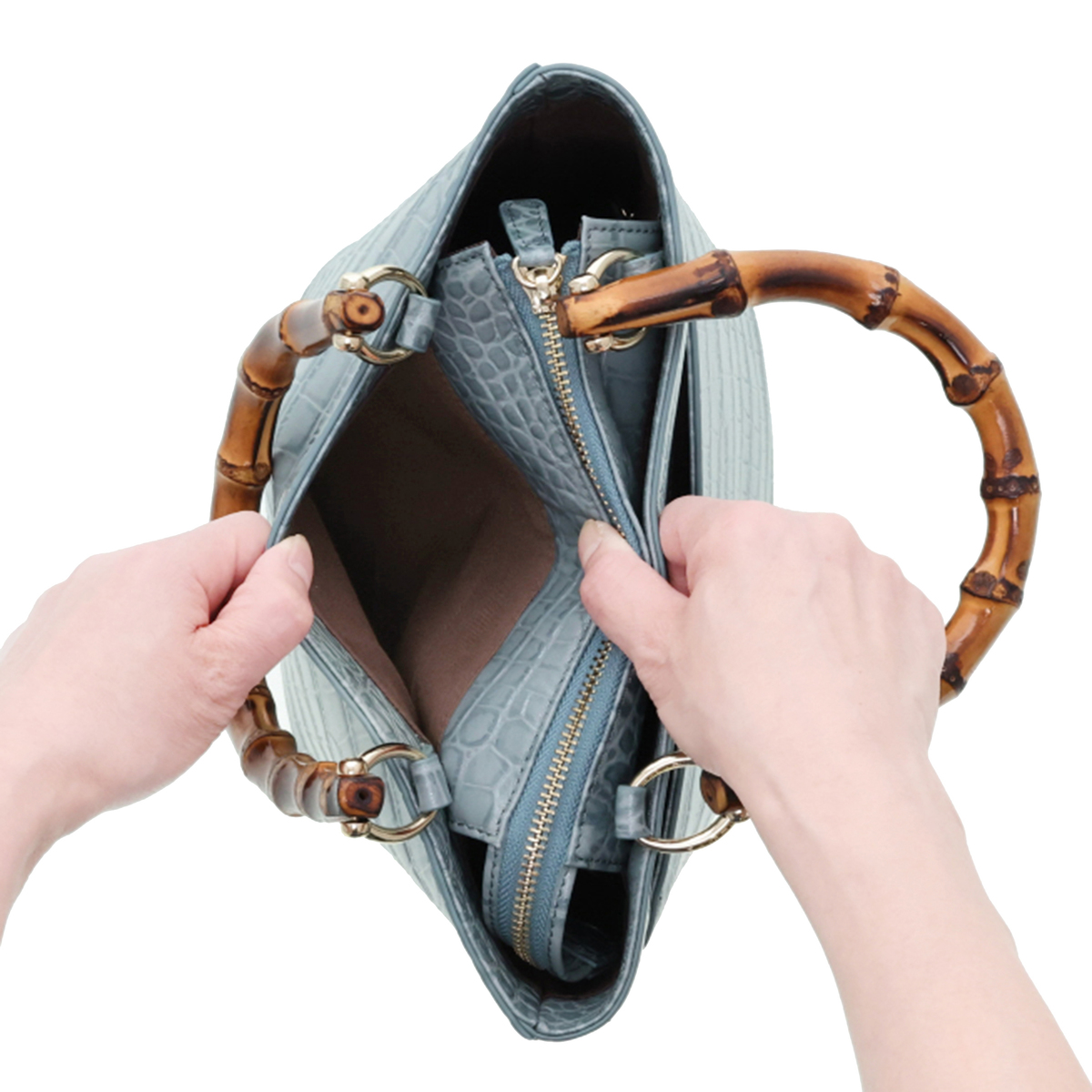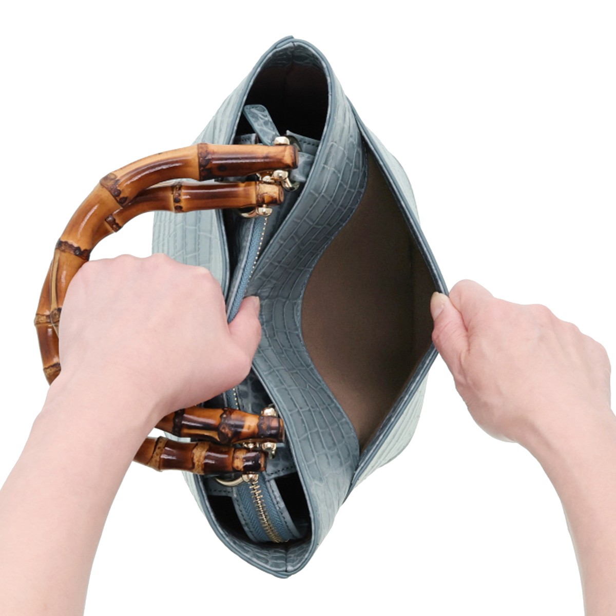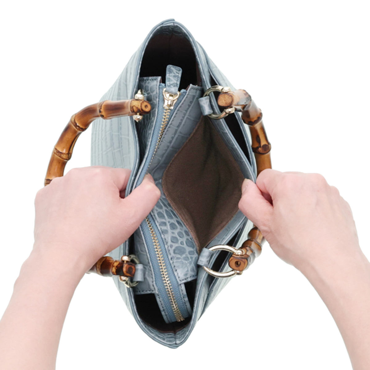 ハンドルのバンブーが特徴に。高さ約22cmで長財布や500mlのペットボトルが縦入れでき、また底マチが約15cmでたっぷり収納可能。内側、外側にはポケットが付き、開口部のサイドにはあおりポケット付きで仕分けも便利に。さらに5段階で長さ調節可能なショルダー付きです