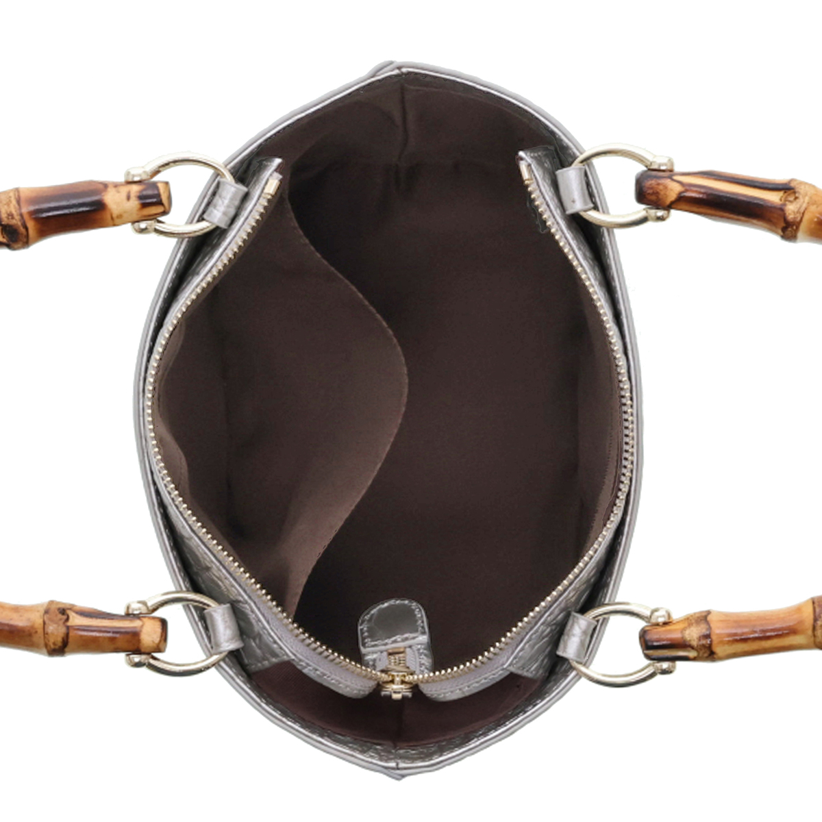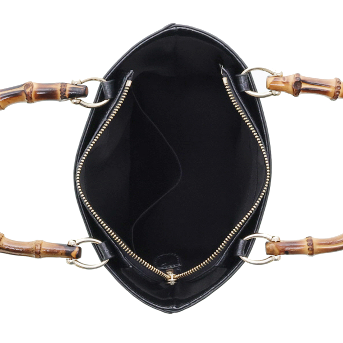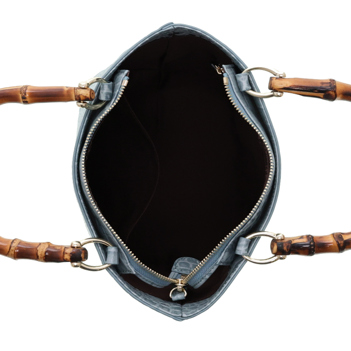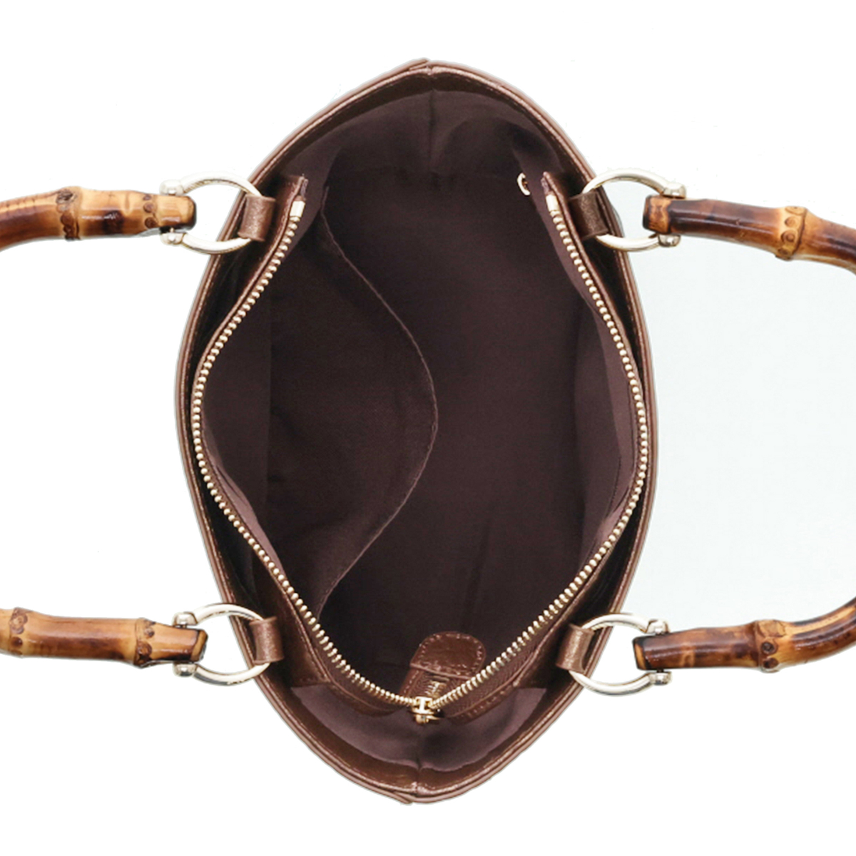 ハンドルのバンブーが特徴に。高さ約22cmで長財布や500mlのペットボトルが縦入れでき、また底マチが約15cmでたっぷり収納可能。内側、外側にはポケットが付き、開口部のサイドにはあおりポケット付きで仕分けも便利に。さらに5段階で長さ調節可能なショルダー付きです