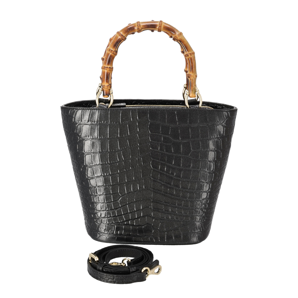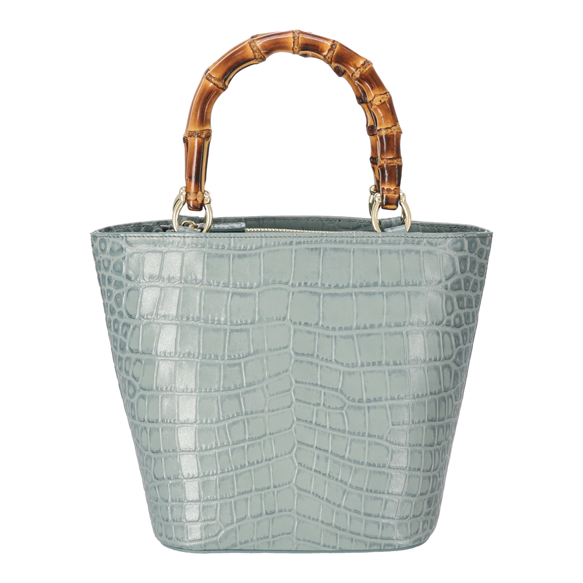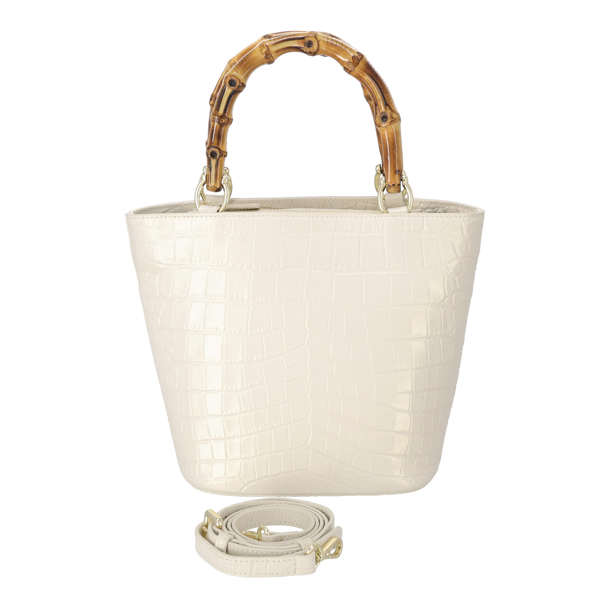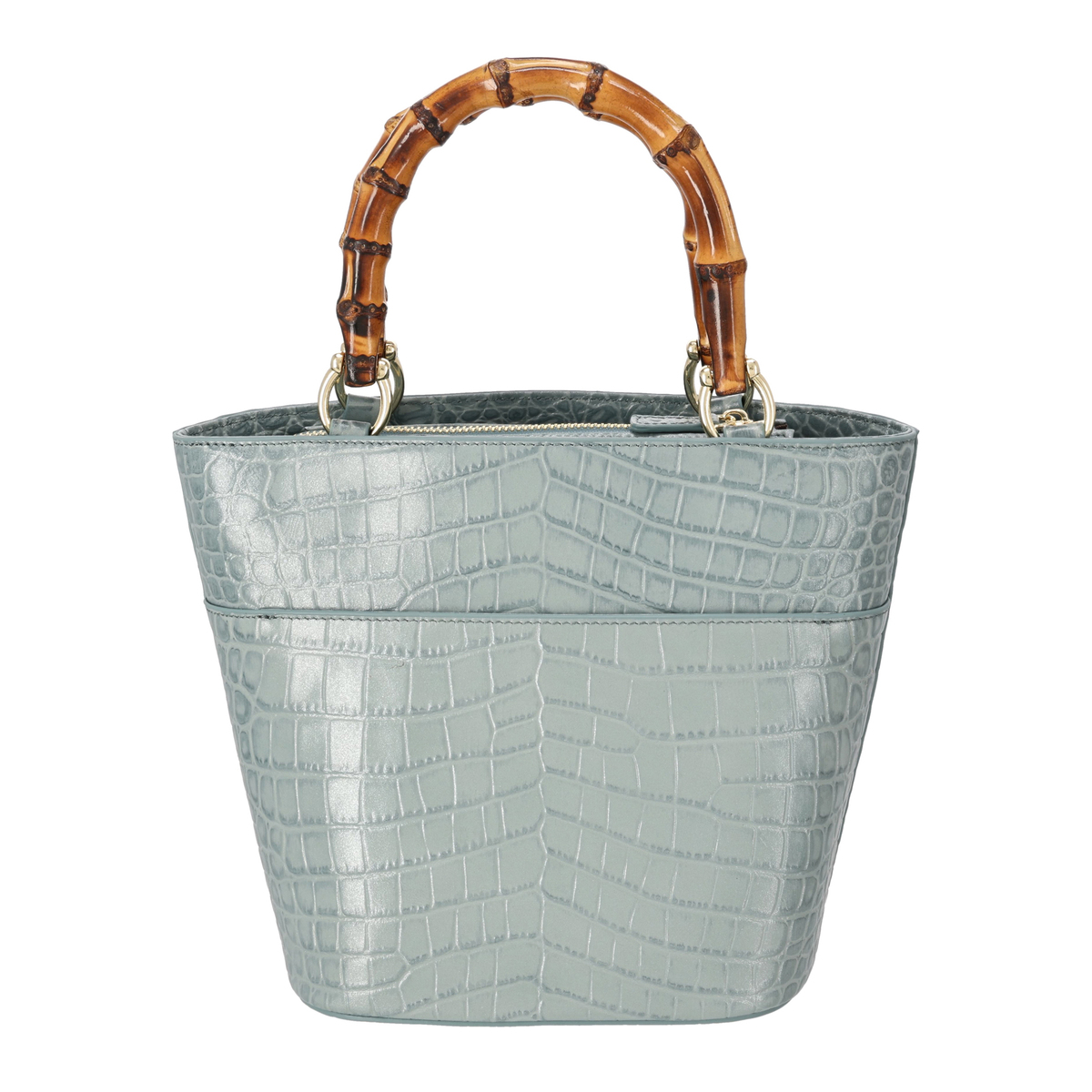 ハンドルのバンブーが特徴に。高さ約22cmで長財布や500mlのペットボトルが縦入れでき、また底マチが約15cmでたっぷり収納可能。内側、外側にはポケットが付き、開口部のサイドにはあおりポケット付きで仕分けも便利に。さらに5段階で長さ調節可能なショルダー付きです