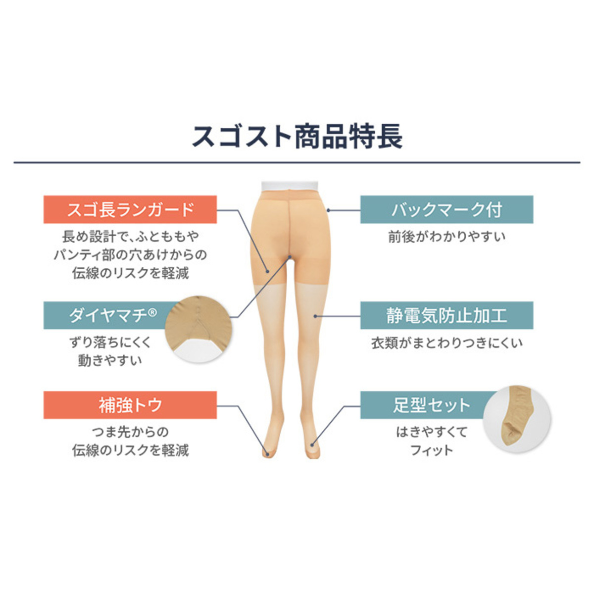 ランガードは長め設計で着脱時の穴開きや伝線などのリスクを軽減。また、衣類がまとわりつきにくい静電気防止加工を施しています