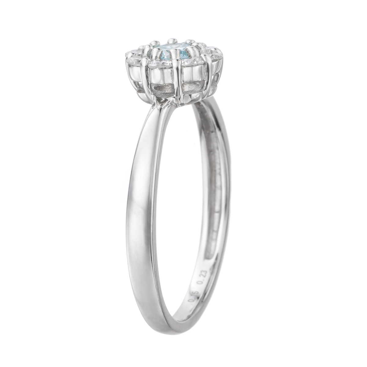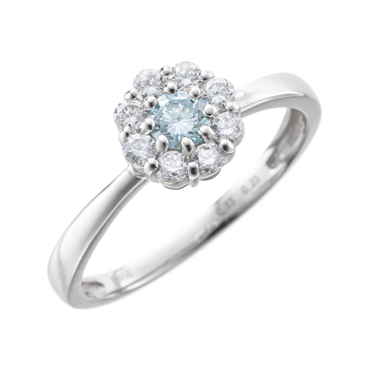 澄んだブルーが静かに煌めくリング。プラチナにセットしたアイスブルーダイヤモンドを中心に、ホワイトダイヤモンドが花びらのように寄り添い、透明感ある輝きを上品に引き立てます。繊細なフラワーモチーフは手元に洗練を添え、日常にも特別な場面にも馴染む佇まい。氷のように透き通ったブルーが、空や水面を思わせる美しさを届けます