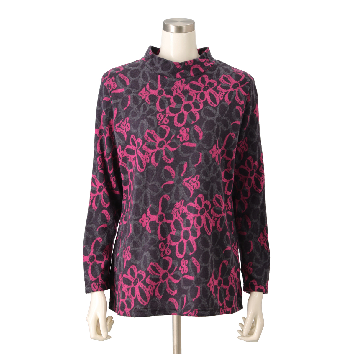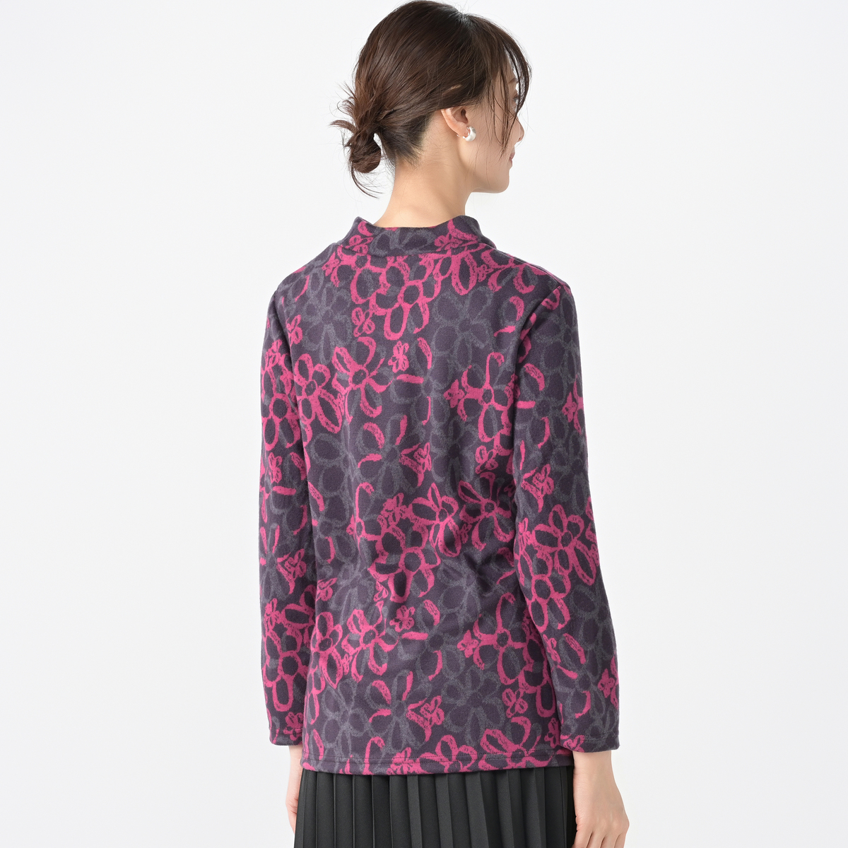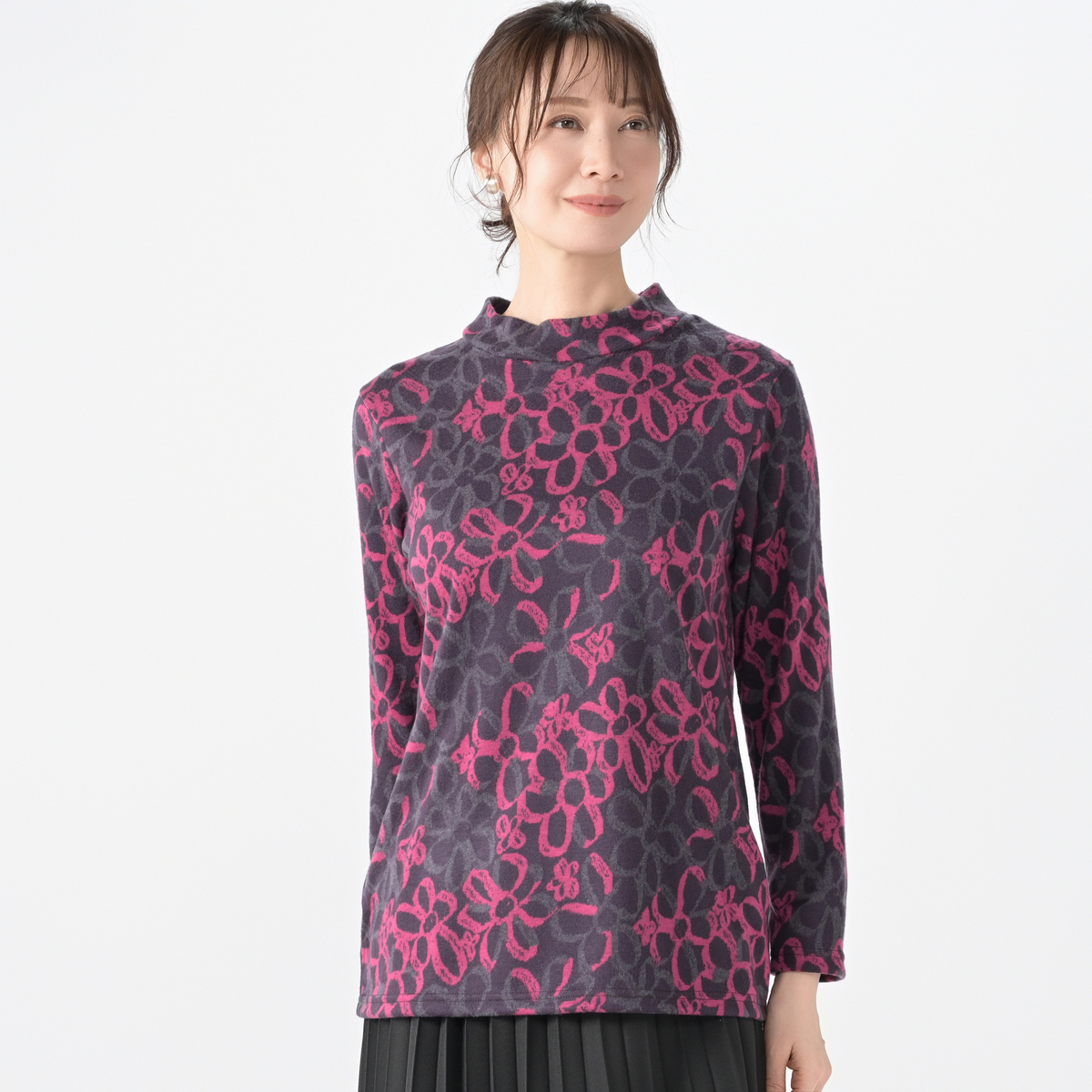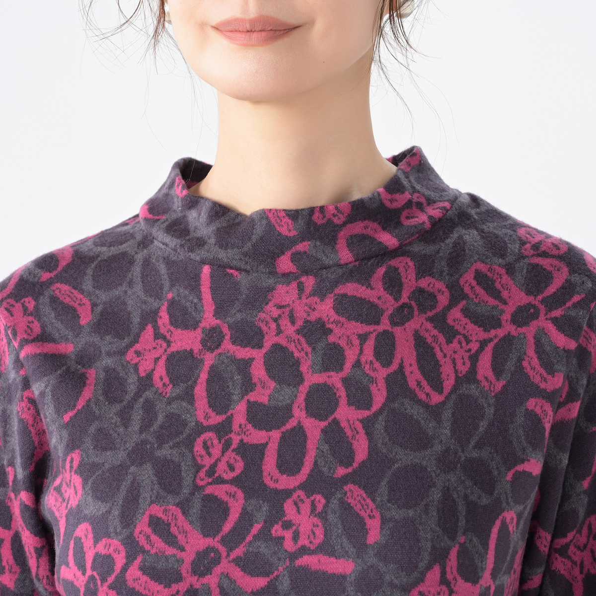 配色を活かした大柄な花モチーフが目を惹くプルオーバー。1枚着としてはもちろん、カーディガンを重ねてもおしゃれに決まります