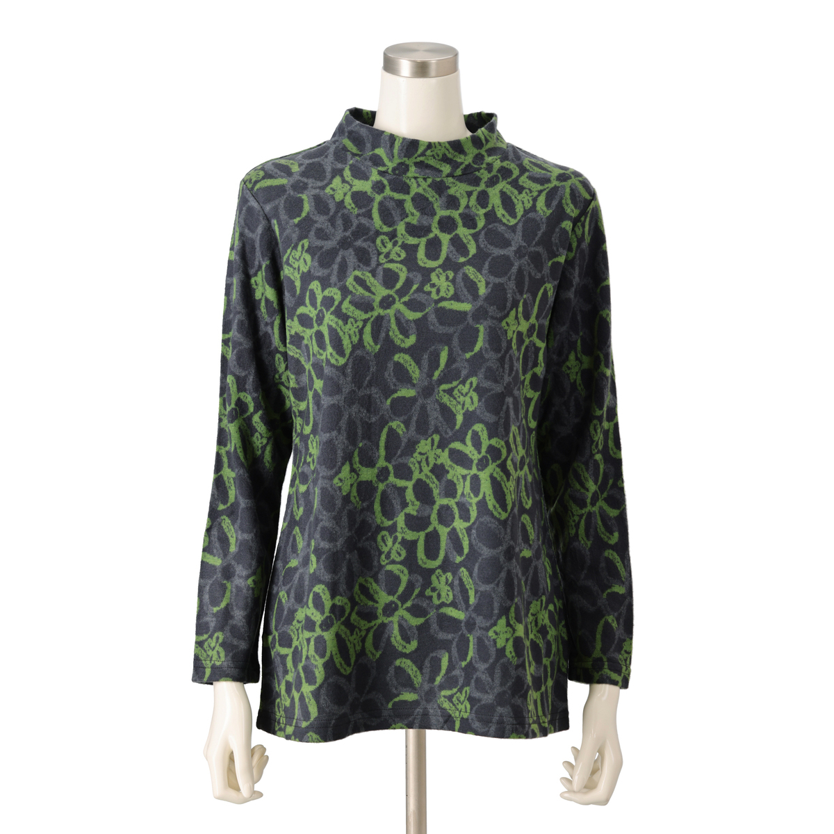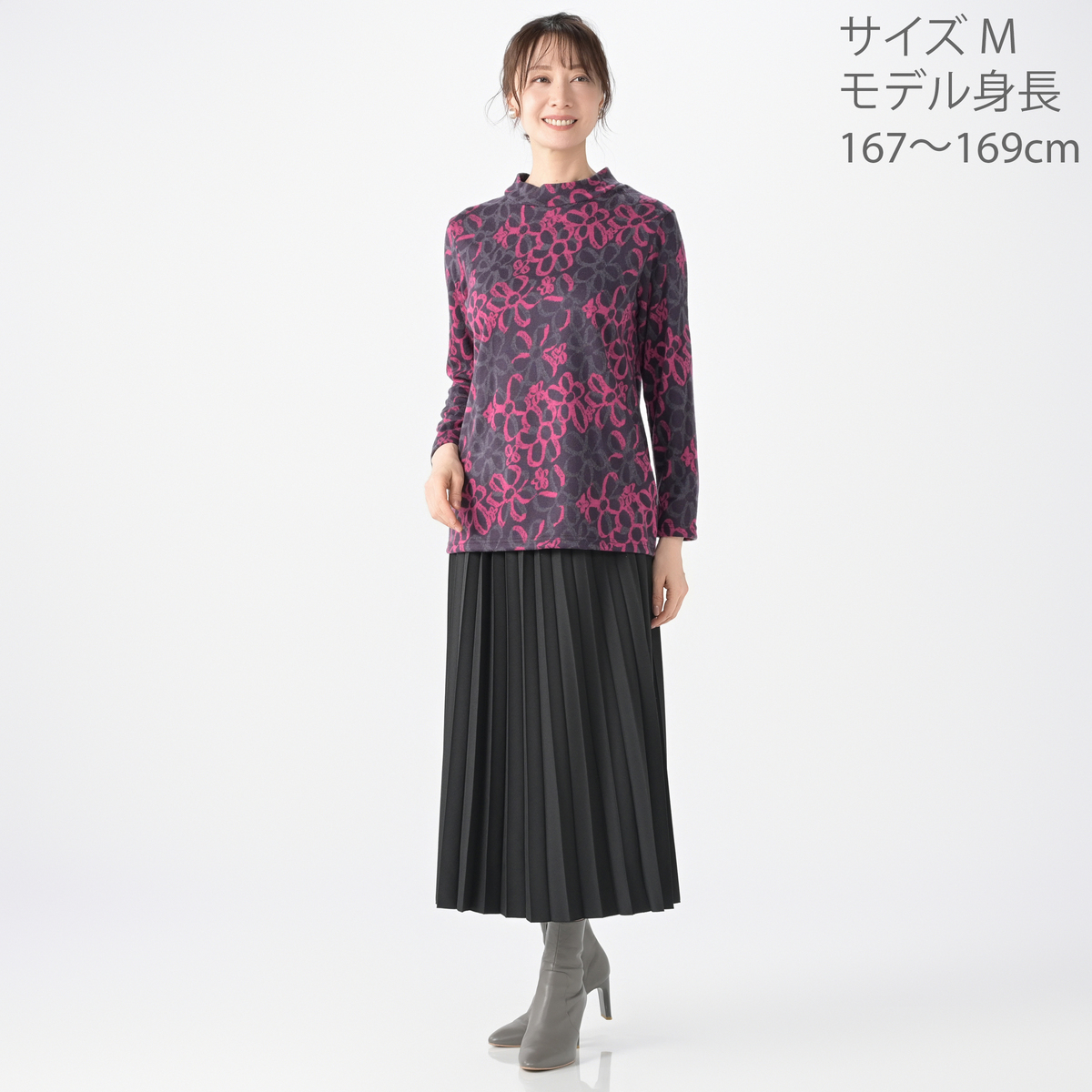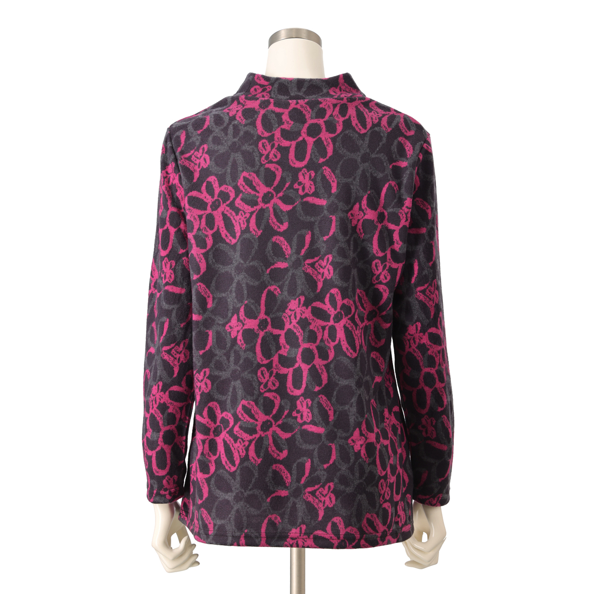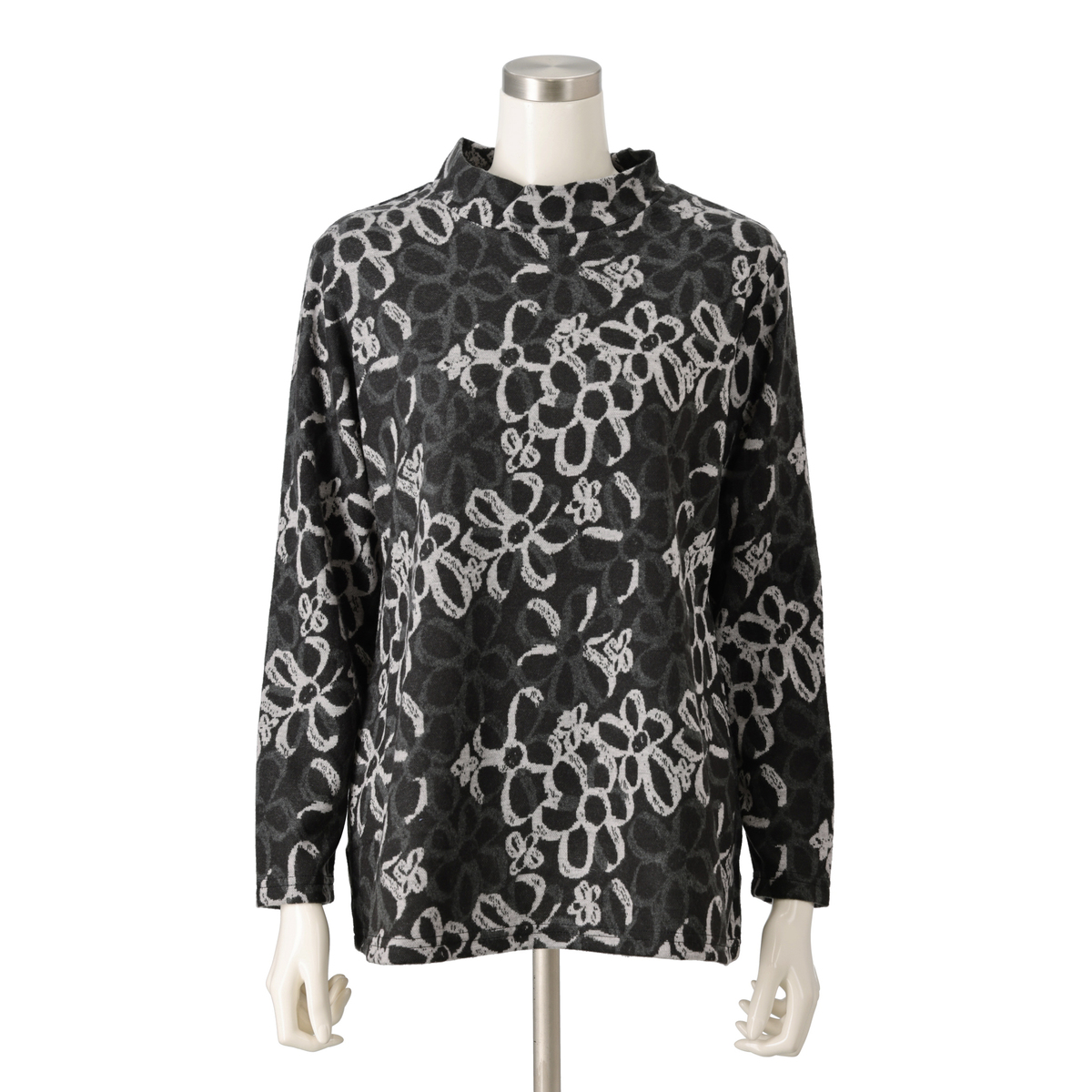 配色を活かした大柄な花モチーフが目を惹くプルオーバー。1枚着としてはもちろん、カーディガンを重ねてもおしゃれに決まります