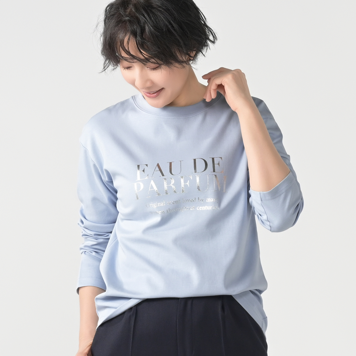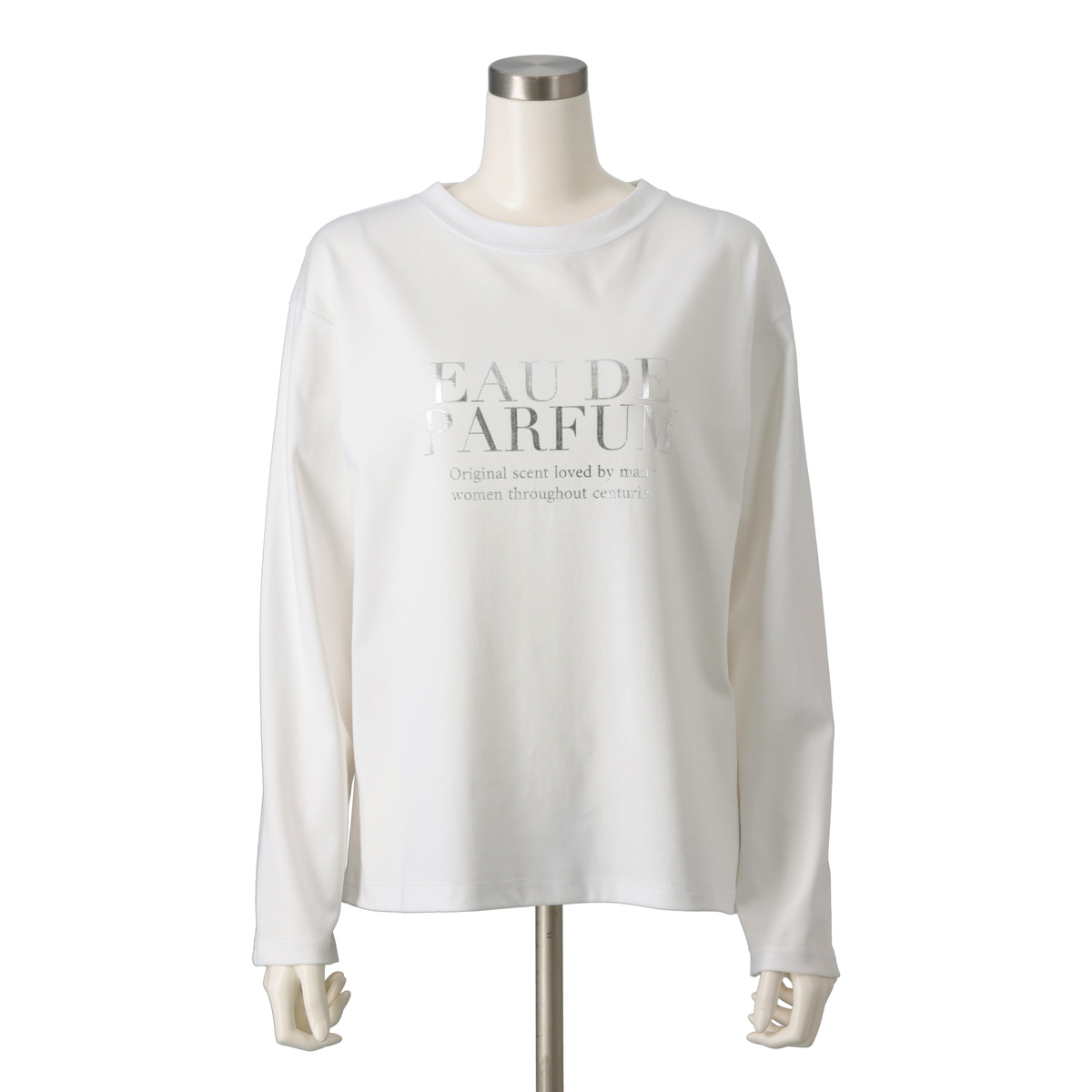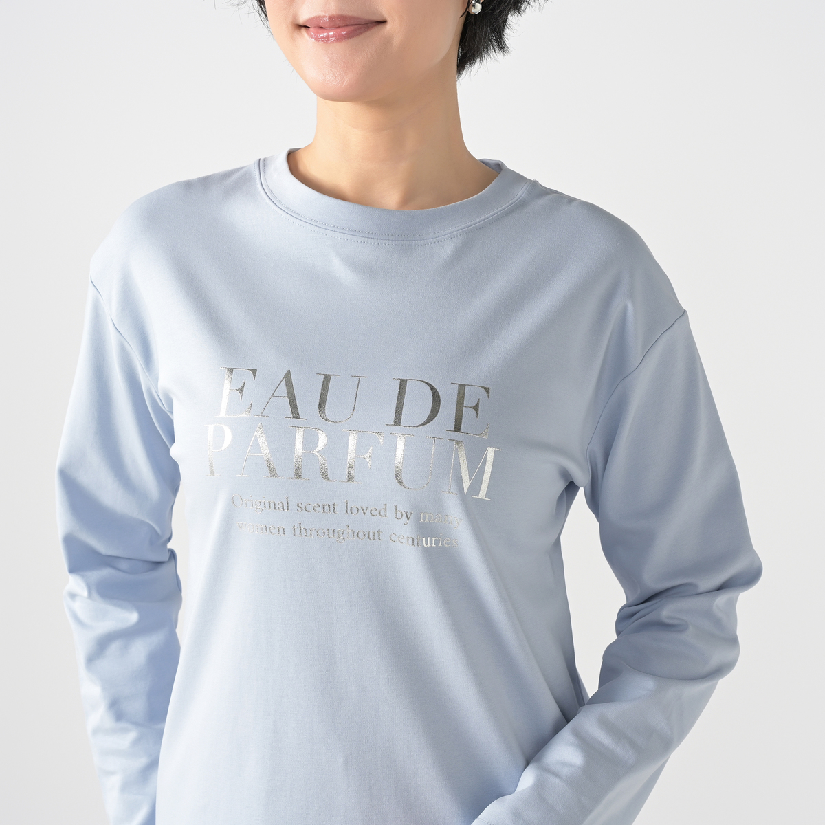 大好評素材のシルキータッチスムース素材を使用した、ロングスリーブプリントTシャツ。華やかなシルバー箔プリントロゴが、大人の洗練された印象を与えます