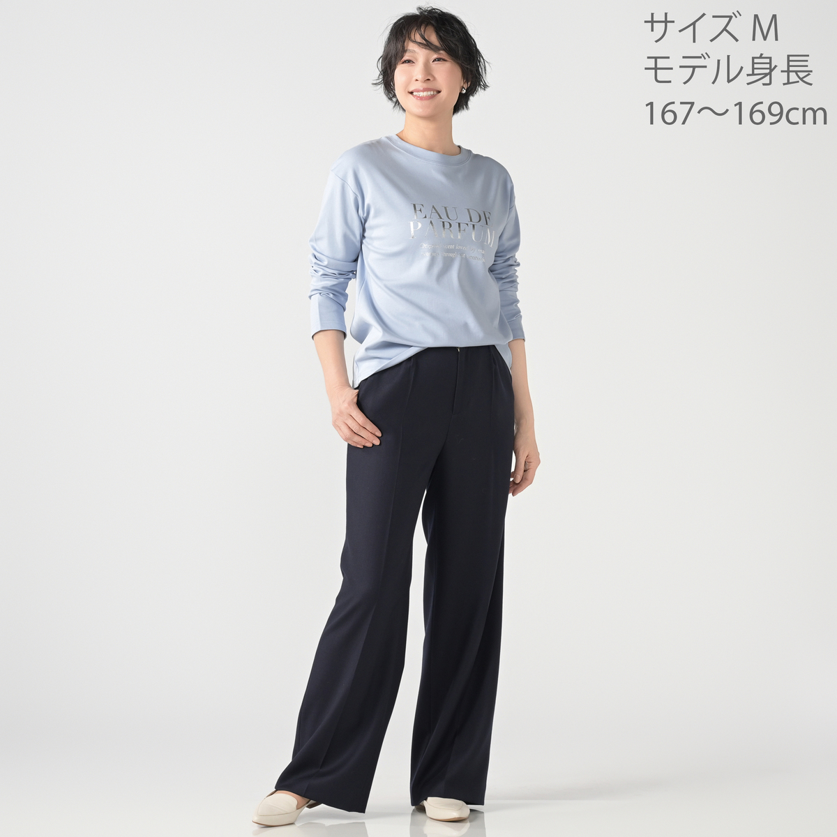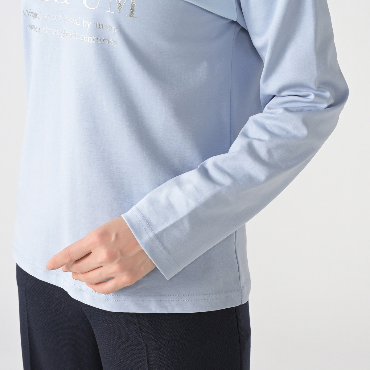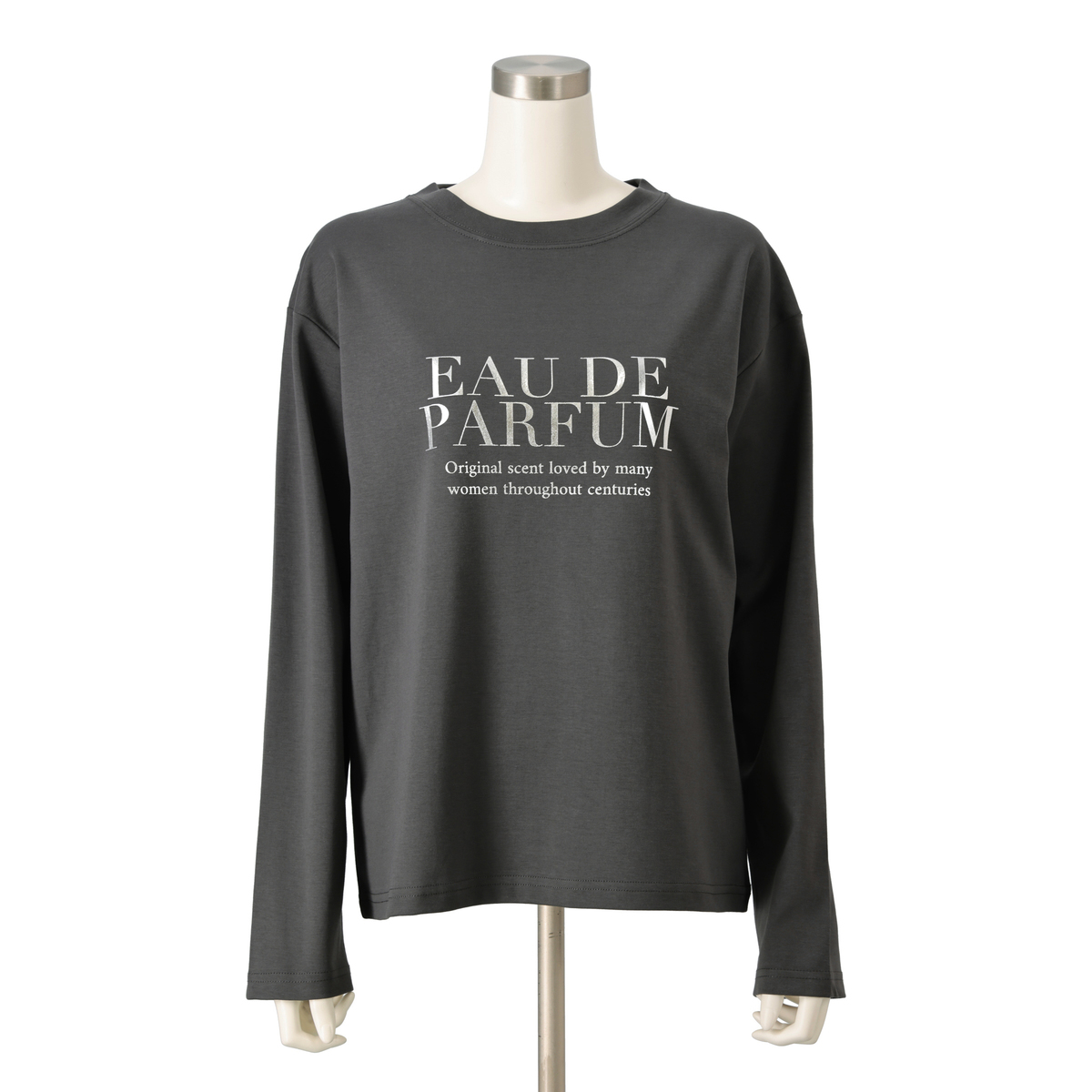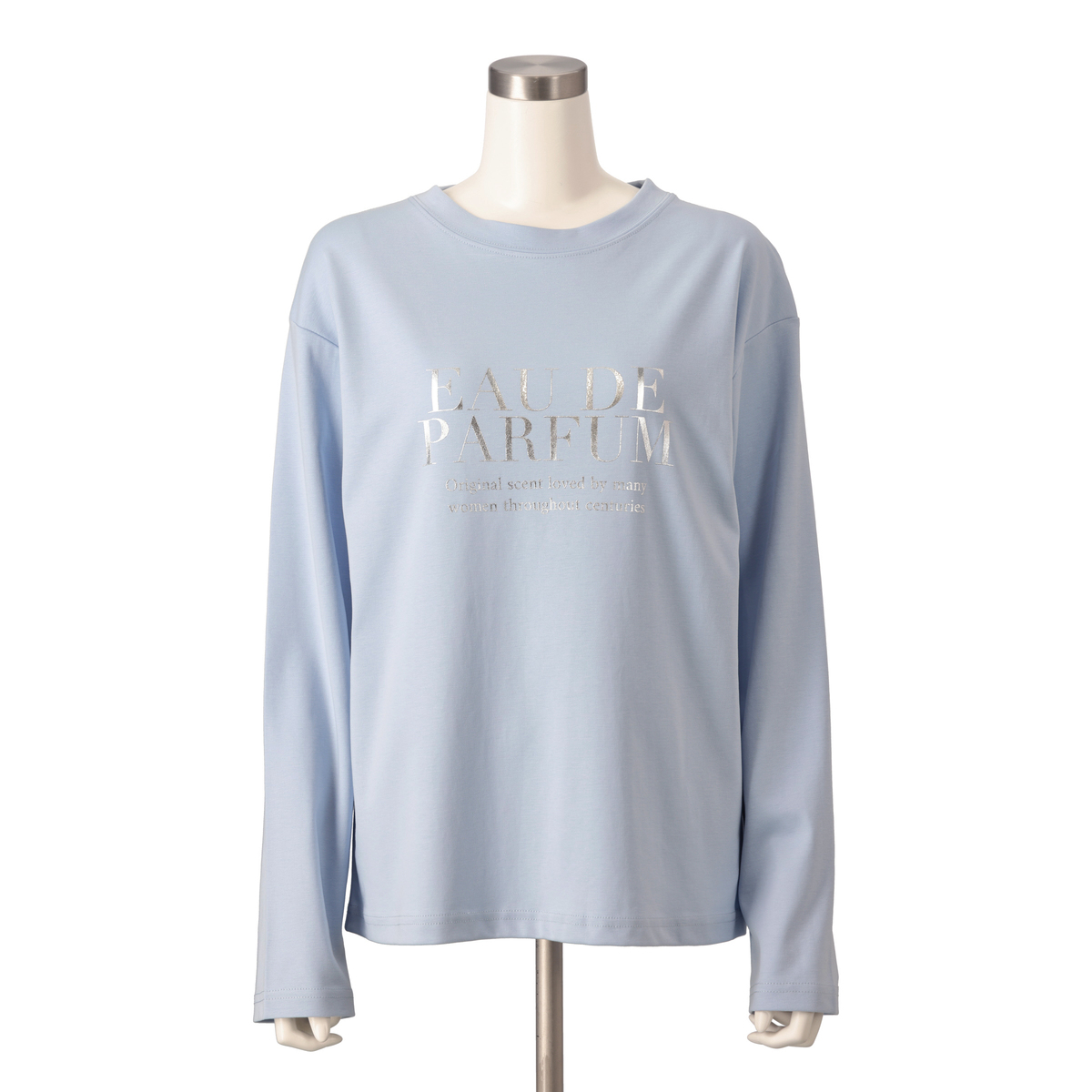 大好評素材のシルキータッチスムース素材を使用した、ロングスリーブプリントTシャツ。華やかなシルバー箔プリントロゴが、大人の洗練された印象を与えます