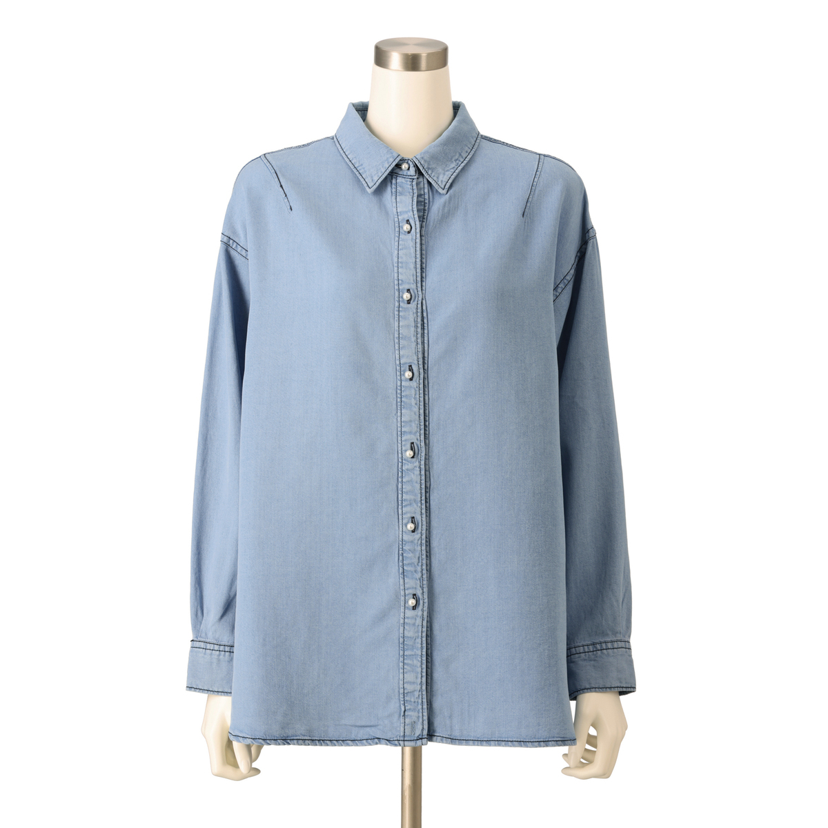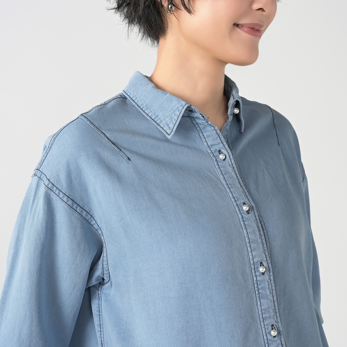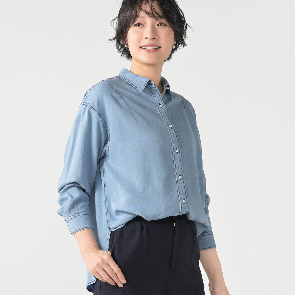 ゆったりしたシルエットのデニムシャツ。丸みのあるパール調ボタンが上品なアクセントになっています