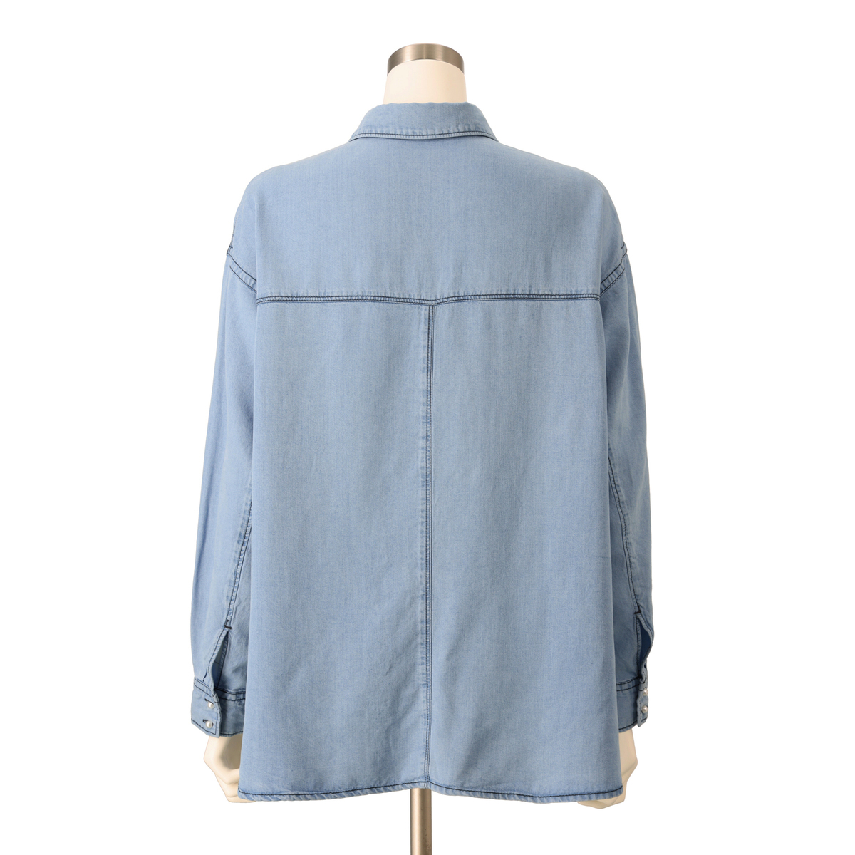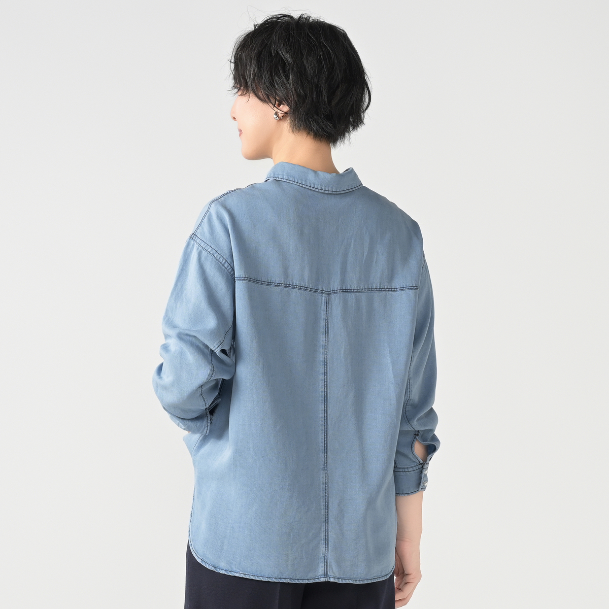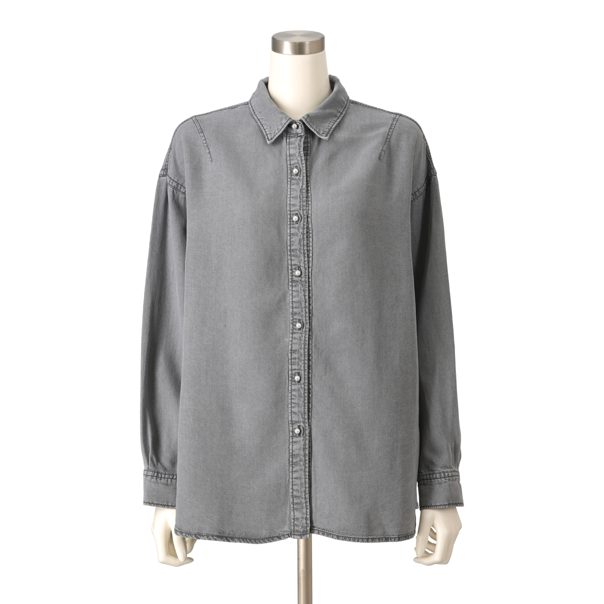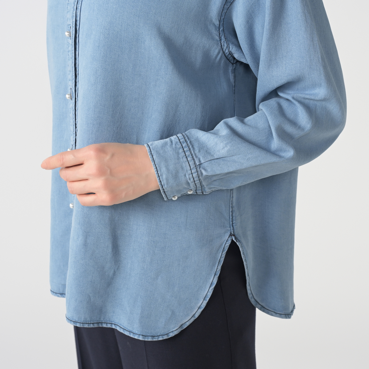 ゆったりしたシルエットのデニムシャツ。丸みのあるパール調ボタンが上品なアクセントになっています