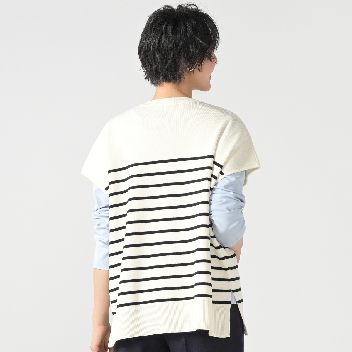 インナーにはタンクトップやキャミソールはもちろん、Tシャツとのレイヤードも素敵。ベーシックでシンプルなので、キレイめにもカジュアルにも着回し力抜群な重宝するアイテムです