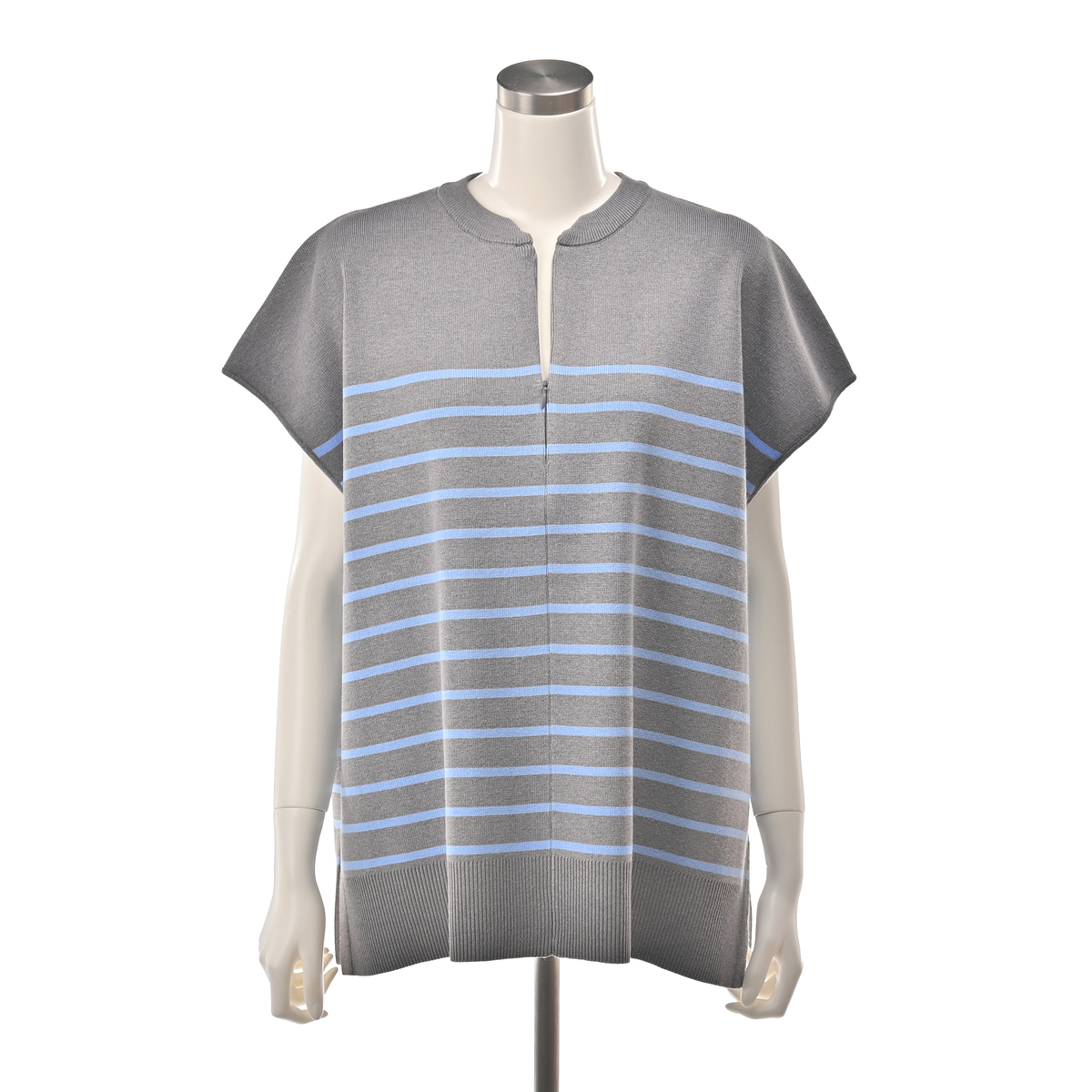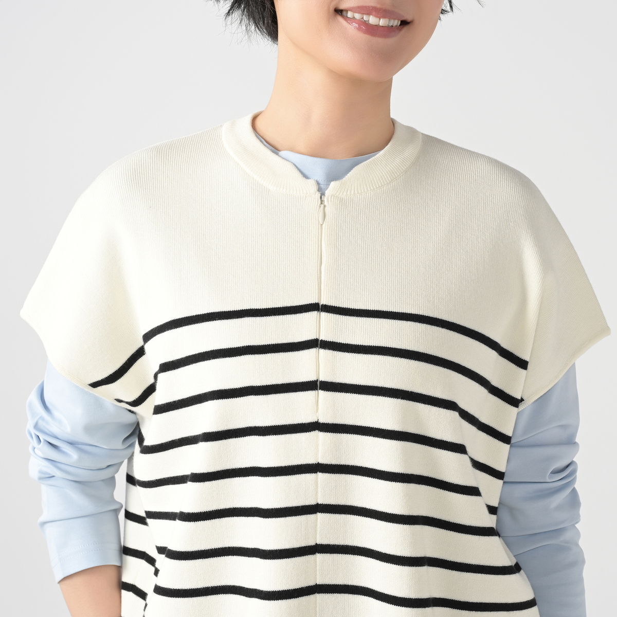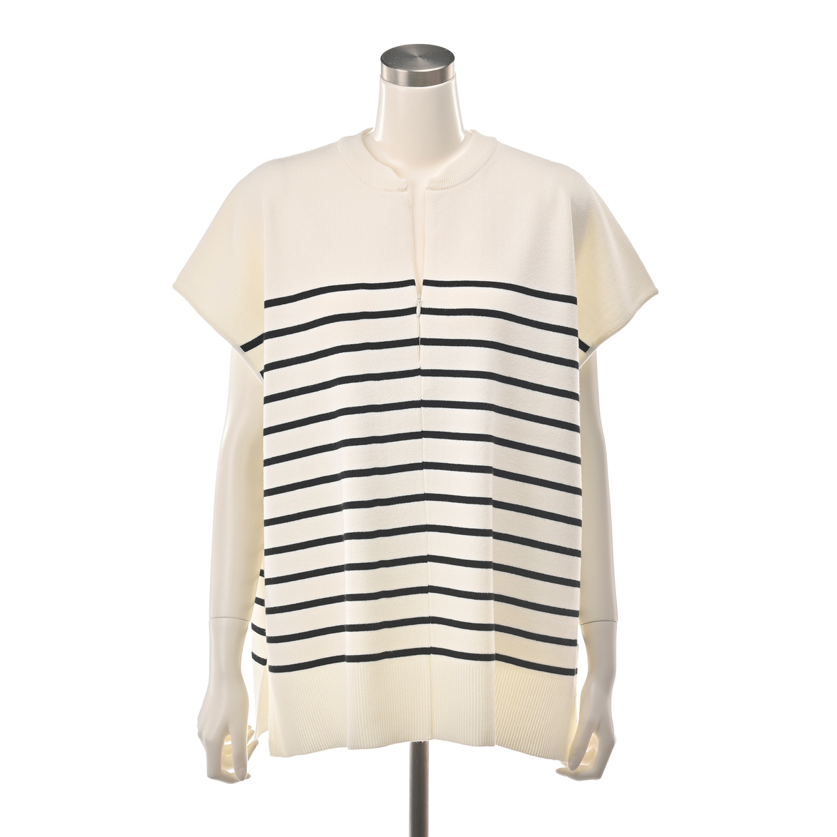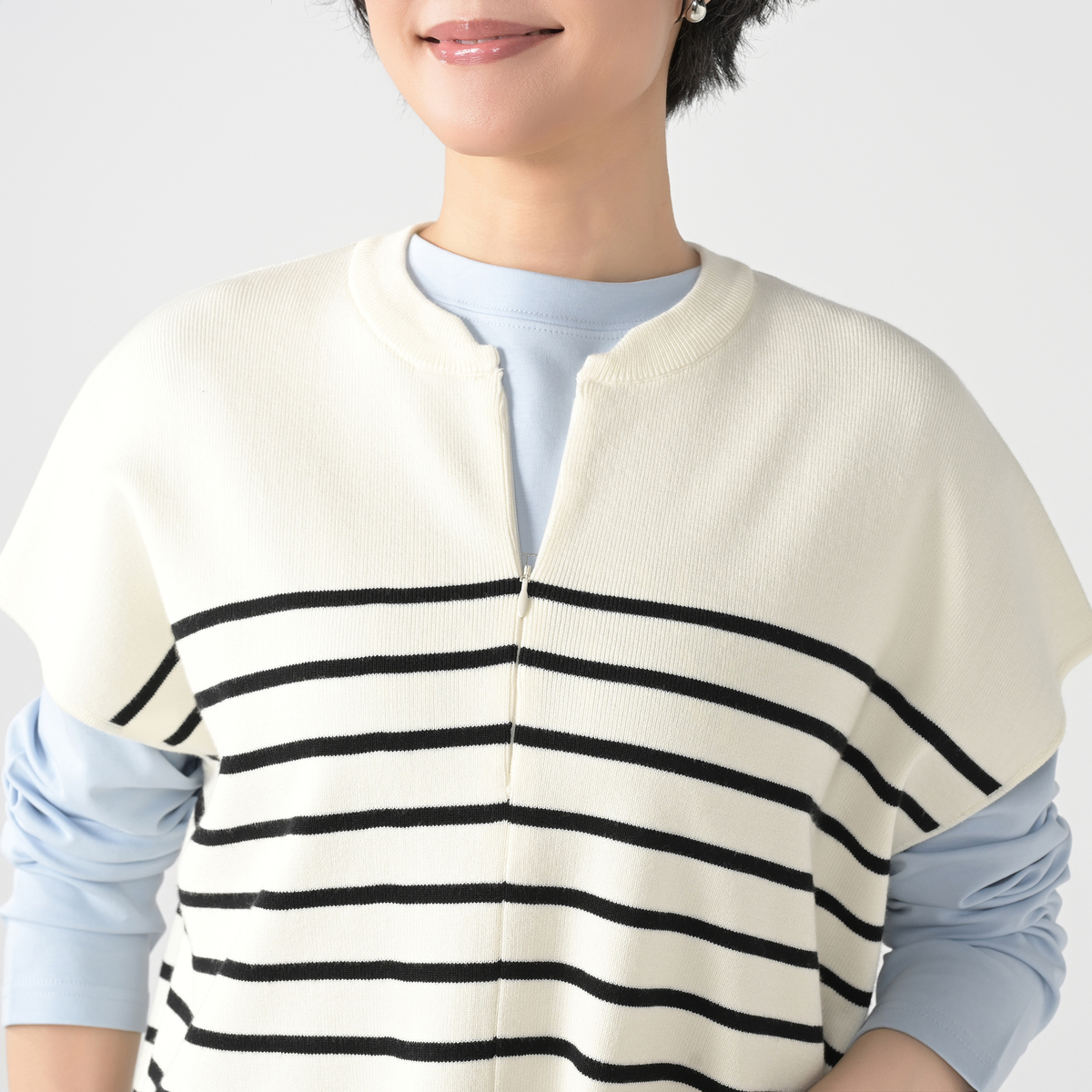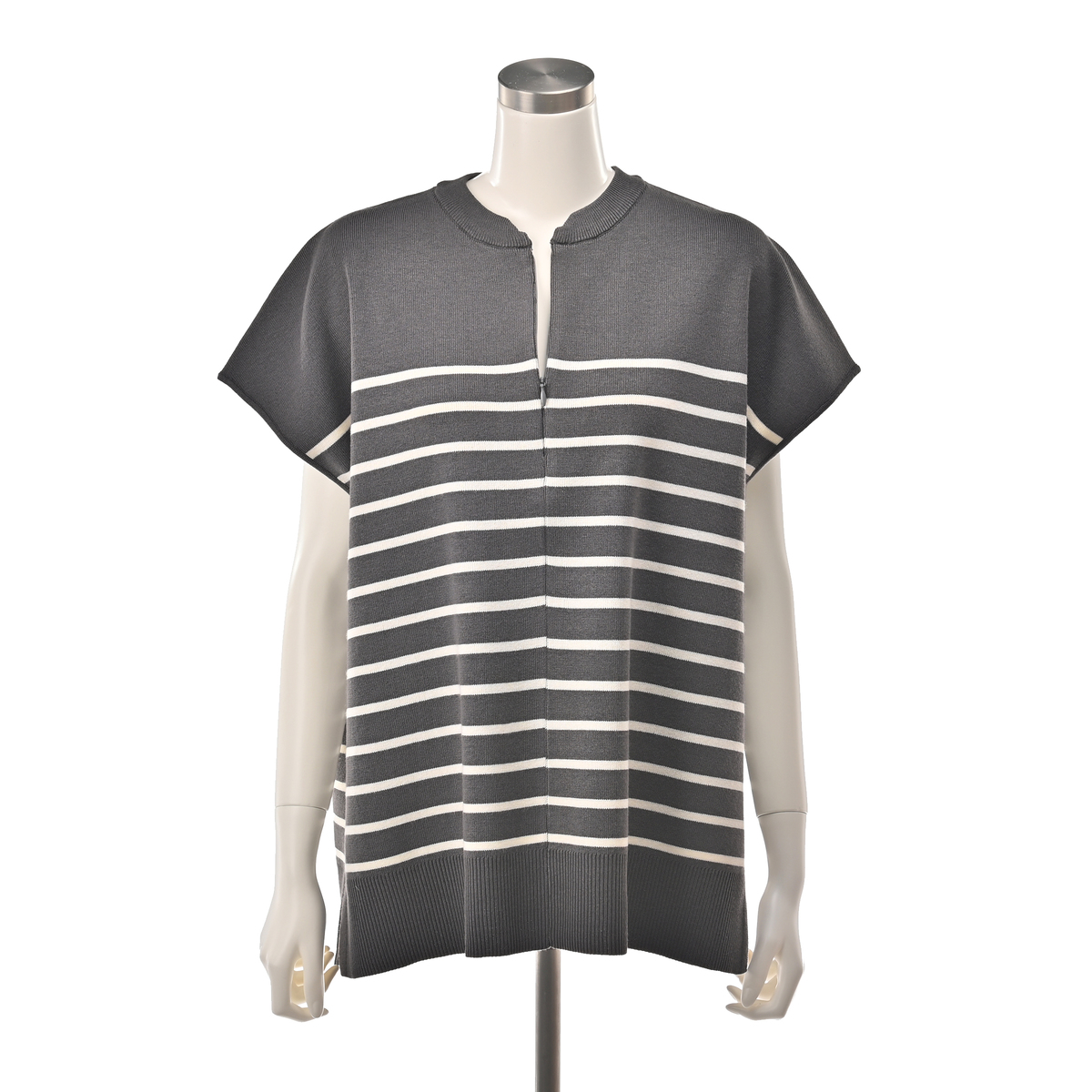 ニットで仕立てた、スウェットライクなキーネックトップス。表面はフラットな編み地で、ほどよい上品さがあります。フロントファスナーを開けると抜けのあるキーネックに変わり、装いの印象を調整しやすいデザイン。ゆったりとしたシルエットで体のラインを拾いにくく、幅広い組合せに寄り添う一枚です