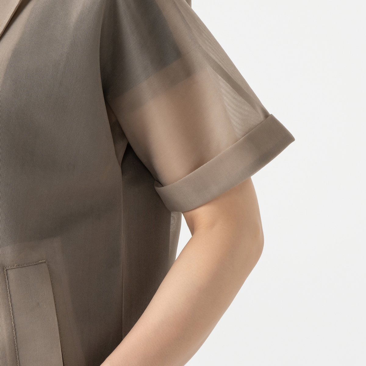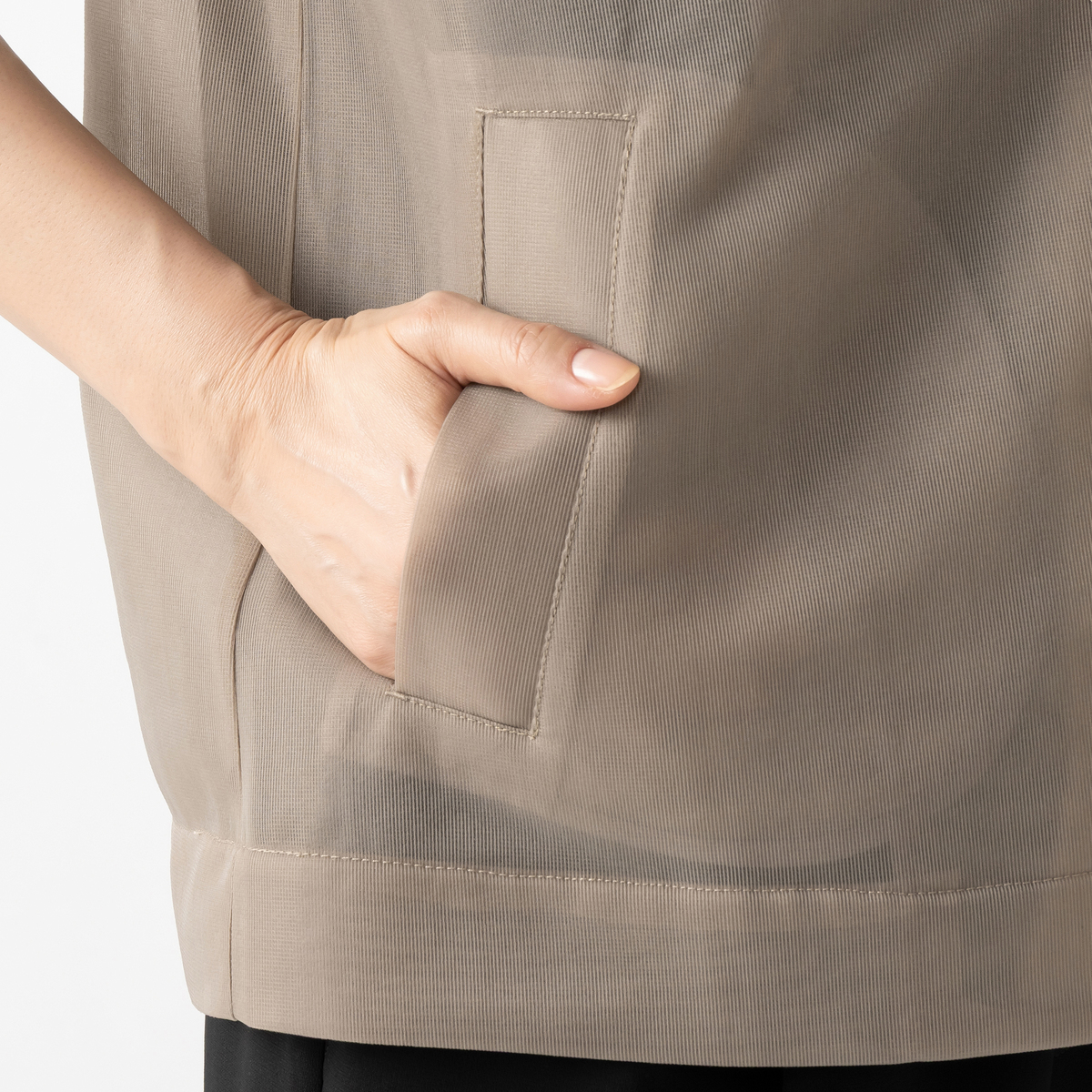 チュールならではの軽やかな透け感がありながら、透けすぎない絶妙なバランス。ボンディング加工による程よいハリで、型崩れしにくくヨレにくい仕様。身体のラインを拾いにくく、きちんと感がありながらラクに着られます