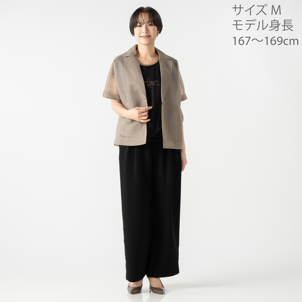 Iラインで縦を強調した半袖テーラージャケット。細く仕上げたテーラー衿が顔まわりを引き締め、縦ラインを自然に意識。後ろ衿ぐりとベンツには落ち着いた配色を施しています。ポケット付きで実用性にも配慮しています