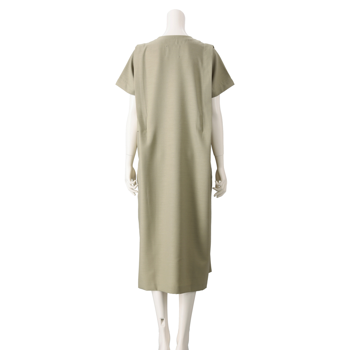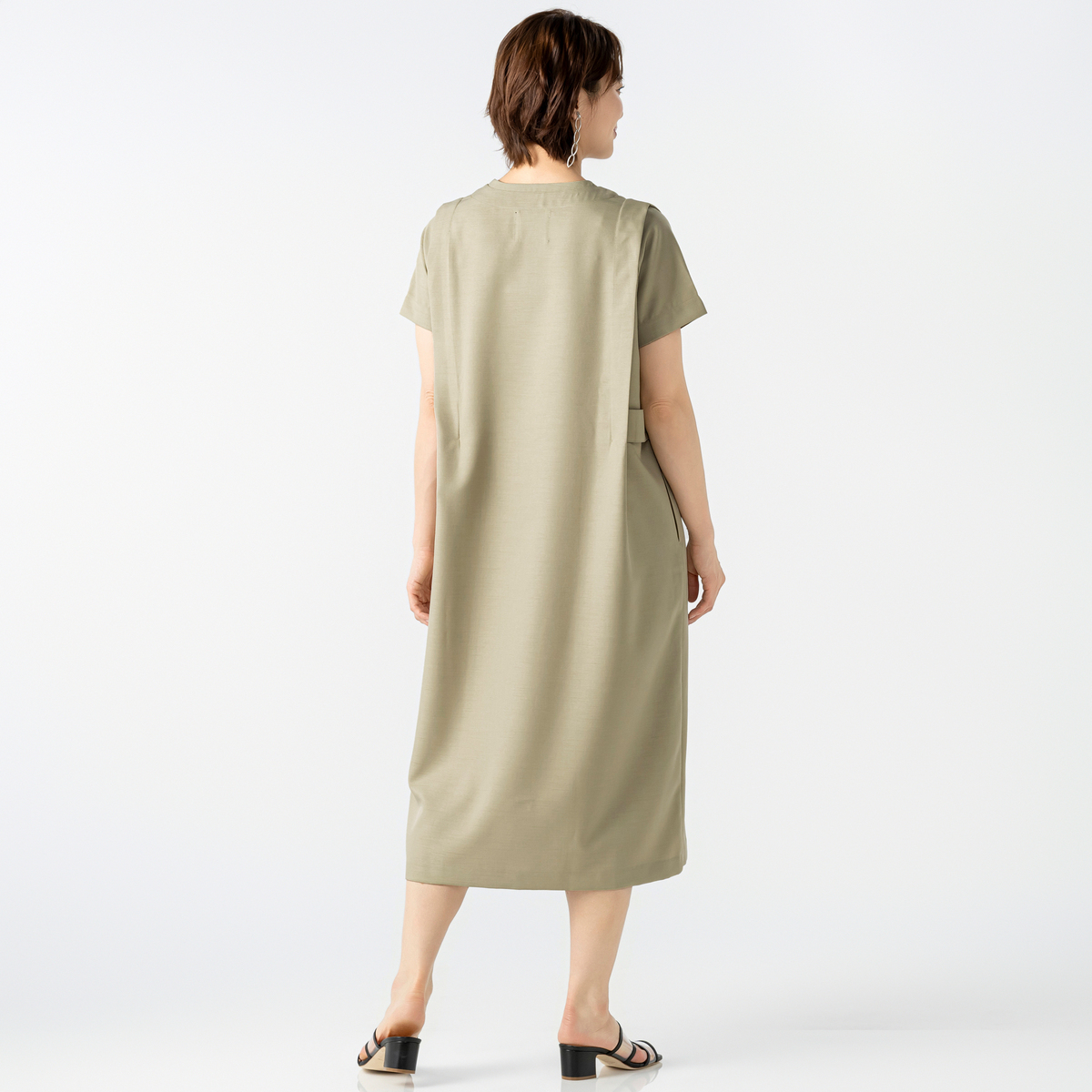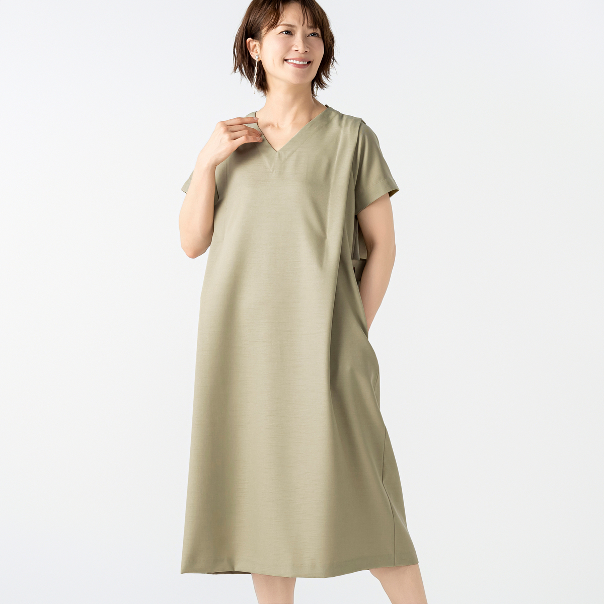 程よい厚みとハリ感のある布帛素材が、身体のラインを拾いにくく、すとんと落ちる縦ラインを演出するワンピース。肩のタックが立体感と陰影を加え、エレガントで知的な印象を引き出します