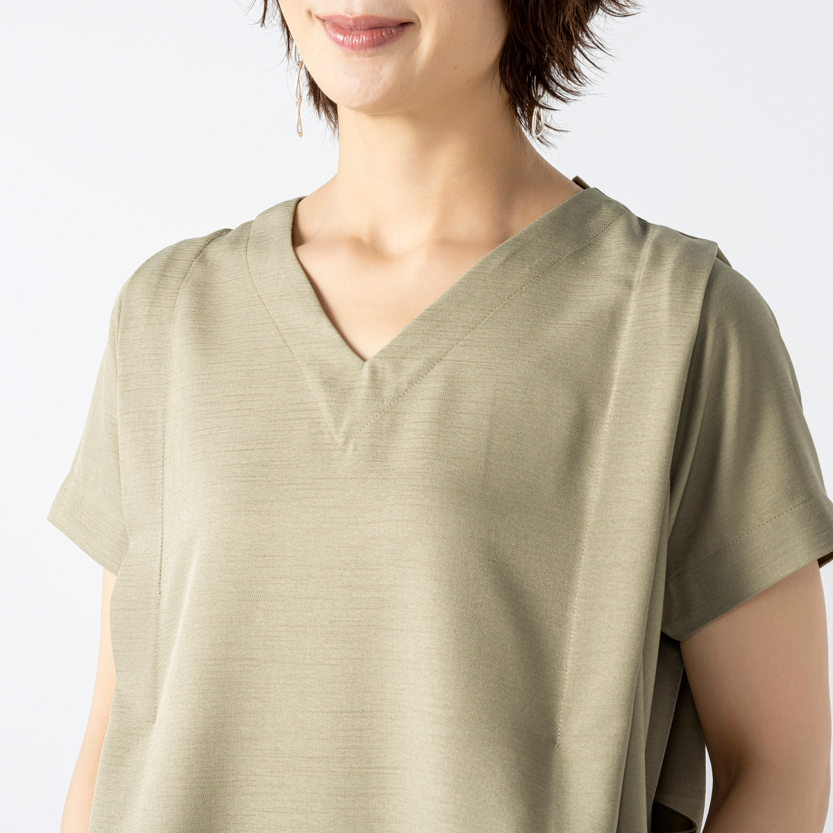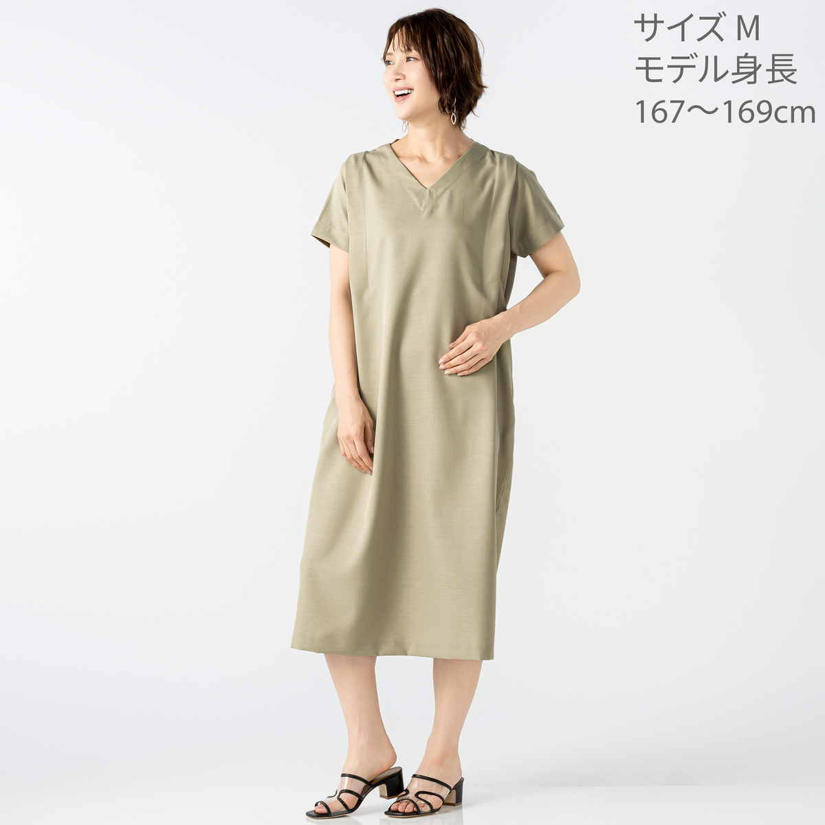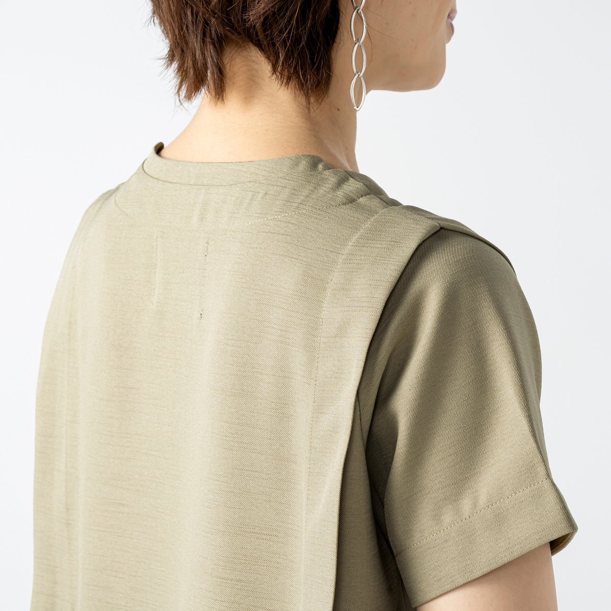程よい厚みとハリ感のある布帛素材が、身体のラインを拾いにくく、すとんと落ちる縦ラインを演出するワンピース。肩のタックが立体感と陰影を加え、エレガントで知的な印象を引き出します