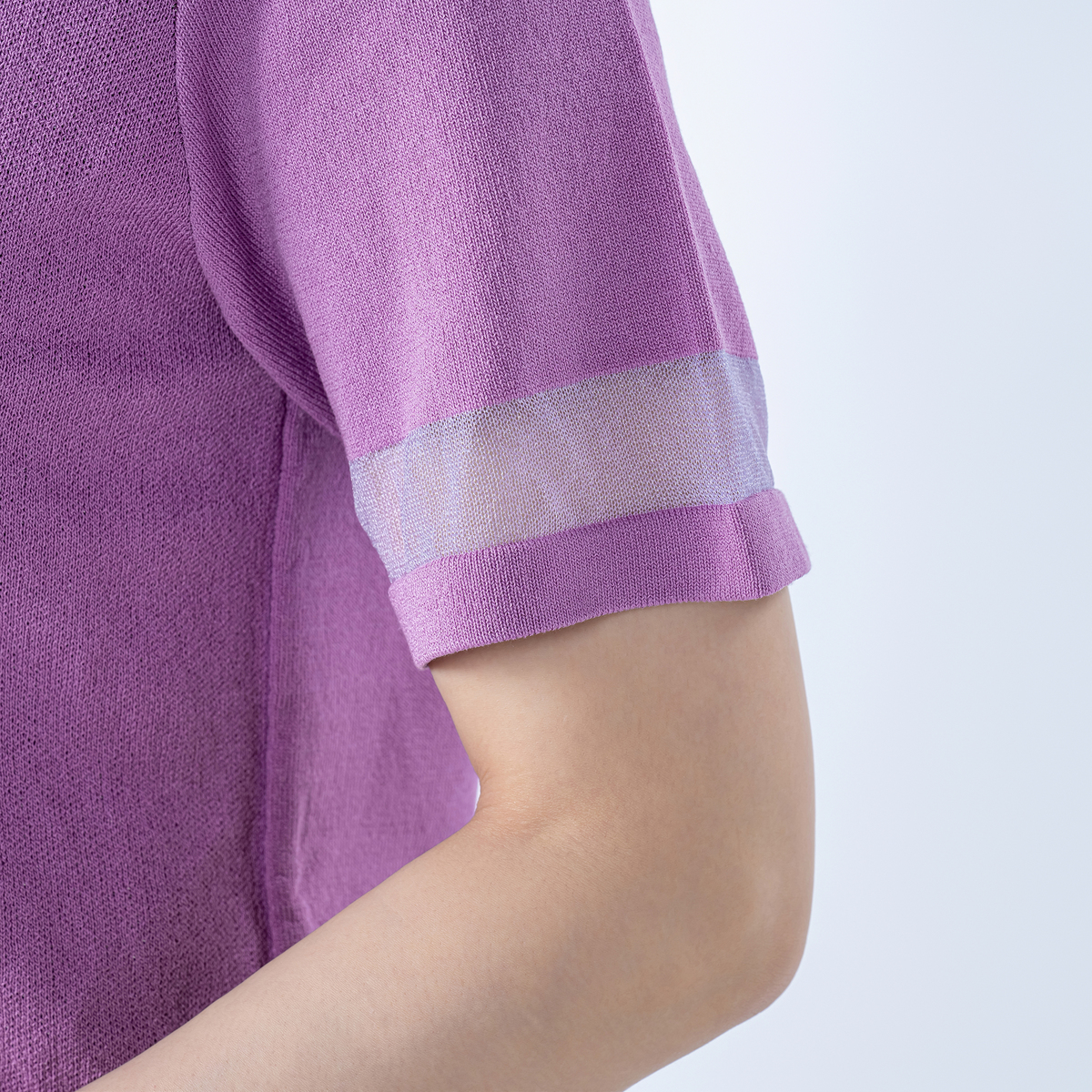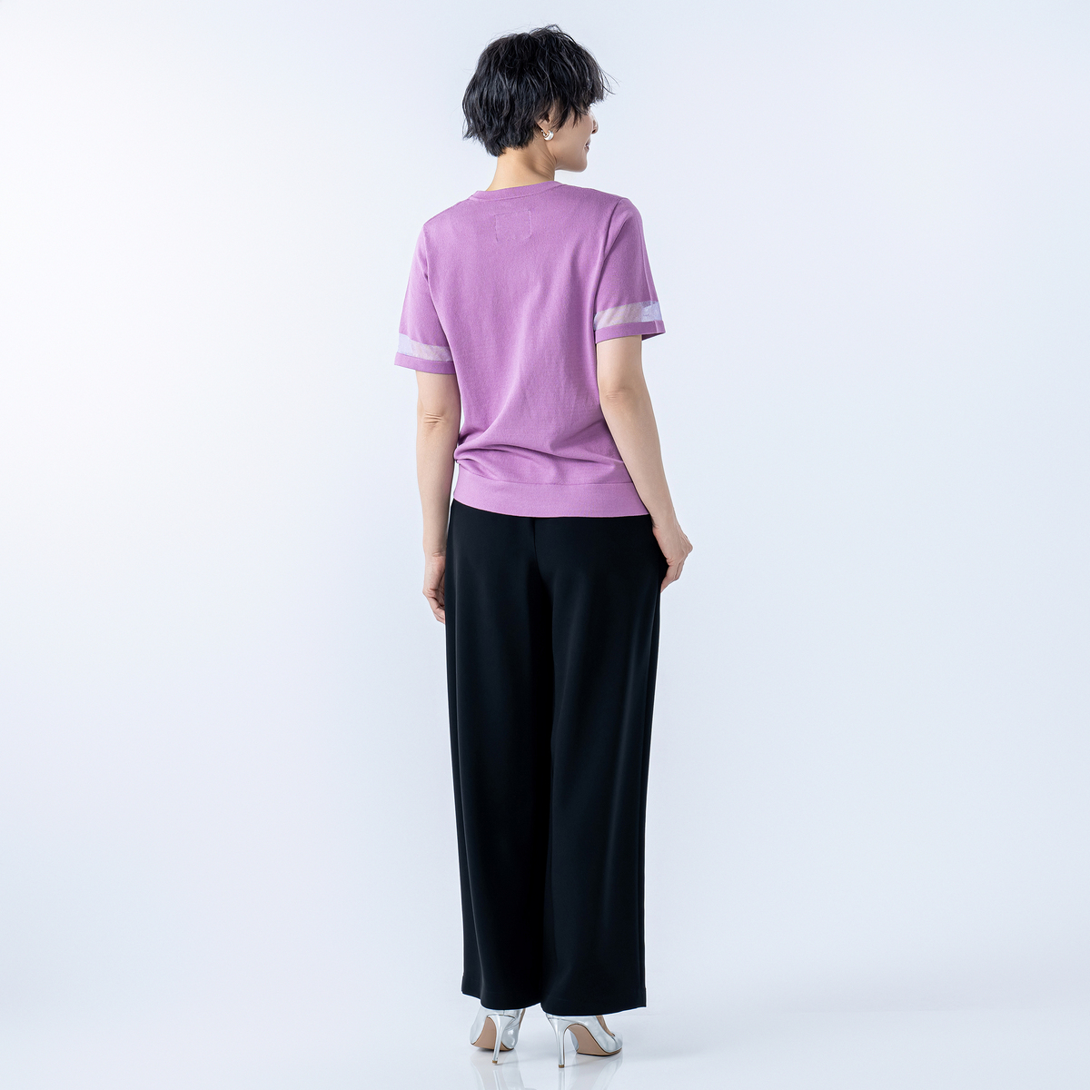 適度にハリ感のあるニット素材を使用。さらっとした肌触りで伸縮性もあり、自宅でお洗濯も可能。全体的に織り込まれたラメ糸がさりげなく煌めき、上品な印象で着こなせます