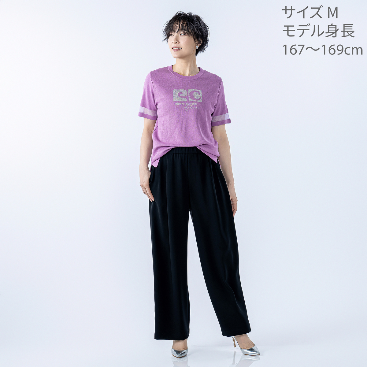 [商品寸法(ヌード)cm] サイズ バスト 着丈 S : 92(72〜80) 58 M : 96(79〜87) 58 L : 101(86〜94) 59 LL : 106(93〜101) 60 3L : 114(100〜108) 61 サイズ 肩幅 袖丈 S : 34 23 M : 35 23 L : 37 23 LL : 40 23 3L : 44 23 [素材] レーヨン45%、ポリエステル40%、ナイロン15% [お手入れ] 洗濯機洗い可 [注意事項] ※商品寸法の誤差は多少発生します。ご了承下さい ※蛍光増白剤入り洗剤を使用しないでください ※もみ洗いはお避けください ※洗濯後はすぐに脱水し、形を整えて干してください。長時間、水につけたままにしないでください ※洗濯の際は裏返しにし、洗濯ネットを使用してください ※生地組織の特性上、糸の浮いている部分があります。引っ掛かりにご注意ください ※デリケートな素材を使用していますので、爪やアクセサリーなどの引っ掛かりによりキズがつきやすくなっております。縫目や生地を強く引っ張らないようご注意ください ※素材の特性上、着用や洗濯・クリーニング時の摩擦により毛羽立ち、毛玉が発生します。その際はお早めに毛玉取り器等でお手入れしてください ※染色の性質上、洗濯すると色落ちする事があります。また着用中の摩擦により他の衣料やバッグ、椅子等に色移りすることがあります。淡色や白物と組み合わせでの着用や洗濯はお避けください ※雨や汗等で濡れた状態で着用すると色移りすることがあります。濡れた場合はお早めに洗濯をしてください ※過度な引っ張りを受けると縫い目が開くことがありますので、お取り扱いにはご注意ください ※洗濯後は重ね置きしないでください ※アイロンの際は、あて布をご使用ください ※繊維の特性上、着用条件により繊維の先端が肌を刺激することがありますので、ご注意ください ※ドライクリーニング後にビニール袋へ入れたまま保管したり、2種類以上の防虫剤を併用したりすると、スリット糸(ラメ糸)部分の変色の原因となることがありますのでお避けください 【中国製】
