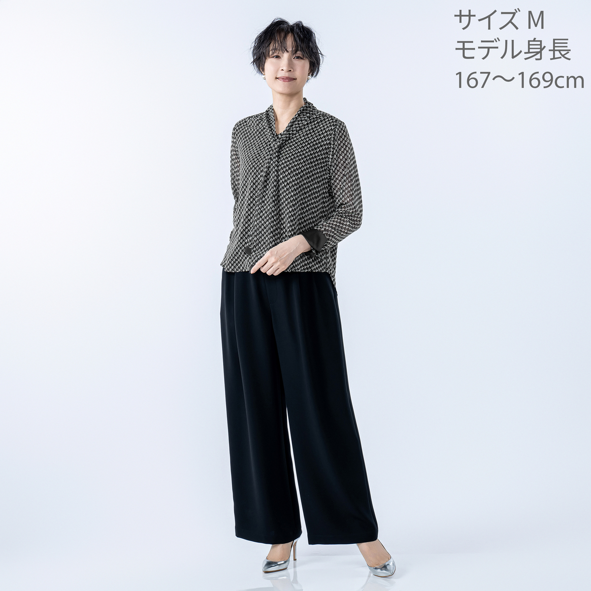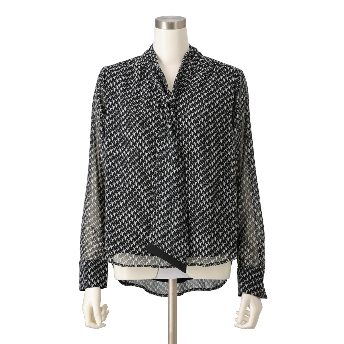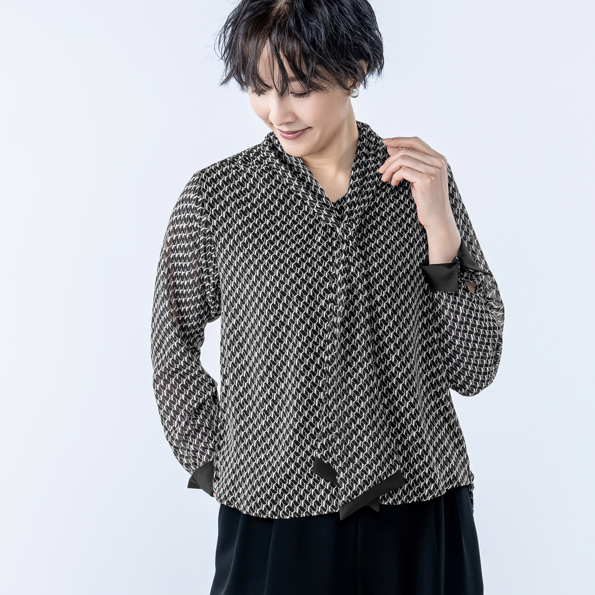 軽やかで落ち感のあるシフォンジョーゼットを使用した、バイヤスジオメトリック柄のボウタイブラウス。素材の落ち感ですっきり見え、肩や二の腕も気になりにくいシルエットで上品な印象を与えます