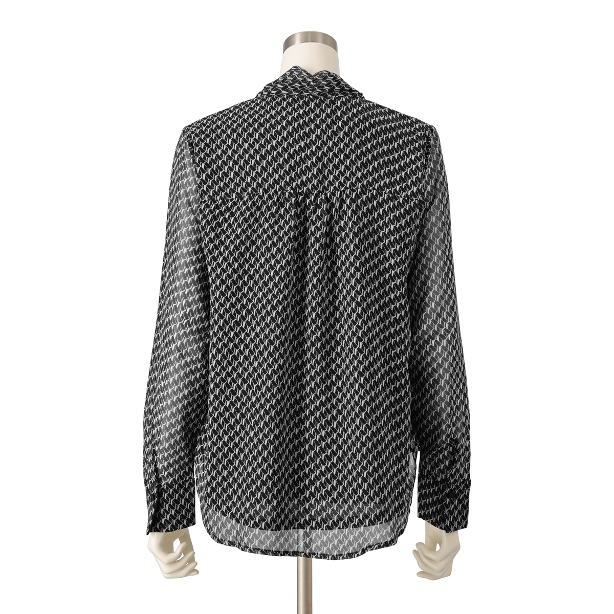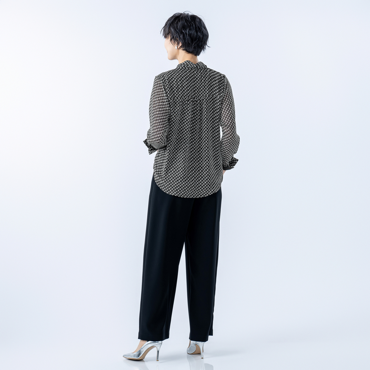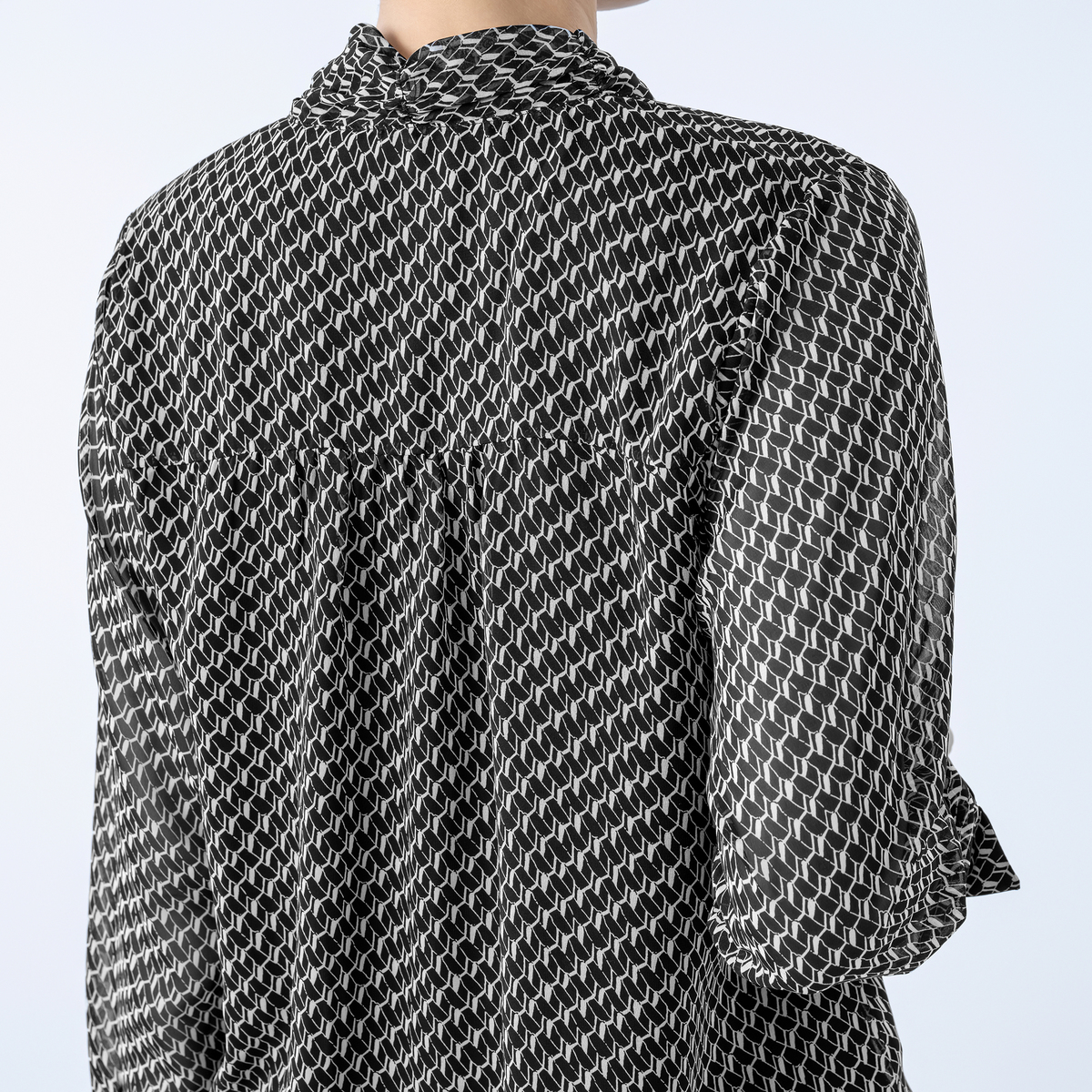 軽やかで落ち感のあるシフォンジョーゼットを使用した、バイヤスジオメトリック柄のボウタイブラウス。素材の落ち感ですっきり見え、肩や二の腕も気になりにくいシルエットで上品な印象を与えます