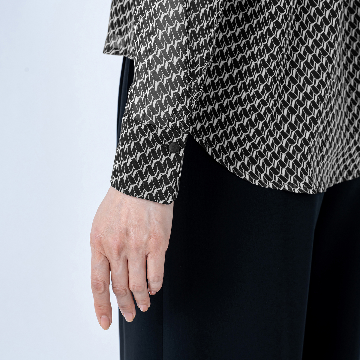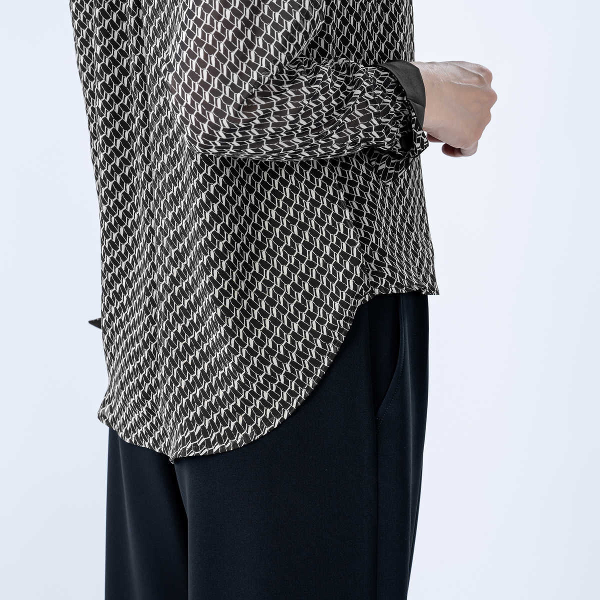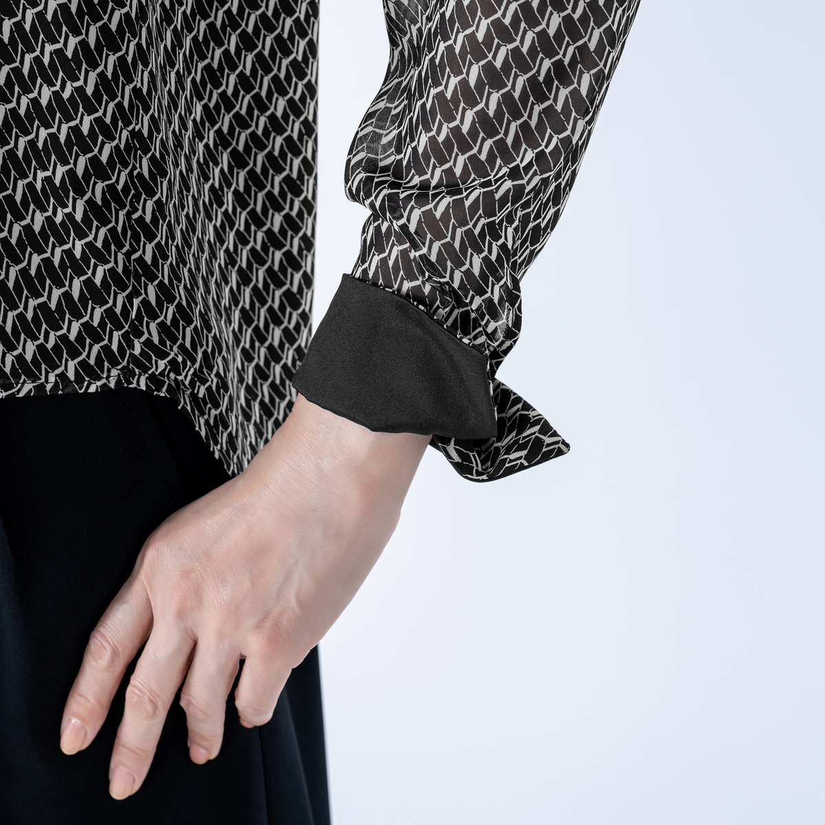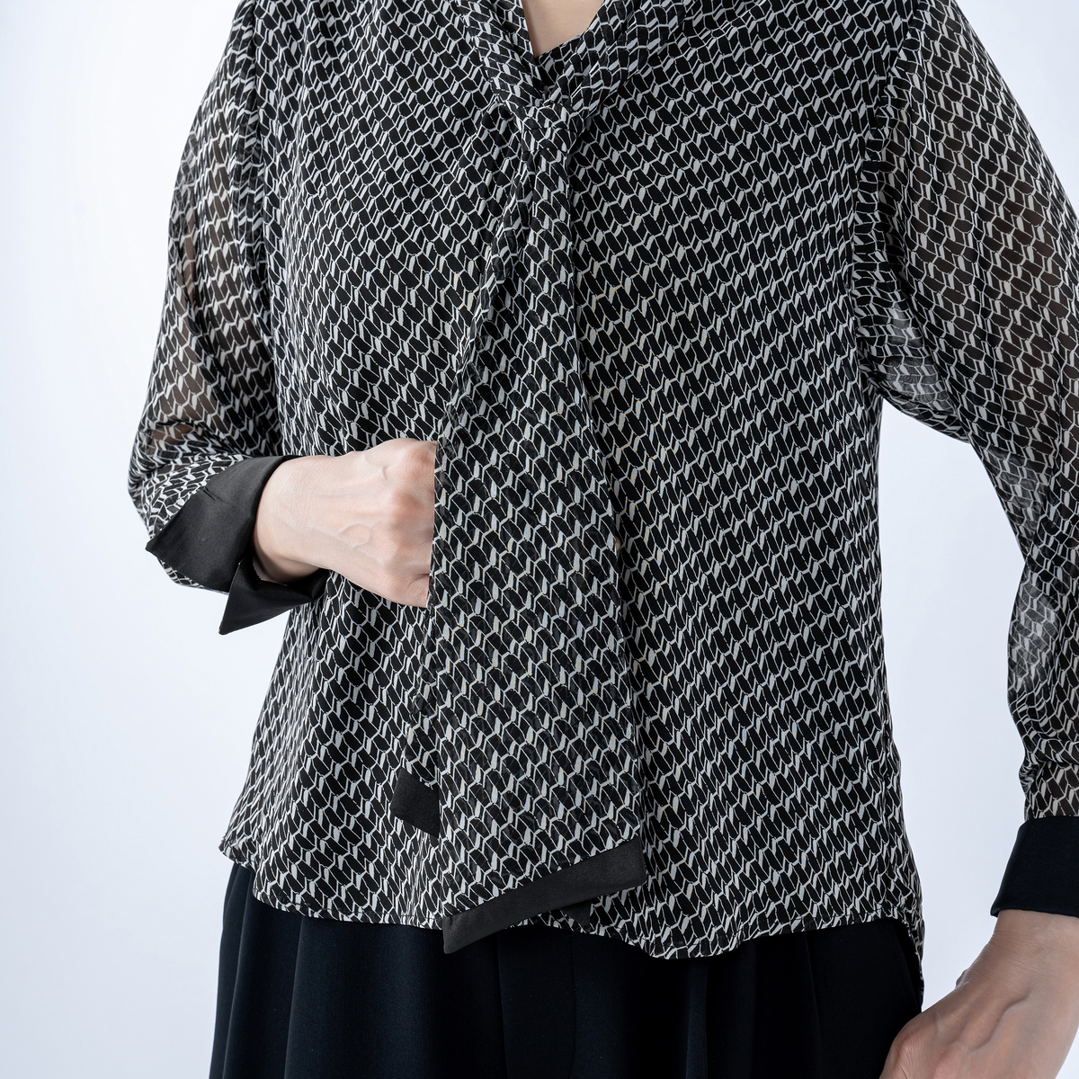 ボウタイ先端や袖口のカフス裏にも無地配色を取り入れ、さりげなくモダンなエッジを効かせました。前後身頃は裏地付きで透け感も気になりにくく、一枚で着映えも。オフィスやお出かけに華やかさを添えます