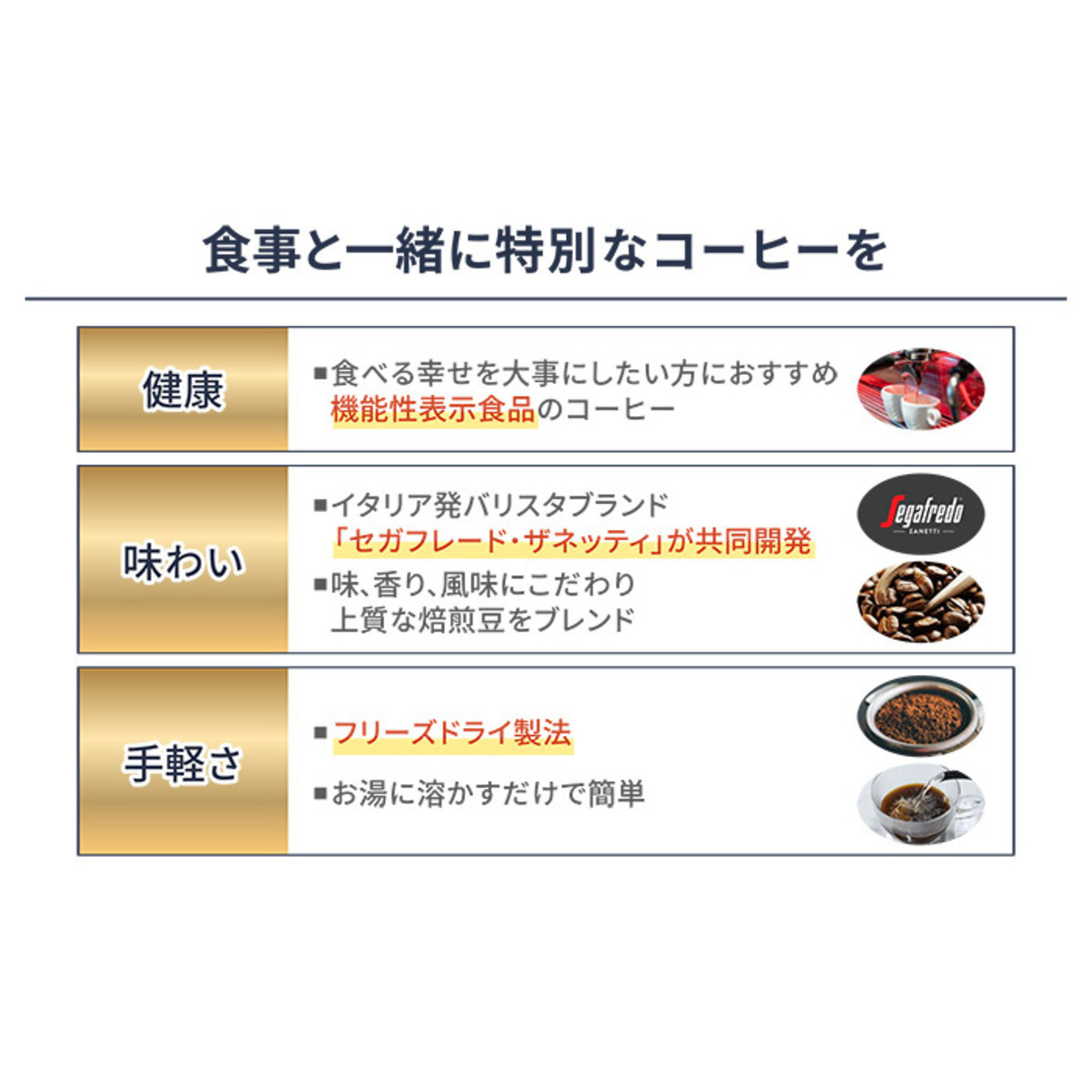 セガフレード・ザネッティ・ジャパン株式会社が厳選したコーヒーに、植物油脂/乳化剤(大豆由来)と機能性関与成分イソマルトデキストリン(食物繊維)を配合し、独自製法で製造しています(*1)。豊かでコクのある口当たりにフルーティーで華やかな酸味と香りが特徴。フリーズドライ製法により挽きたてのような味わいが楽しめます(*2)