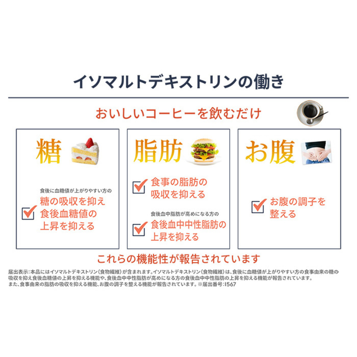 [アレルギー物質特定原材料8品目] 乳 [内容量] 180g [目安量] 1日1〜3回(1杯分(約6g)) [お召し上がり方] 6gを約100〜140mLのお湯等に溶かしてお飲みください [保存方法] 高温多湿、直射日光を避け、涼しいところに保存してください [栄養成分表示](本品6gあたり) エネルギー:14.9kcal たんぱく質:0.5g 脂質:0.07g 炭水化物:5.0g 糖質1.1g 食物繊維3.9g 食塩相当:0.0g [機能性関与成分] イソマルトデキストリン(食物繊維) 2.53g <機能性表示食品> [届出番号]I567 [届出表示] 本品にはイソマルトデキストリン(食物繊維)が含まれます。イソマルトデキストリン(食物繊維)は、食後に血糖値が上がりやすい方の食事由来の糖の吸収を抑え食後血糖値の上昇を抑える機能や、食後血中中性脂肪が高めになる方の食後血中中性脂肪の上昇を抑える機能が報告されています。また、食事由来の脂肪の吸収を抑える機能、お腹の調子を整える機能が報告されています [原料原産地] イソマルトデキストリン(国内製造)、フリーズドライコーヒー(コーヒー豆(生豆生産国:ブラジル、ベトナム)) [原産国] 日本 [注意事項] ※本品は多量摂取により、疾病が治癒したり、より健康が増進するものではありません。一日の摂取目安量をお守りください ※本品は、疾病の診断、治療、予防を目的としたものではありません ※本品は、疾病に罹患している者、未成年者、妊産婦(妊娠を計画している者を含む。)及び授乳婦を対象に開発された食品ではありません ※疾病に罹患している場合は医師に、医薬品を服用している場合は医師、薬剤師に相談してください ※体調に異変を感じた際は、速やかに摂取を中止し、医師に相談してください ※本品は、事業者の責任において特定の保健の目的が期待できる旨を表示するものとして、消費者庁長官に届出されたものです。ただし、特定保健用食品と異なり、消費者庁長官による個別審査を受けたものではありません ※食生活は、主食、主菜、副菜を基本に、食事のバランスを ※開封後はなるべく早めにお召し上がりください ※原材料をご参照の上、アレルギーの心配のある方はご利用をお控えください ※摂り過ぎ、あるいは体質・体調により、おなかがゆるくなることがあります ※お子さまの手の届かないところに保管してください ※天産物を使用しているため、収穫時期等により色調に変化を生ずる場合がありますが、品質には問題ありません ※体質やその日の体調によりまれに合わない場合があります。その場合は使用を中止してください ※妊娠中・授乳中、またお薬を服用中・通院中の方は医師・薬剤師にご相談のうえご利用ください [原材料] イソマルトデキストリン(国内製造)、フリーズドライコーヒー(コーヒー豆(生豆生産国:ブラジル、ベトナム))、植物油脂、有胞子性乳酸菌、ツバキ種子エキス末/乳化剤(大豆由来)、シクロデキストリン、V.C、抽出V.E、ナイアシン、パントテン酸Ca、V.B1、V.B6、V.B2、V.A、葉酸、V.D、V.B12