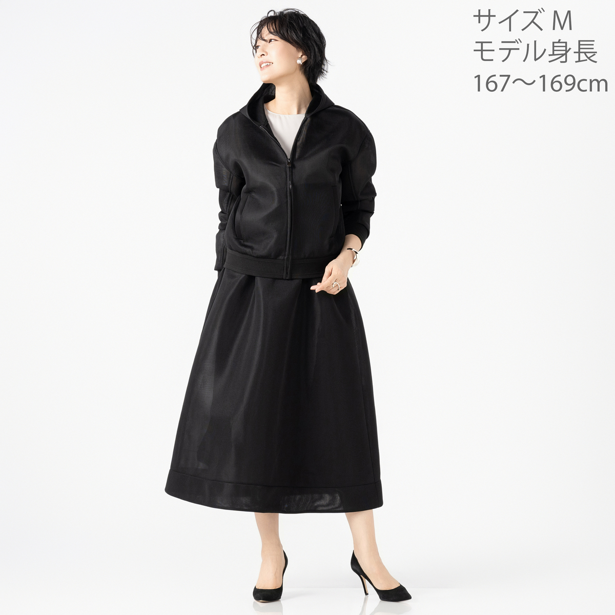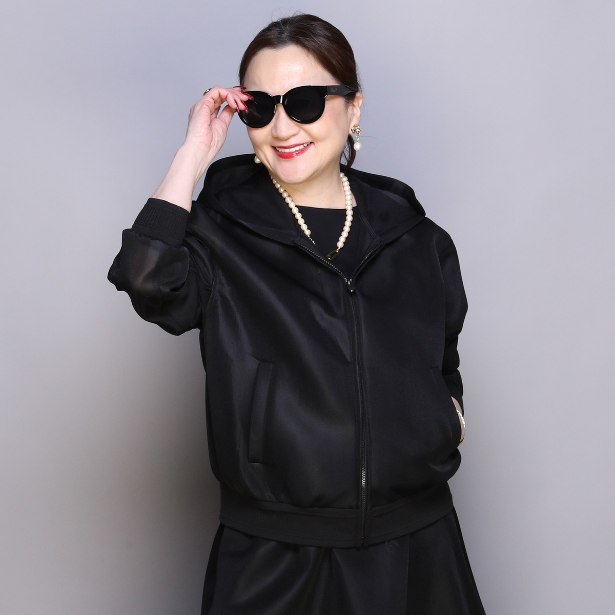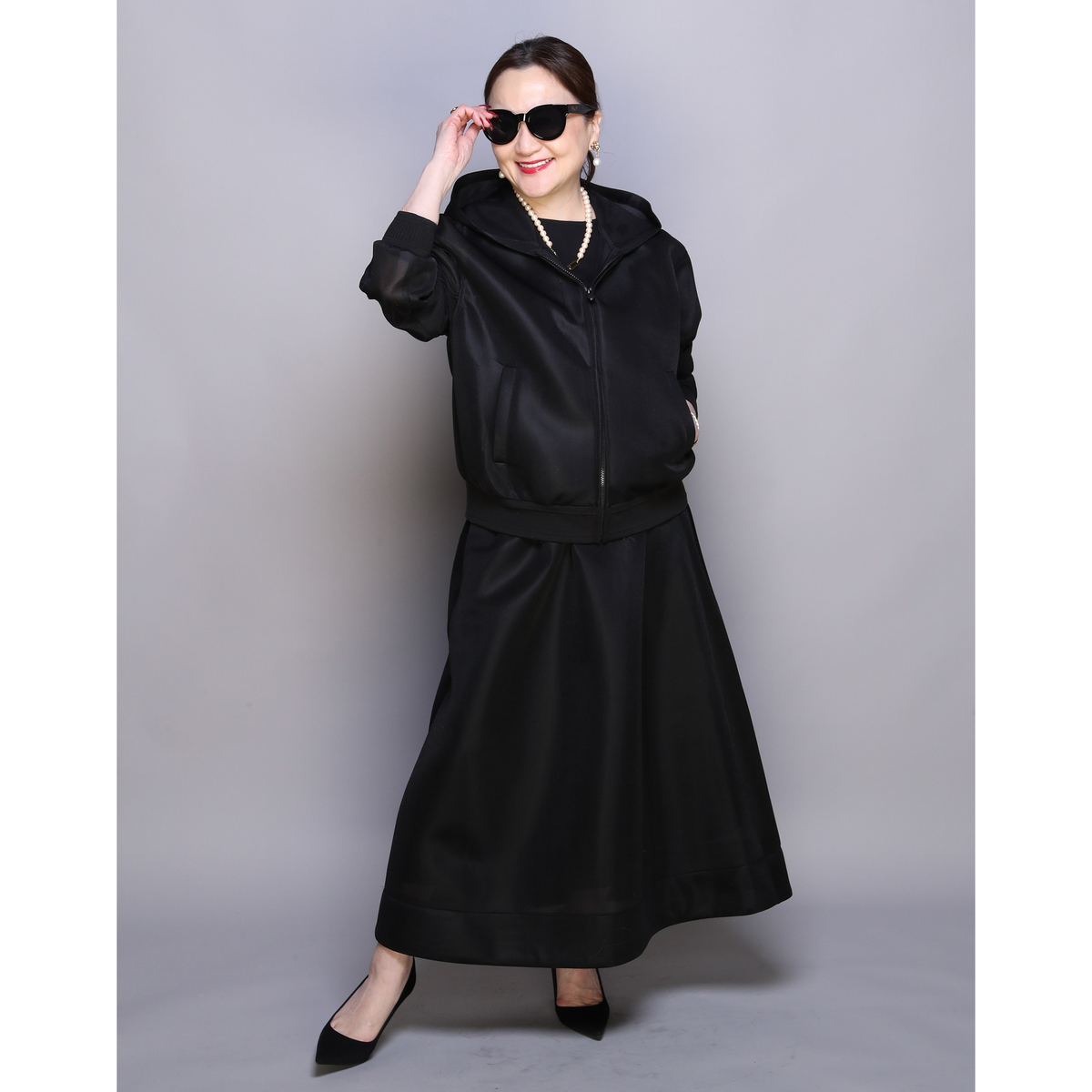 エレガントにもカジュアルにも似合うデザイン。同素材のアイテムと、セットアップしたコーディネートも楽しめます