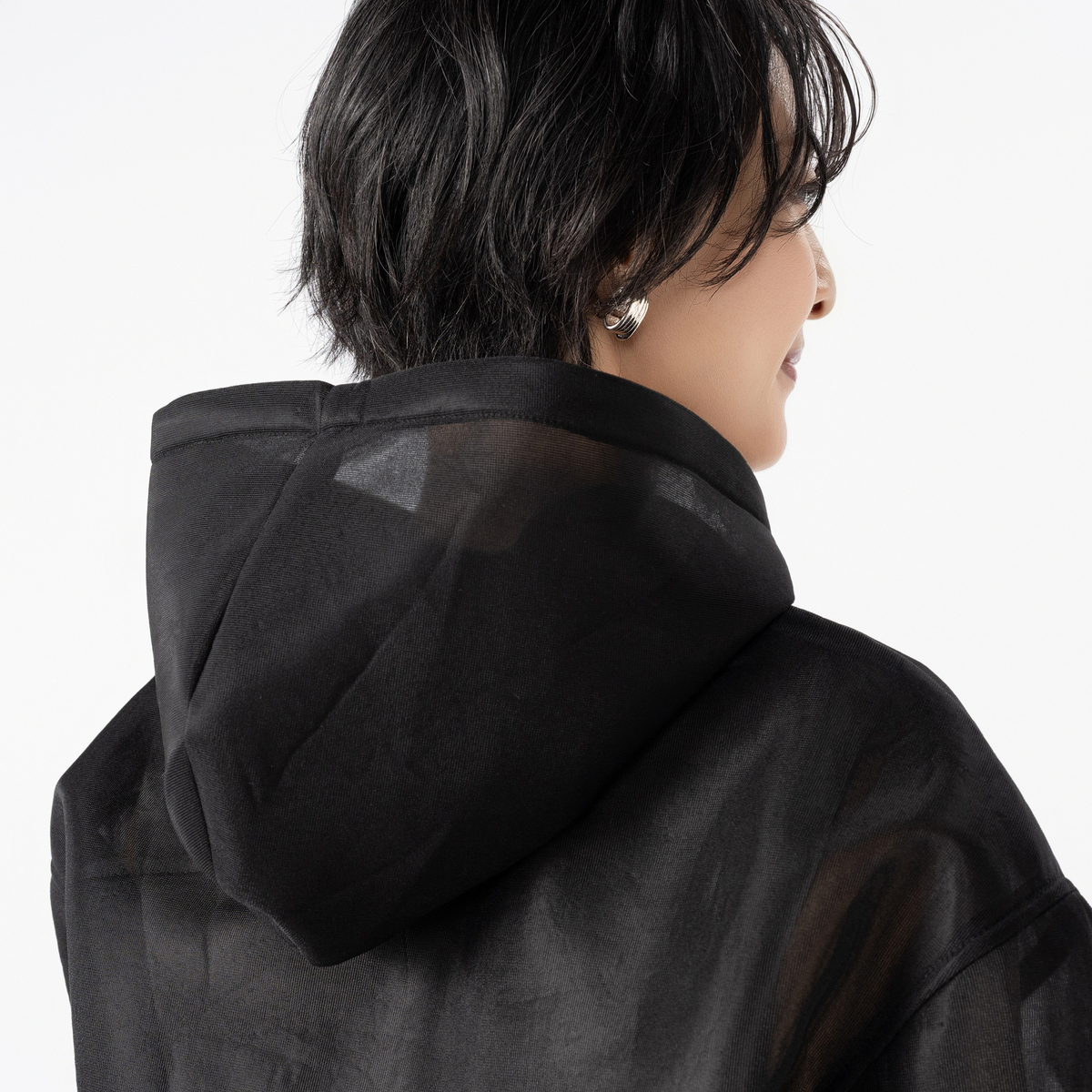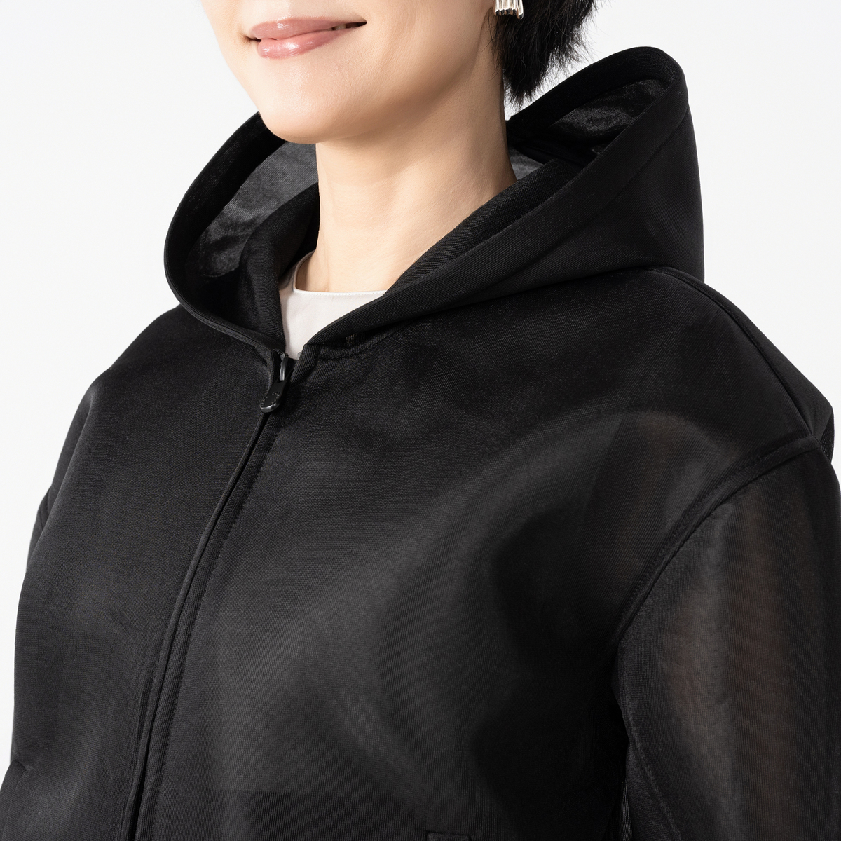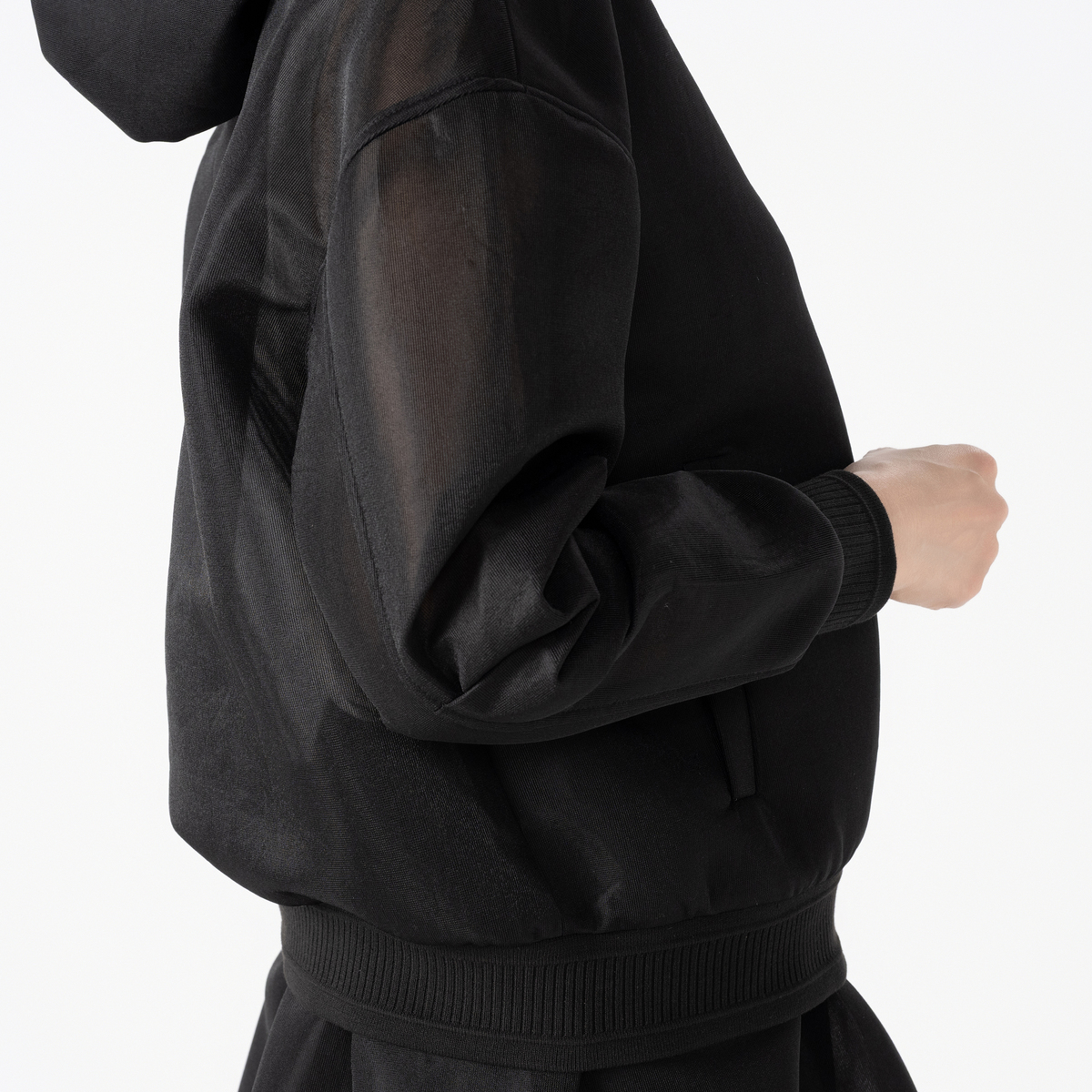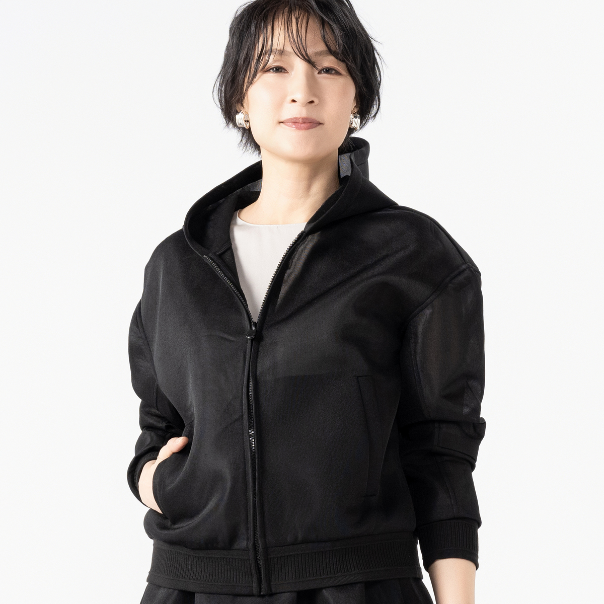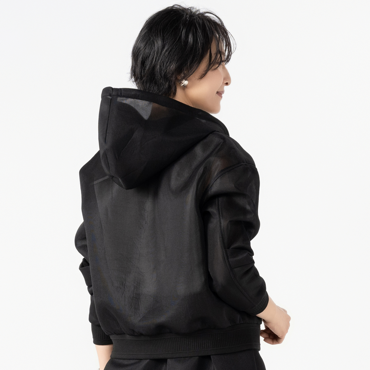 シアーダンボール素材のフーデッドブルゾン。タックを入れた立体的な袖がポイントで、袖口と裾には同色系の編立リブを施しました