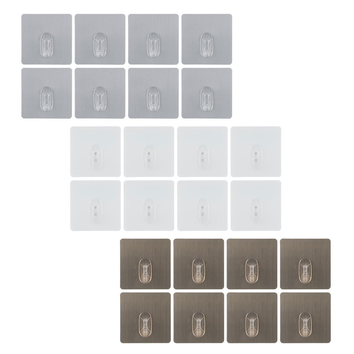 [サイズ] 約 縦12 x 横12 x 高さ 2.5cm [材質] 合成樹脂(PVC、PC) [耐荷重] 約10kg(滑らかな垂直壁面に貼り付け、フックに対して下方向に荷重をかけた場合) [使用方法] 1.本品を貼り付ける表面をきれいに拭いてください。表面が完全に乾燥し油分が残っていないことをご確認ください 2.本品背面の保護フィルムを剥がしてください 3.上記1.できれいに拭いた表面に本品の粘着部を貼り付けて強く押し付けてください 4.内部に残った気泡を外に押し出してください 5.1時間そのまま貼付した状態にしてください 6.フック部分に指を押し当てて、本品がしっかり貼り付いていることをご確認ください 7.本品を剥がす場合は、コーナー部分からゆっくり剥がしてください。無理に剥がすと本品が破損する恐れがあります [注意事項] ※危険物、貴重品、壊れやすいものには絶対に使用しないでください ※フックに重量物を乗せないでください。落下しても支障のないもの、周囲に被害が及ばないものに使用してください ※凸凹、ザラザラ、溝・隙間がある、粘着面より小さい、つや消し、フッ素等の特殊加工が施された表面には貼り付けられません ※壁紙や塗装の剥がれやすい面には使用しないでください。壁紙・塗装面が剥がれる恐れがあります ※長期間貼り付けた場合、本品の接着面が壁面に固着し、剥がしづらくなる恐れがあります。無理に引き剥がして、剥がれ等の損傷が生じないようご注意ください ※本品のフックに対して垂直下方向に荷重が加わるように使用してください ※表示の耐荷重は本品が保持する重量を保証するものではありません。貼り付ける側の表面状態、使用環境によって異なります ※フックに曲がりや歪み、ひび割れ等、異常が見られた場合は、使用を中止してください ※本品の剥離と粘着部の洗浄を繰り返すうちに粘着力が低下していきます。予めご了承ください ※直射日光が当たる場所、電子レンジやオーブン、ガスコンロの周辺等、高温になる場所では使用しないでください ※本品は玩具ではありません。乳幼児の手の届かないところで使用・保管してください ※本品を長期間使用しない場合は、粘着面に保護フィルムを貼り、直射日光や高温多湿を避け涼しい場所で保管してください ※破棄する際は、各自治体の指示に従い分別してください ■取り扱い説明を充分にご確認の上、ご使用下さい 【中国製】 [セット内容] 貼って剥がせる吸着フック耐荷重約10kg 8点セット×3 [お手入れ] ・汚れた場合または粘着力が弱くなった場合は、本品の粘着部表面をぬるま湯で汚れや埃を洗い流してください ・研磨剤成分の入った洗剤で洗わないでください。スポンジ等で擦らないでください。本品の粘着力低下の原因になります ・本品の粘着部を洗った後は自然乾燥またはドライヤー等の冷風で乾かしてください。タオル等で水滴をふき取らないでください。タオルの繊維が粘着部に付着し、粘着力低下の原因となります ・本品の粘着部を洗った後は、本品を十分に乾燥させ粘着部に水滴が残っていないことを確認し、再度貼り付けてください ・本品を再度貼り付ける際は、必ず上記ご使用方法・手順に従って貼り付けてください