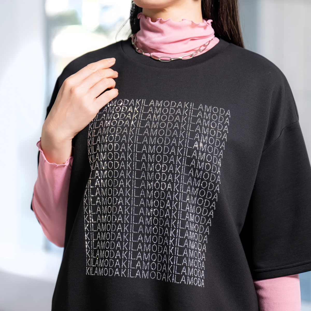 きらめくロゴで想いを伝える、KILA MODAを象徴するプルオーバーです。ストレッチダンボール素材が身体にやさしくフィットし、上品なシルエットに。ラフになりすぎず大人らしい華やかさを演出しながら、心地よさも兼ね備えています