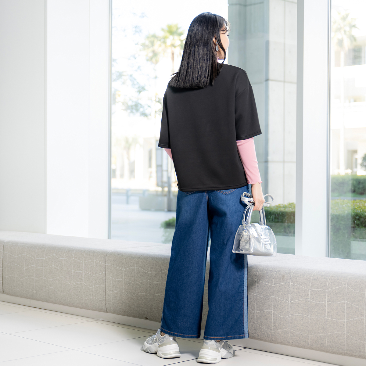 前後差のある裾ラインが自然な抜け感を生み、ヒップまわりを自然にカバーします。素材のもっちりとした質感が立体感を演出し、カジュアルでもエレガントな印象に。裾ラインを活かして、アウトスタイルで着こなすのがおすすめです