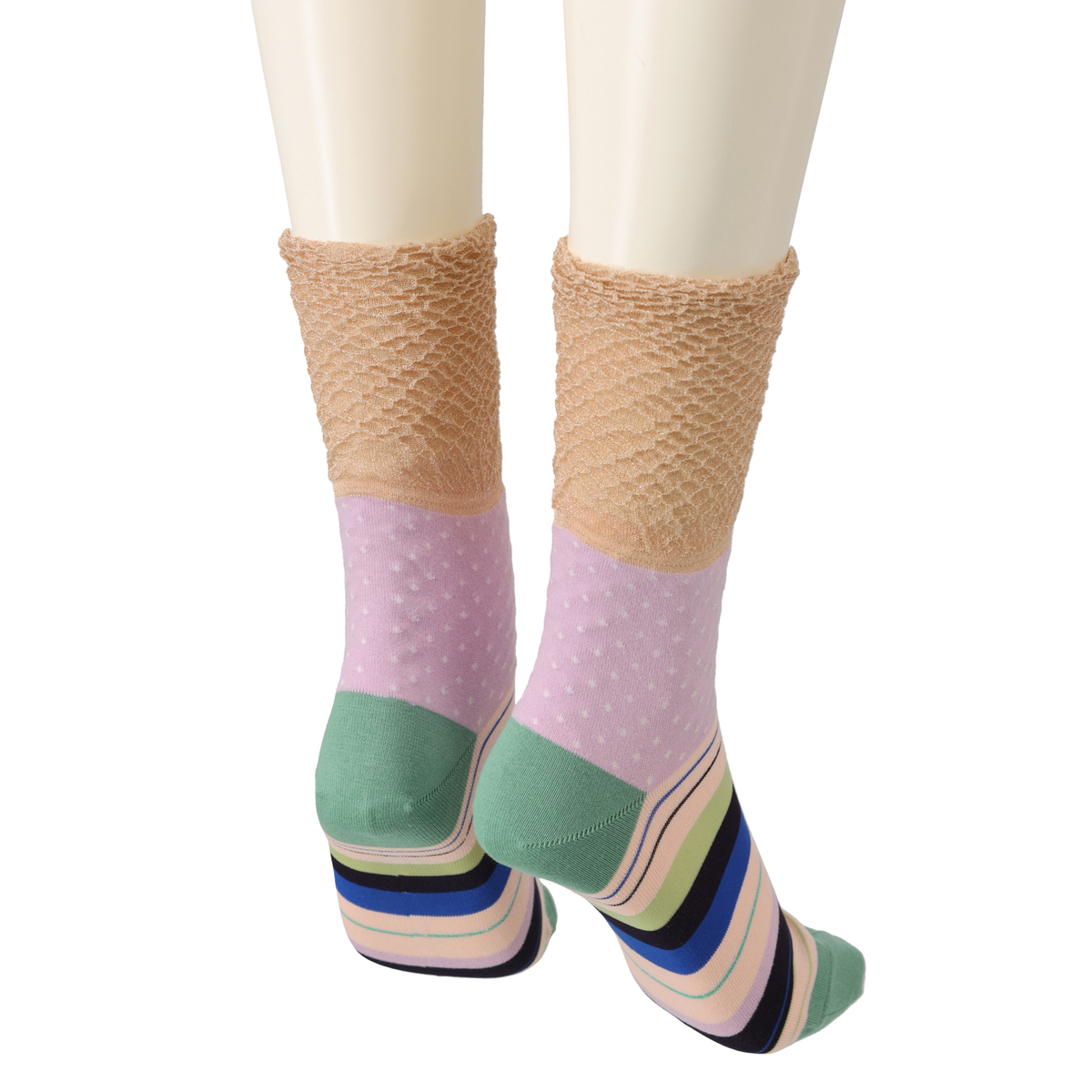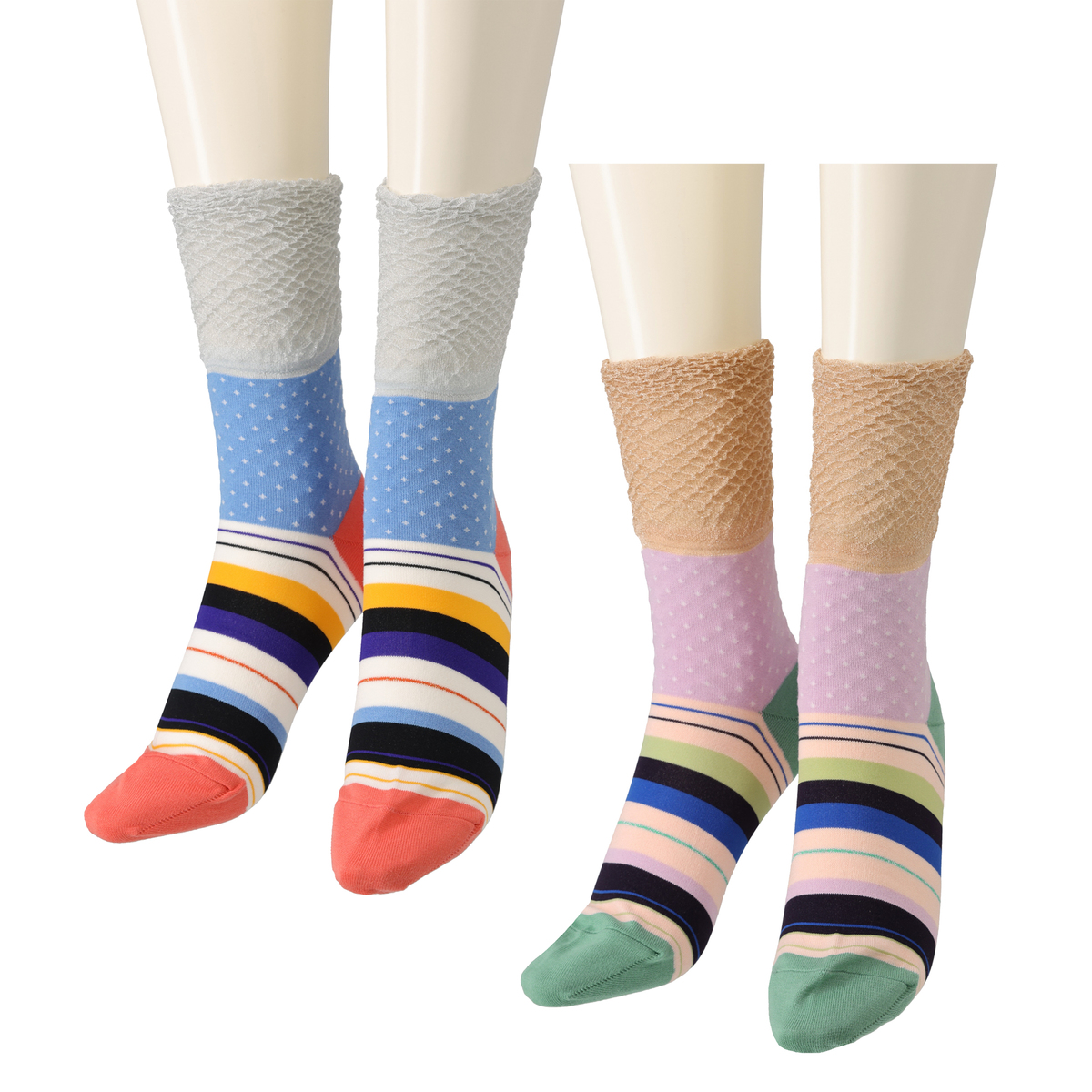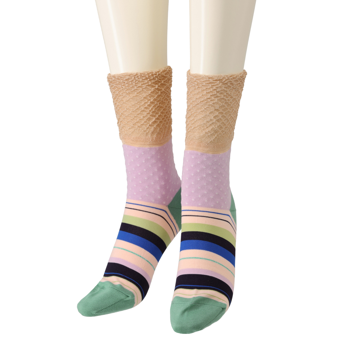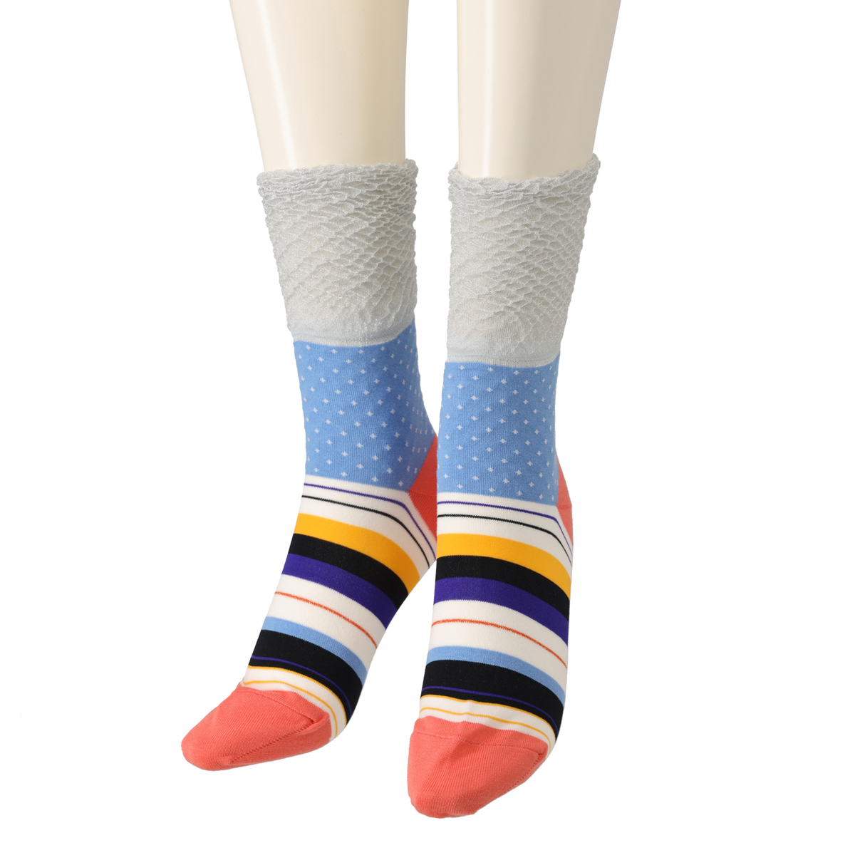 ポップなドットとボーダー柄を組合せたソックス。細かな配色まで丁寧に編み上げられており、シンプルなボトムスと合わせるだけでコーデが華やぎます。ちょっと気分を変えたい日のスタイリングにもおすすめ