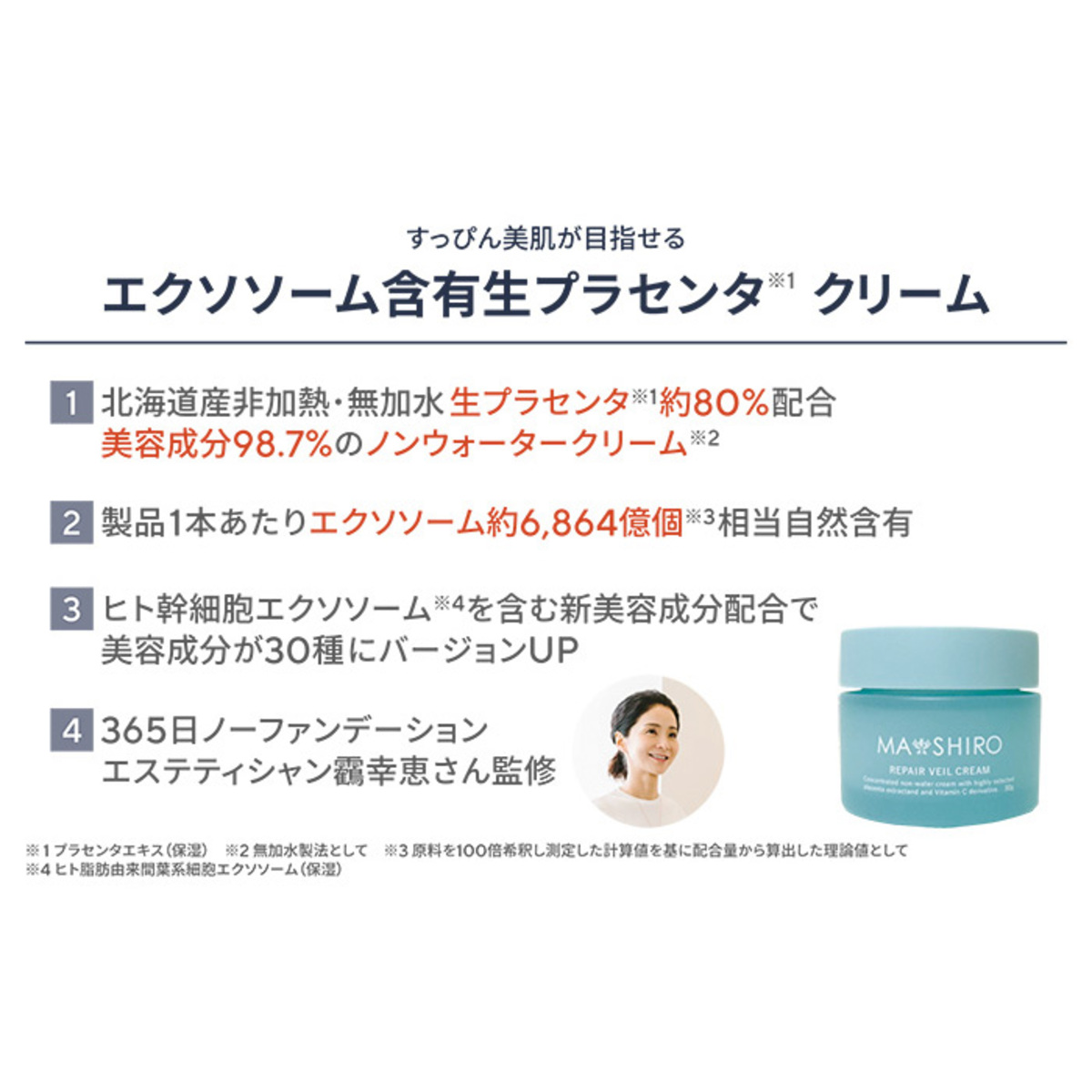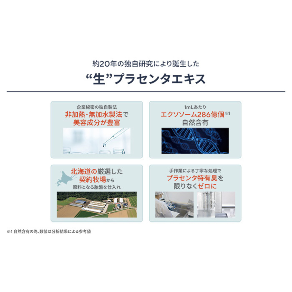 配合しているプラセンタエキスは、原料1mLあたりエクソソーム様顆粒を286億個自然含有*。バルクの製造工程で熱を一切加えない非加熱処方にて製造したビタミンC誘導体(セチル2ーグリセリルアスコルビン酸:乳化・保湿)を乳化剤として配合しました
