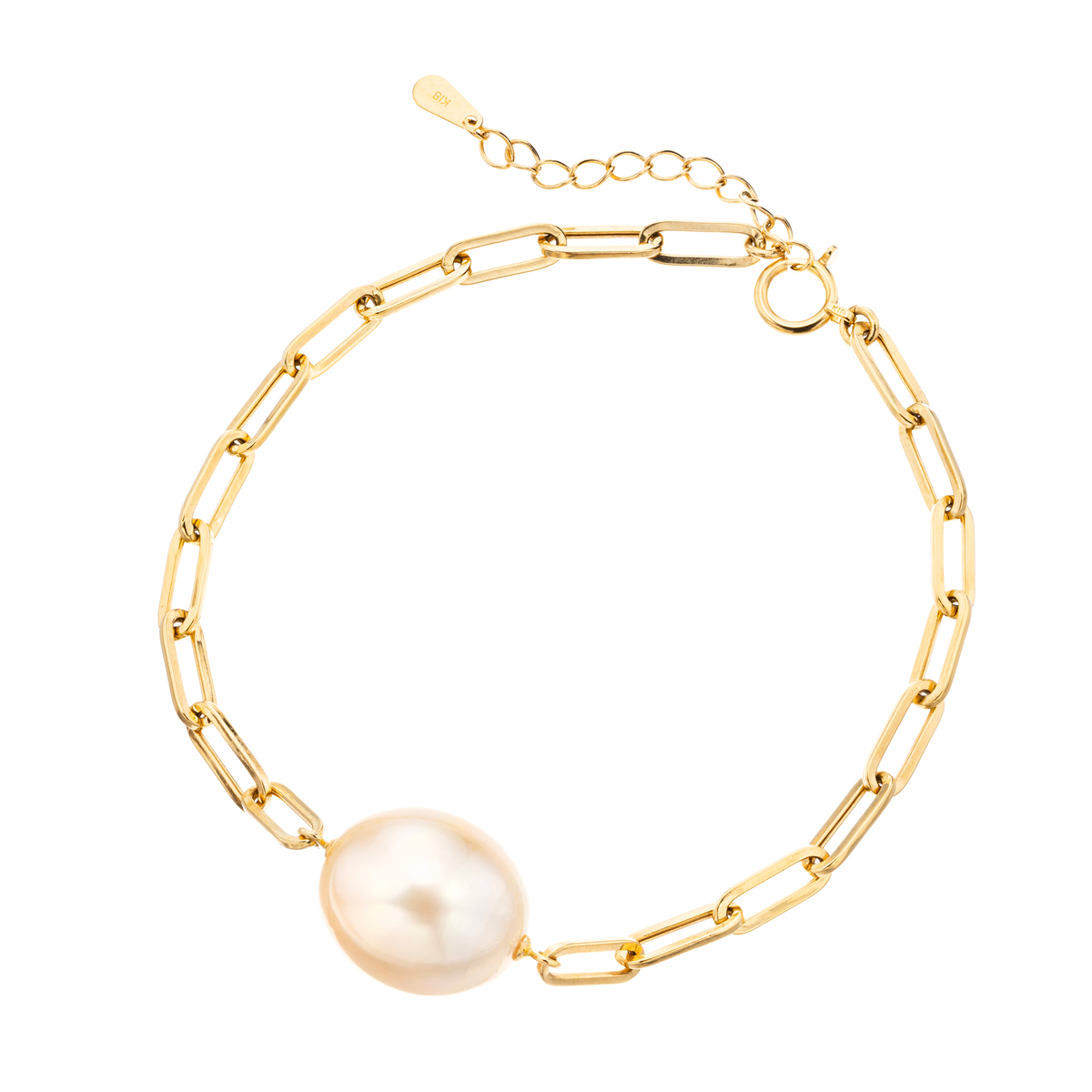 真珠総合研究所にテリがトップグレードの範疇と認められた、フィリピン・パラワン産のナチュラルシャンパンカラーの白蝶真珠を使用したブレスレット。テリの良いシャンパンカラーは肌なじみが良く上品な印象に。チェーンはボリュームある見た目ながら、中空のお仕立てなので軽やかに身に着けていただけます