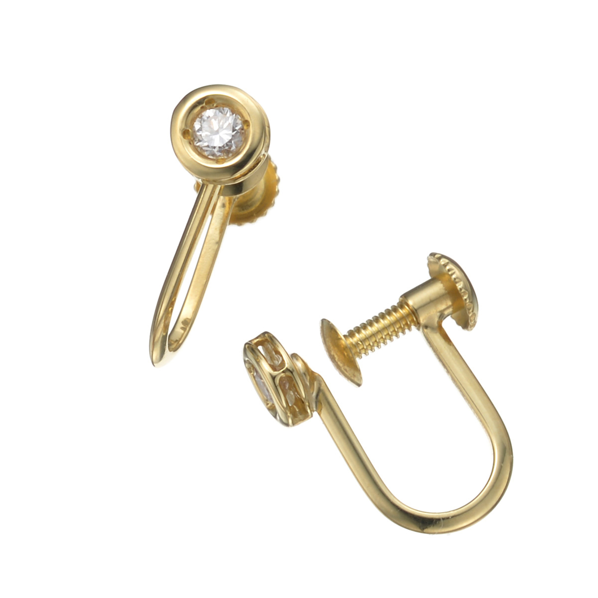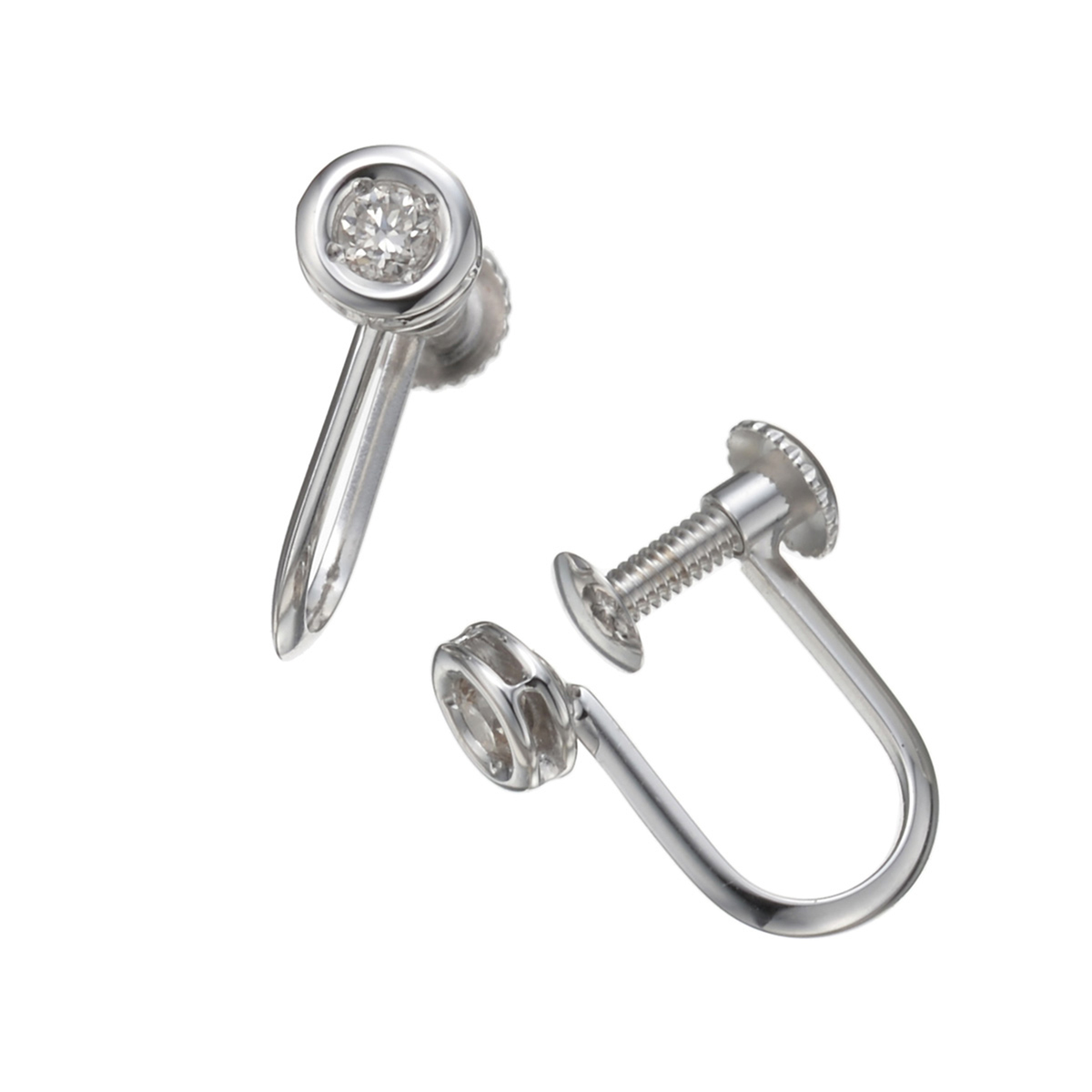 ダイヤモンドの輝きが引き立つ、シンプルな枠に留めた一粒イヤリング。枠の照り返しで、石をより大きく見せています。デイリーに活躍できるベーシックなアイテムです