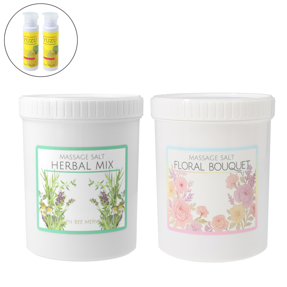 [セット内容] ・クインビーメルヴェーユ マッサージソルト1kg×2 ・クインビーメルヴェーユWクレンジングジェルYZ(ユズ)50ml×2(プレゼント) [成分] グレープフルーツ: 塩化Na、水、ワセリン、トリ(カプリル酸/カプリン酸)グリセリル、グリコシルトレハロース、加水分解水添デンプン、ローヤルゼリーエキス、プロポリスエキス、ハチミツ、プラセンタエキス(ウマ)、他 ローズ: 塩化Na、水、ワセリン、トリ(カプリル酸/カプリン酸)グリセリル、グリコシルトレハロース、加水分解水添デンプン、ローヤルゼリーエキス、プロポリスエキス、ハチミツ、プラセンタエキス(ウマ)、他 ザクロ: 塩化Na、水、ワセリン、トリ(カプリル酸/カプリン酸)グリセリル、グリコシルトレハロース、加水分解水添デンプン、ローヤルゼリーエキス、プロポリスエキス、ハチミツ、プラセンタエキス(ウマ)、他 ローズマリー: 塩化Na、水、ワセリン、トリ(カプリル酸/カプリン酸)グリセリル、グリコシルトレハロース、加水分解水添デンプン、ローヤルゼリーエキス、プロポリスエキス、ハチミツ、プラセンタエキス(ウマ)、他 キンモクセイ: 塩化Na、水、ワセリン、トリ(カプリル酸/カプリン酸)グリセリル、グリコシルトレハロース、加水分解水添デンプン、ローヤルゼリーエキス、プロポリスエキス、ハチミツ、プラセンタエキス(ウマ)、他 ユズ: 塩化Na、水、ワセリン、トリ(カプリル酸/カプリン酸)グリセリル、グリコシルトレハロース、加水分解水添デンプン、ローヤルゼリーエキス、プロポリスエキス、ハチミツ、プラセンタエキス(ウマ)、他 ハーブミックス: 塩化Na、水、ワセリン、トリ(カプリル酸/カプリン酸)グリセリル、グリコシルトレハロース、加水分解水添デンプン、ローヤルゼリーエキス、プロポリスエキス、ハチミツ、プラセンタエキス(ウマ)、他 フローラルブーケ: 塩化Na、水、ワセリン、トリ(カプリル酸/カプリン酸)グリセリル、グリコシルトレハロース、加水分解水添デンプン、ローヤルゼリーエキス、プロポリスエキス、ハチミツ、プラセンタエキス(ウマ)、他
