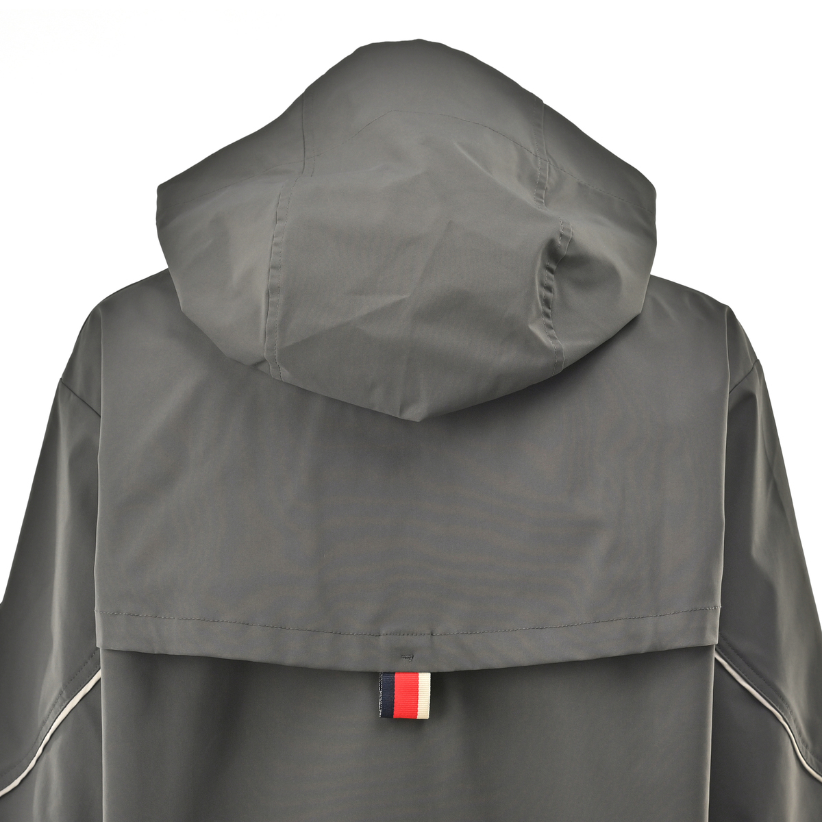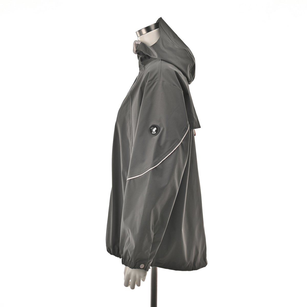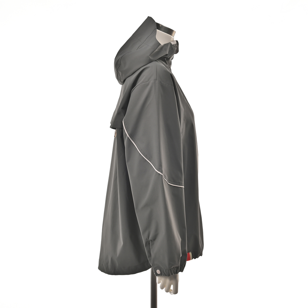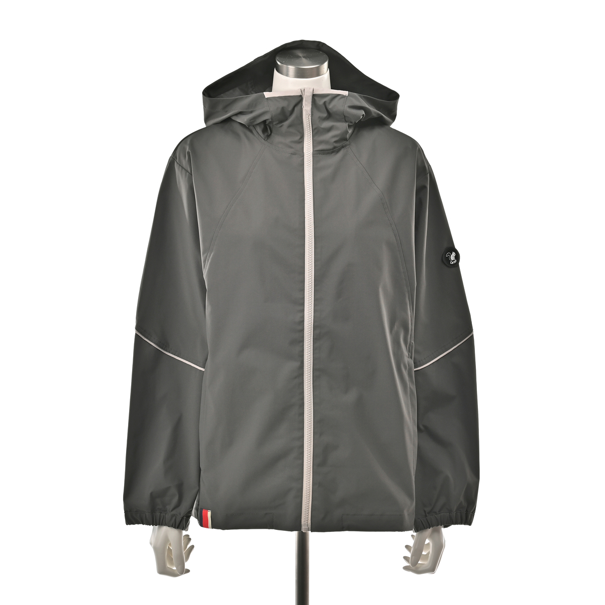 後ろ丈を長めにした裾のラインや前身頃や袖の切り替え、後ろヨークの形もカーブを描く曲線を使ったデザイン。前切り替えにファスナーポケット、裾は丸ゴムとアジャスターで調整可能。袖口も二段階で絞れます。フードは後ろに平ゴムを入れることでフィット感を高め、脱げにくい構造になっています