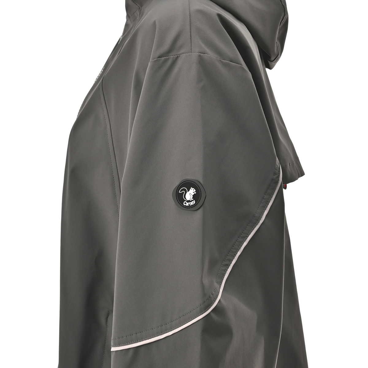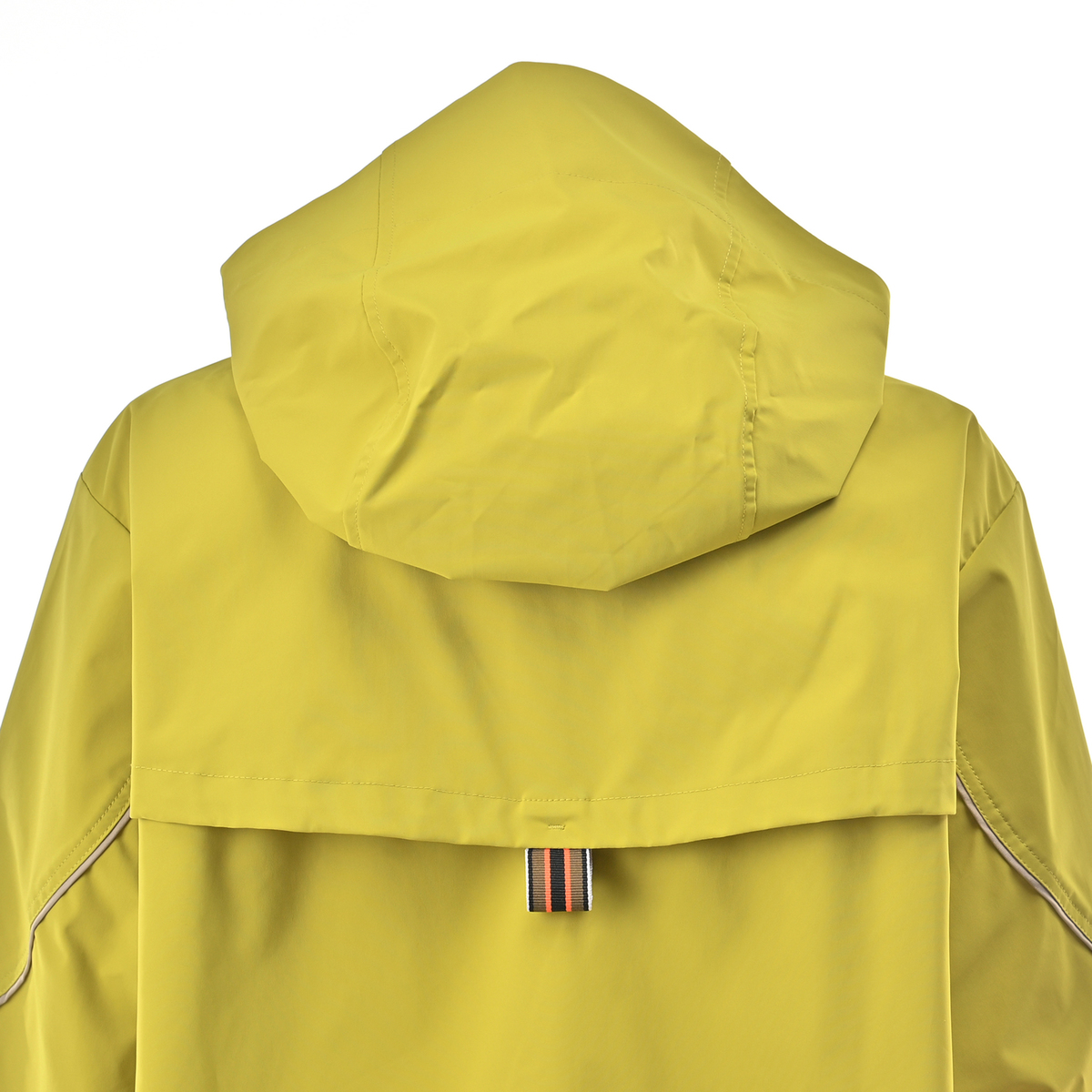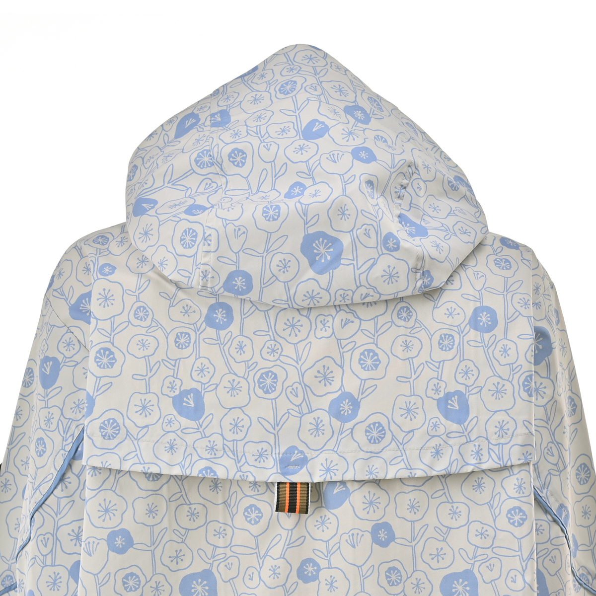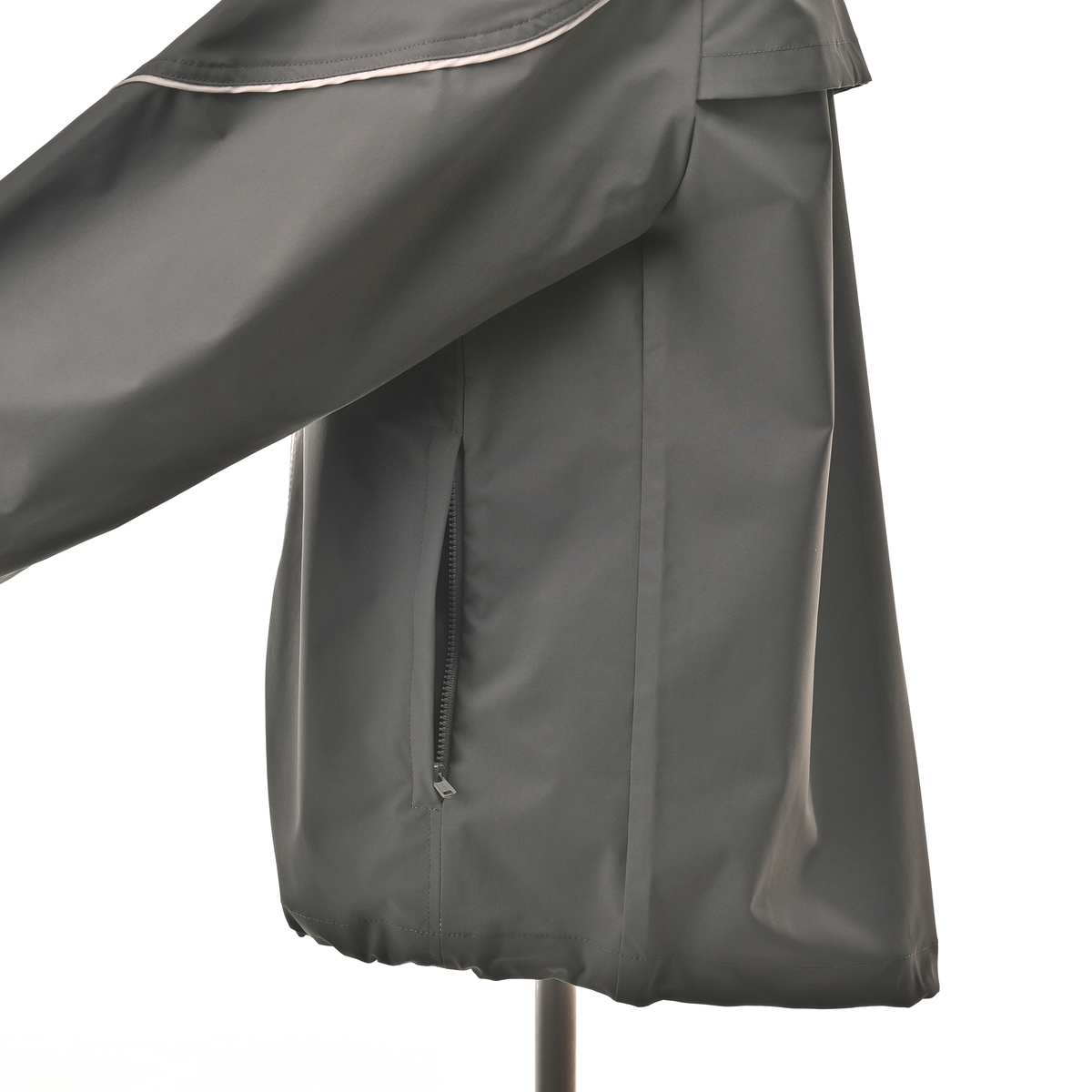 後ろ丈を長めにした裾のラインや前身頃や袖の切り替え、後ろヨークの形もカーブを描く曲線を使ったデザイン。前切り替えにファスナーポケット、裾は丸ゴムとアジャスターで調整可能。袖口も二段階で絞れます。フードは後ろに平ゴムを入れることでフィット感を高め、脱げにくい構造になっています