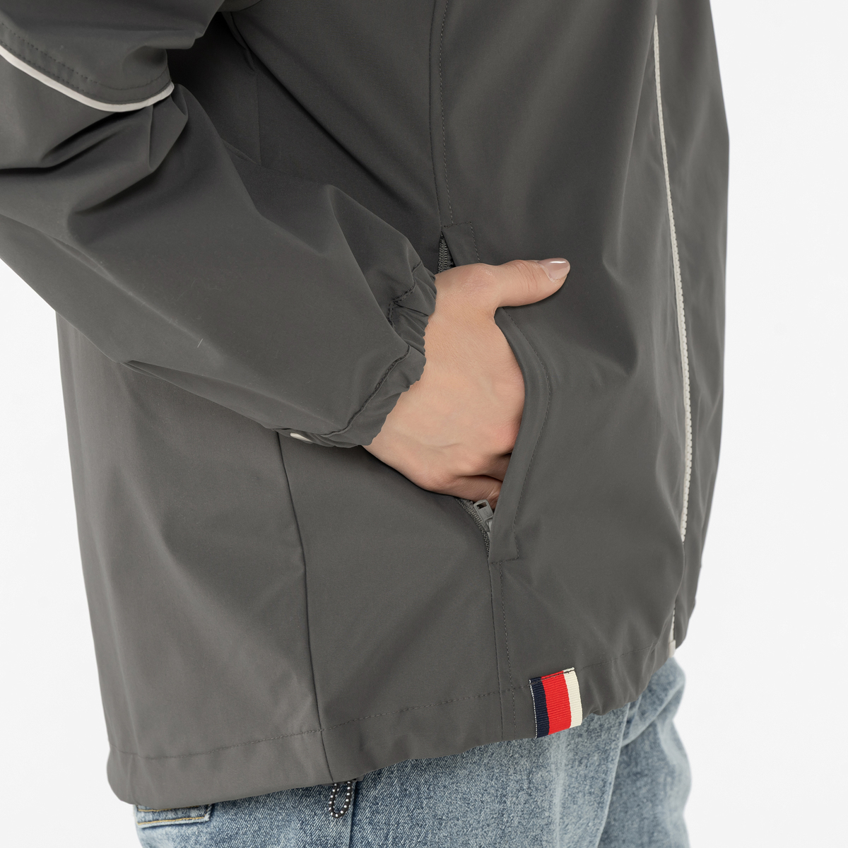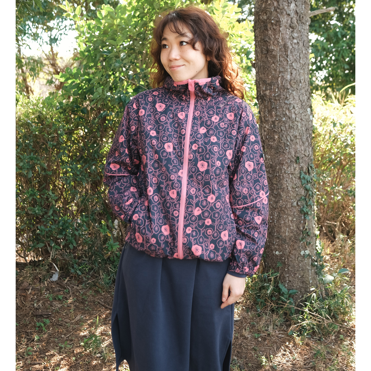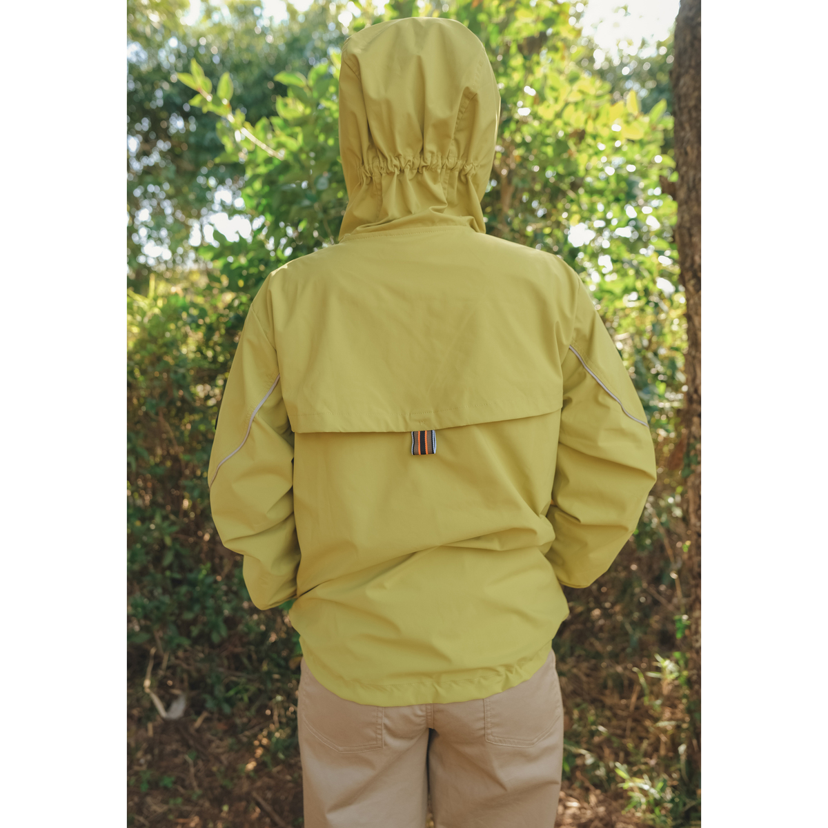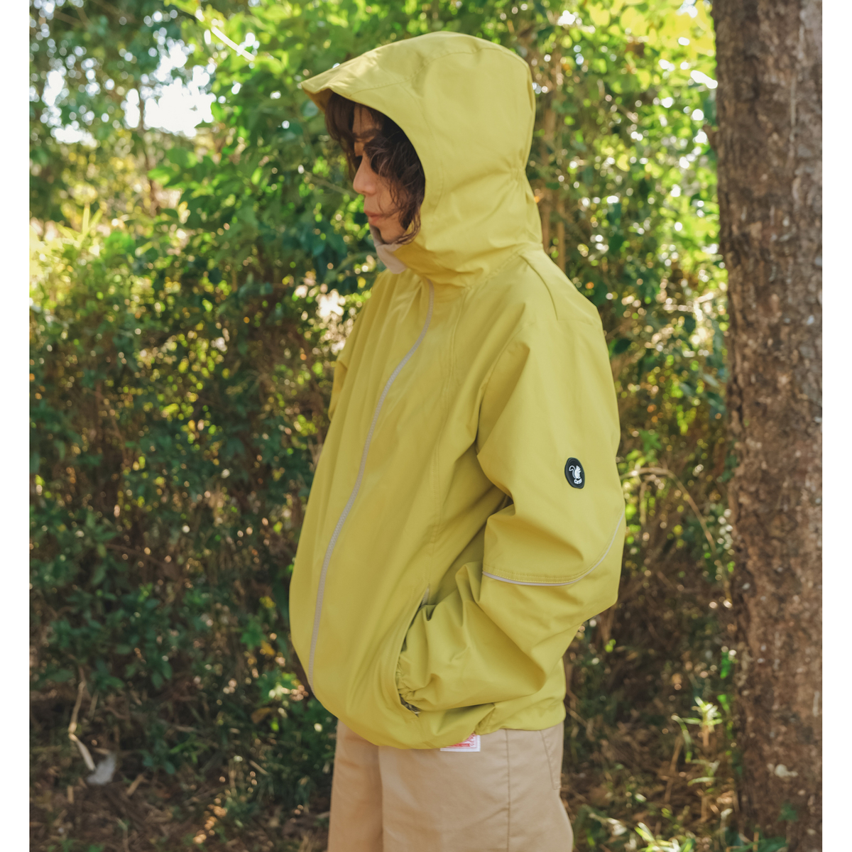 後ろ丈を長めにした裾のラインや前身頃や袖の切り替え、後ろヨークの形もカーブを描く曲線を使ったデザイン。前切り替えにファスナーポケット、裾は丸ゴムとアジャスターで調整可能。袖口も二段階で絞れます。フードは後ろに平ゴムを入れることでフィット感を高め、脱げにくい構造になっています