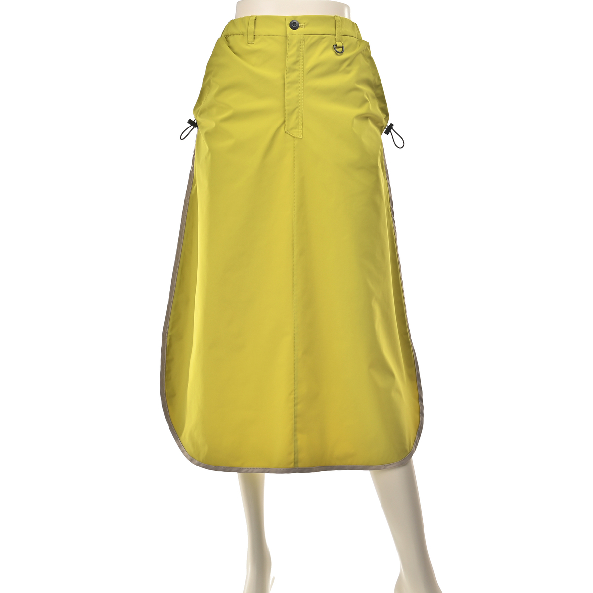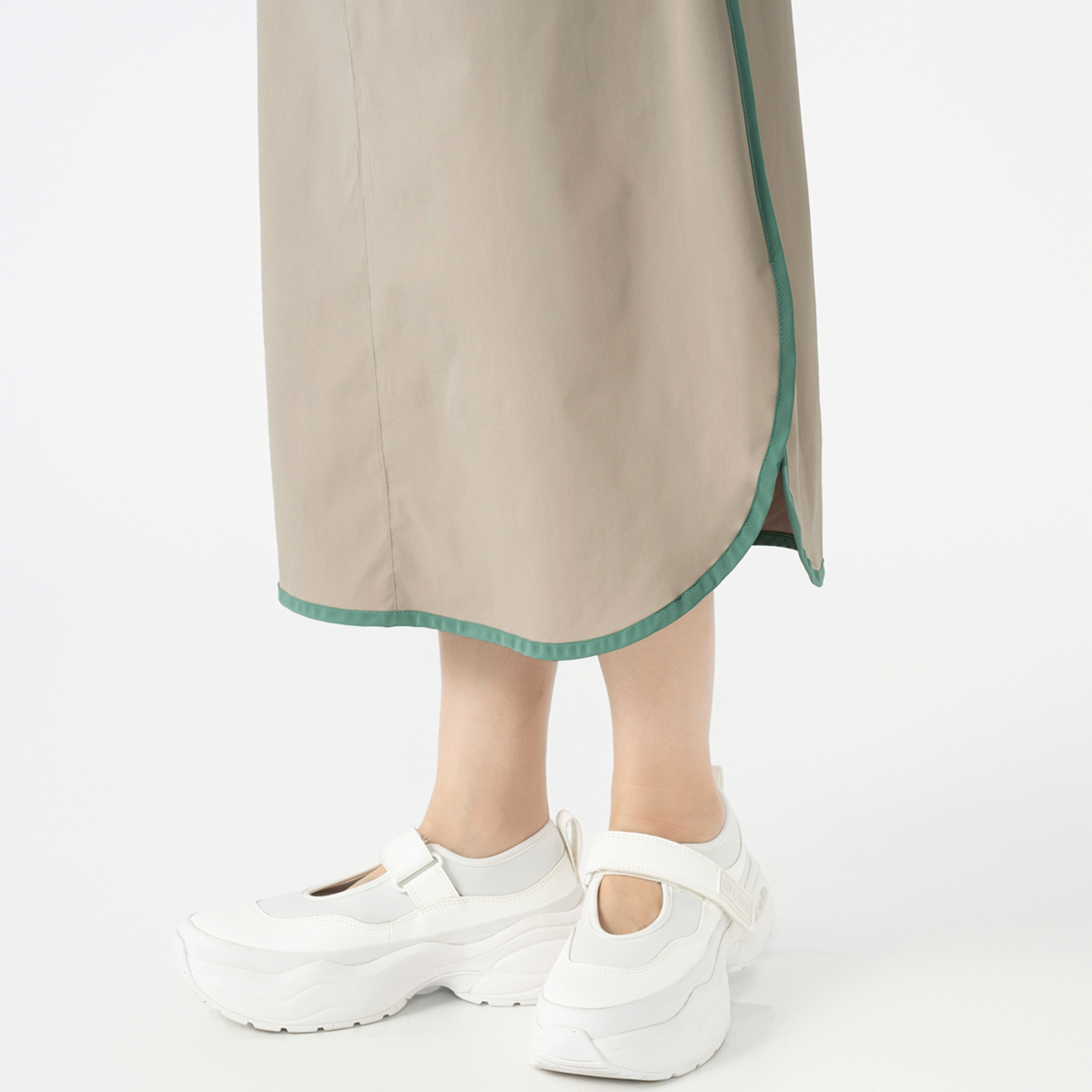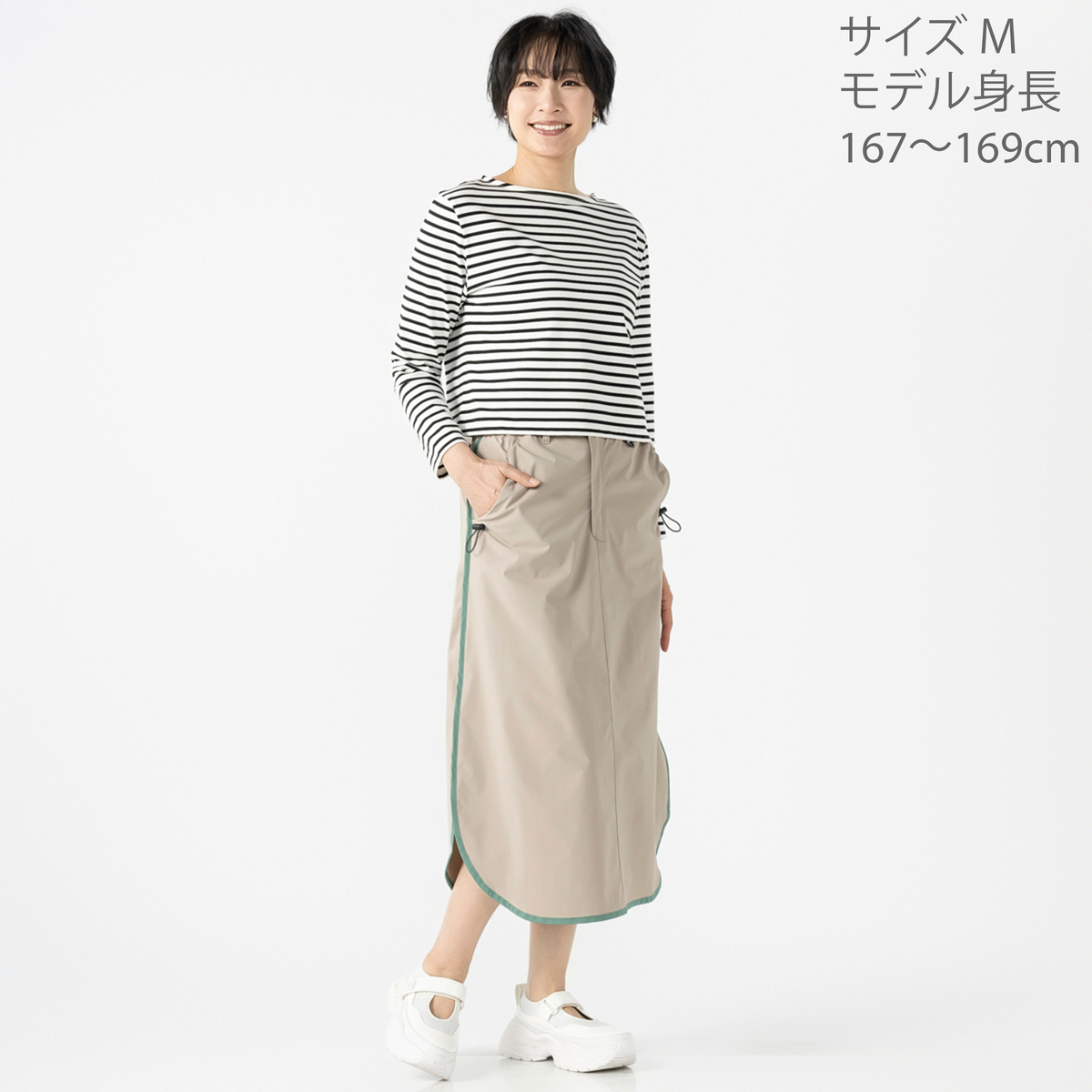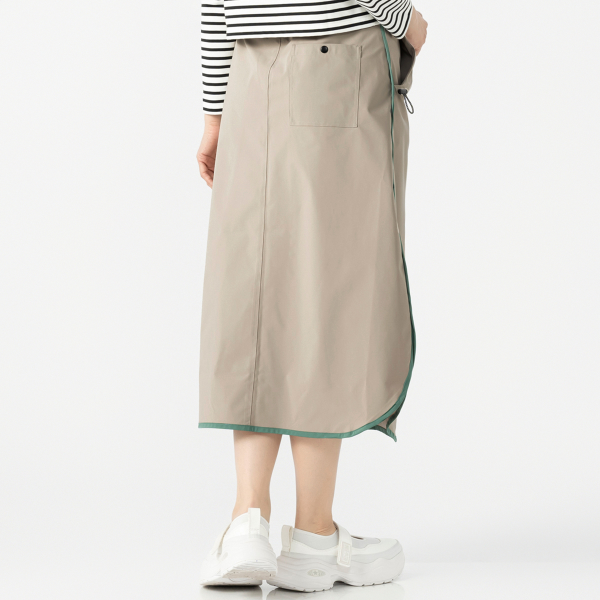 配色パイピングと丸みのある裾が特徴のAラインスカート。ウエストは脇から後ろにかけてゴムを入れ、ラクに穿ける仕様です