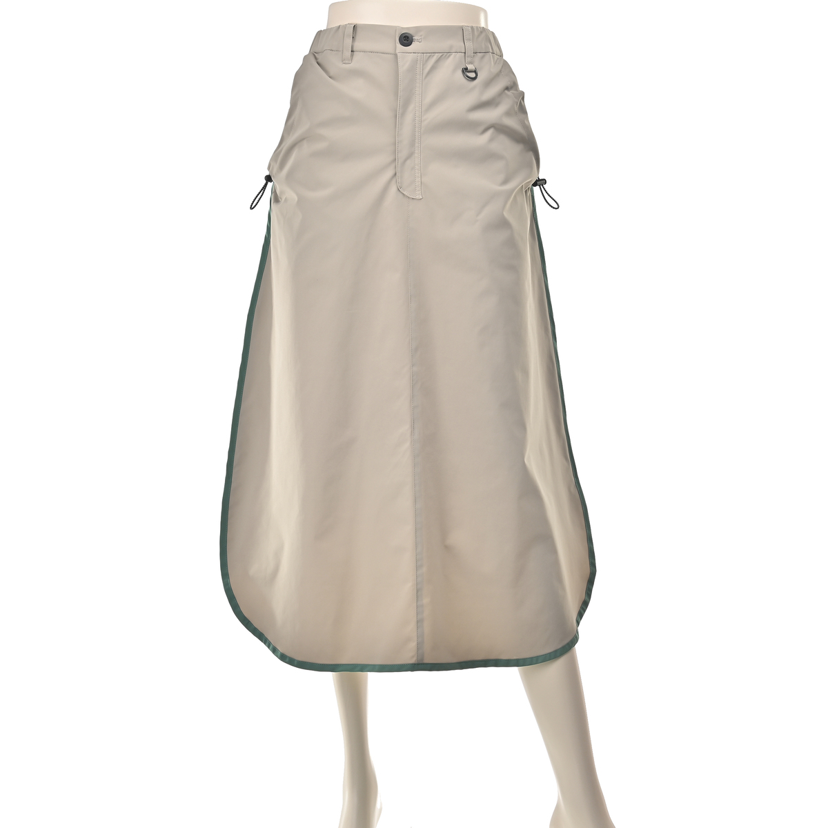 両脇のポケット口にはギャザーを入れ、丸ゴムとアジャスターを付けてさりげないアクセントに。左前のベルト通しにはDカンが付いています
