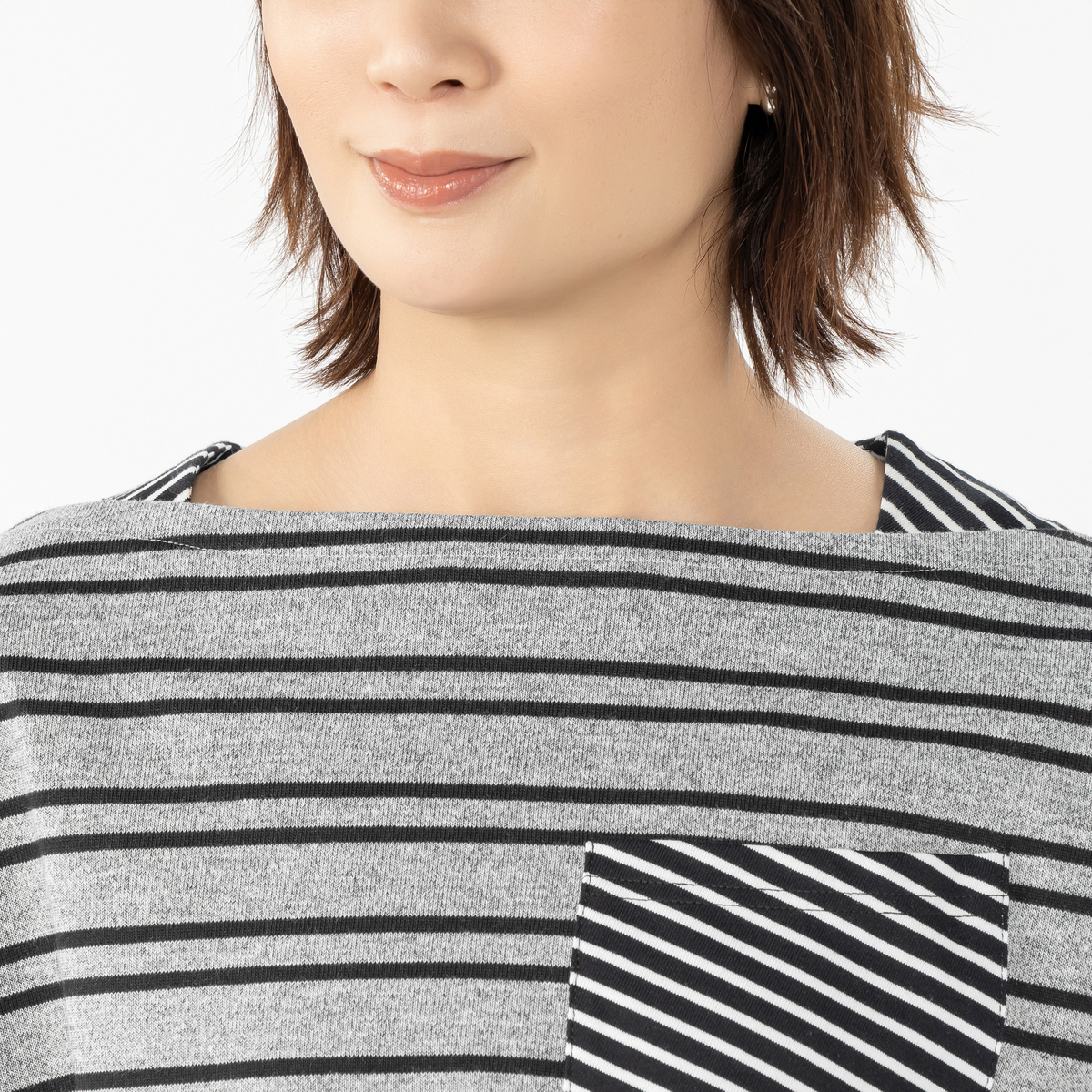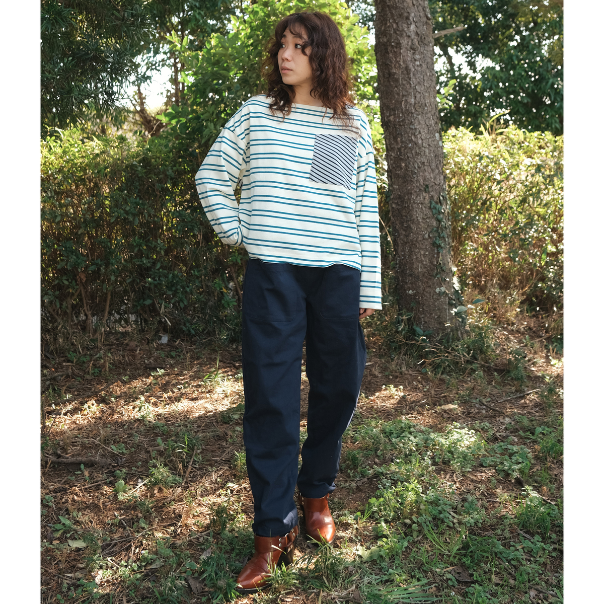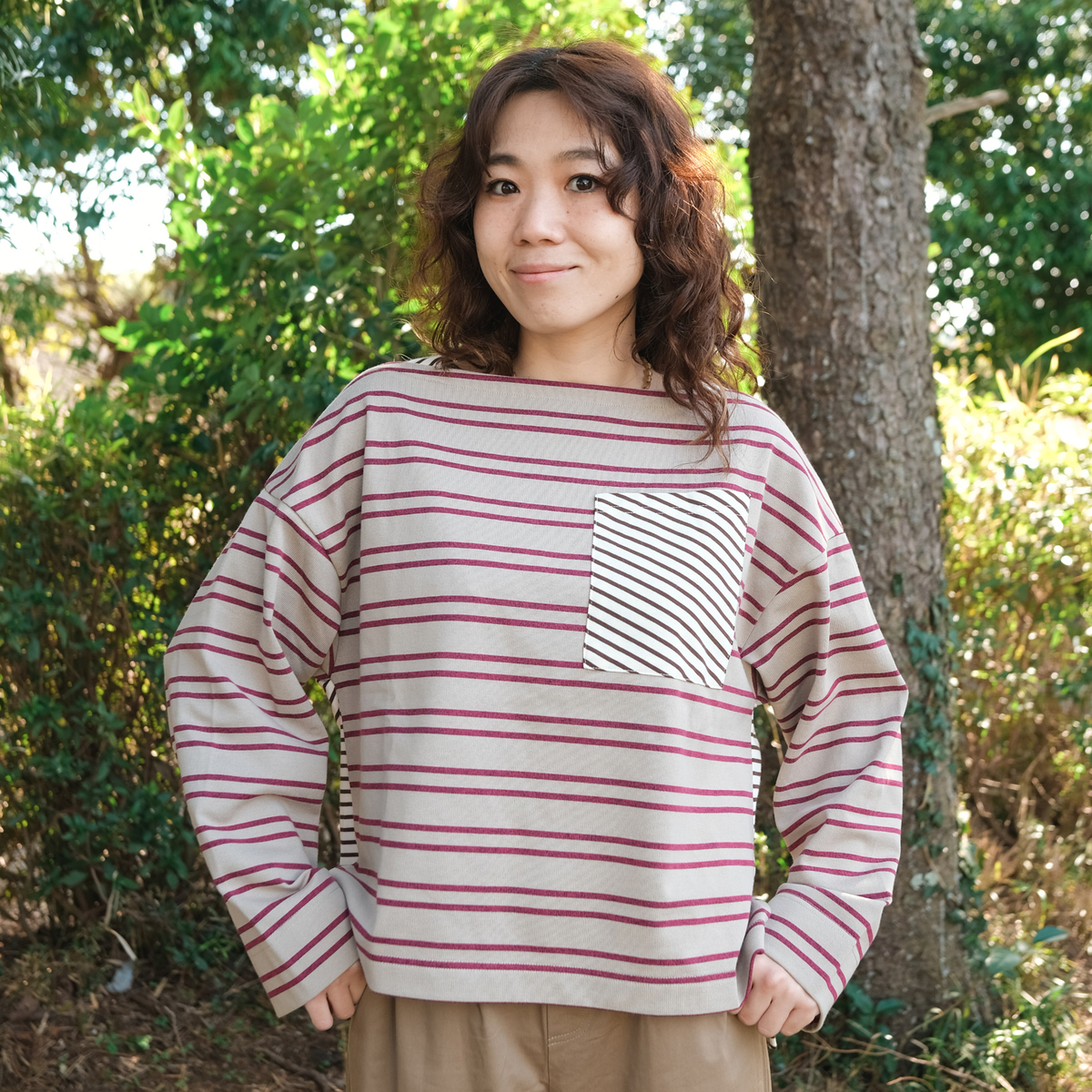 やや短めの前身頃に後ろは長めで前後差を付け、脇にはスリットが入っています。左胸ポケットには、あえて少し斜めに細めボーダーを叩き付け、動きのあるアクセントにしています