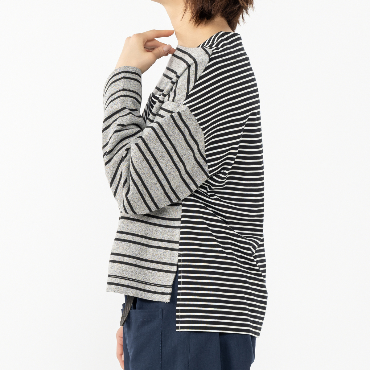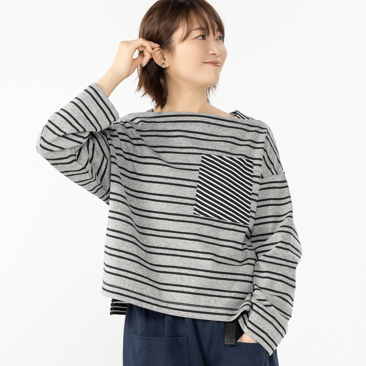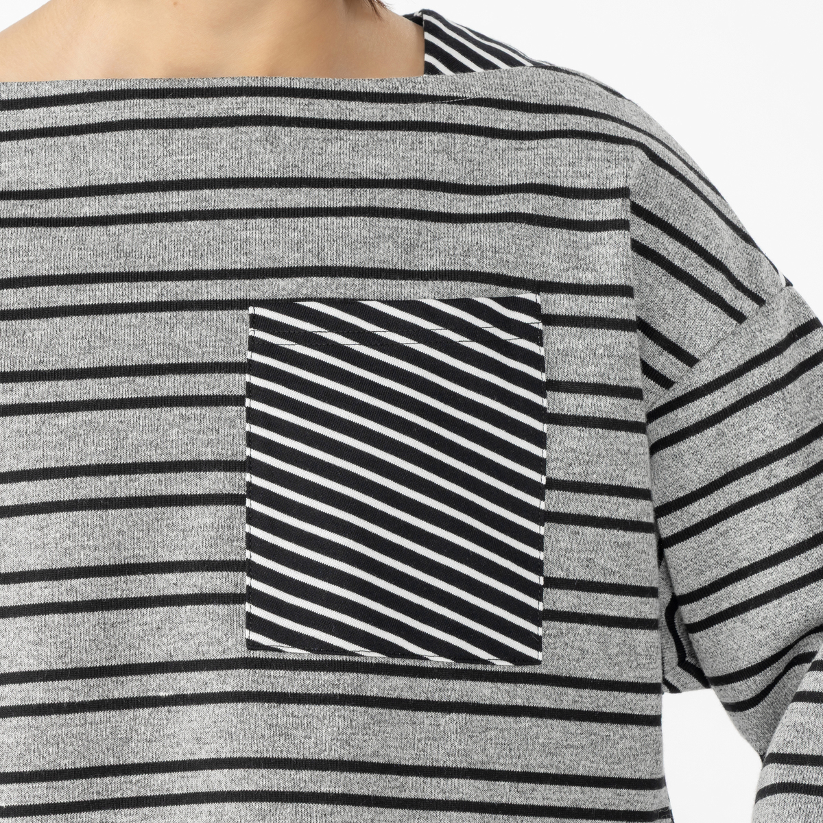 前身頃には太めボーダー、後ろ身頃には細めのボーダーを組合せたプルオーパー。前衿ぐりの重ね方が特徴的なボートネックで、ゆったりとした身頃と太めの筒袖がセーラー風なシルエットになっています