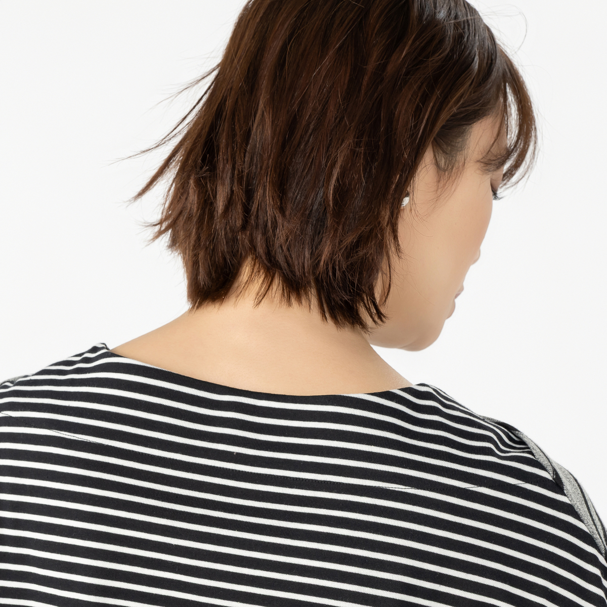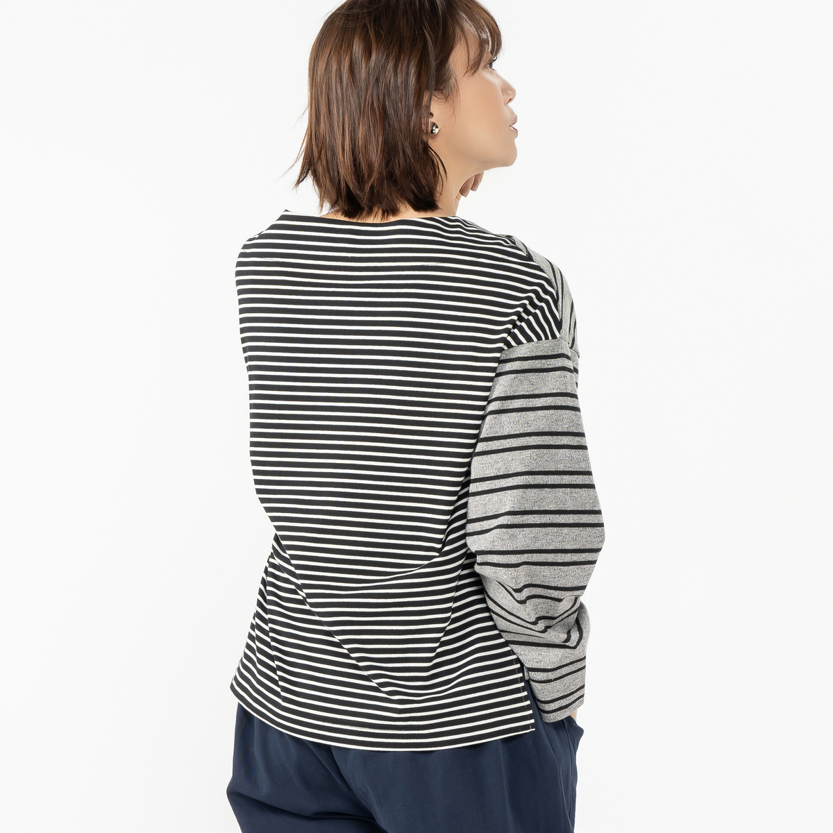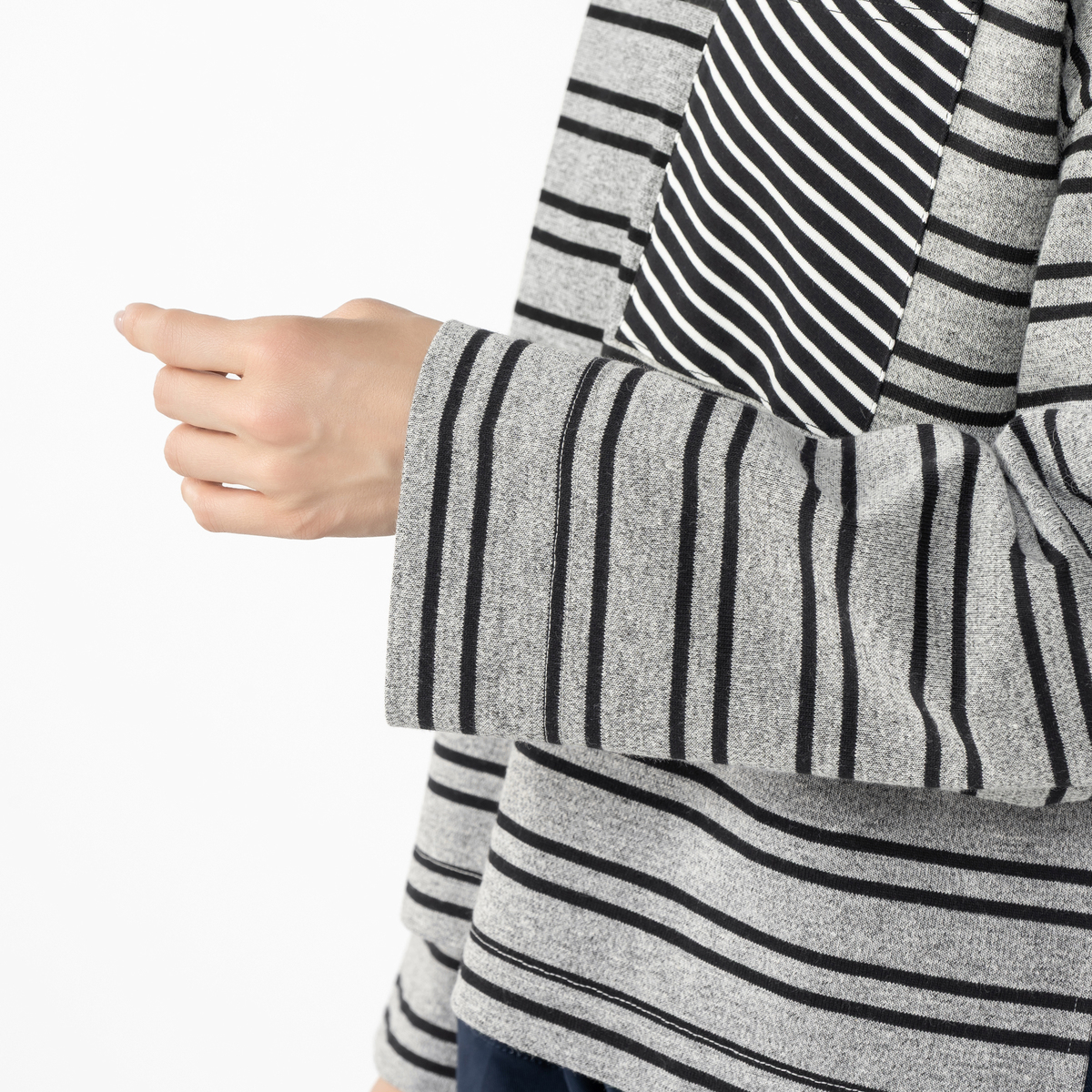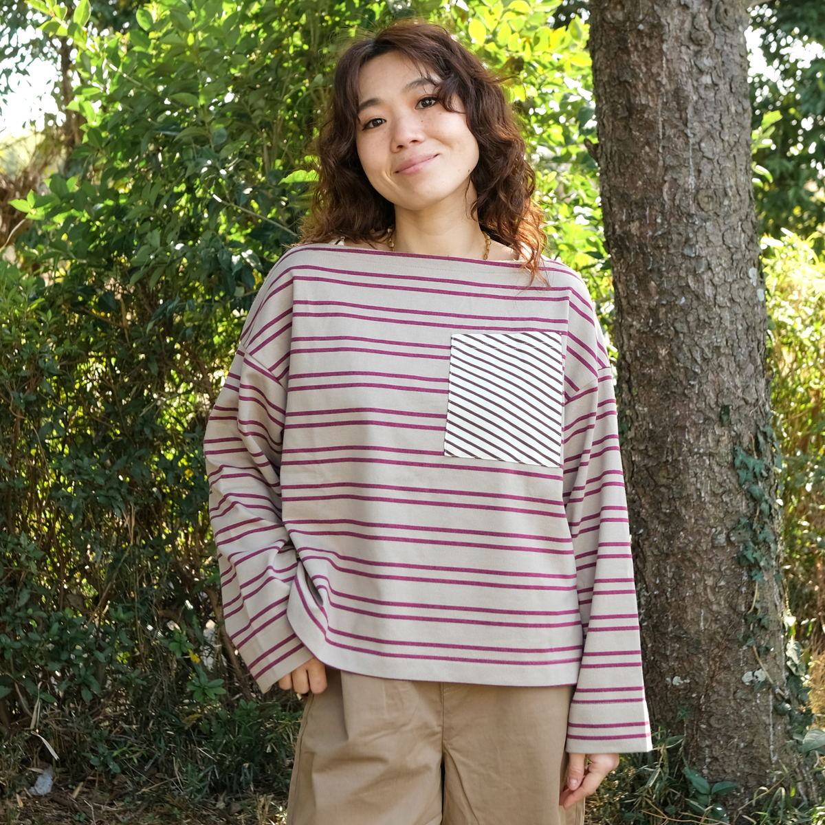 前身頃には太めボーダー、後ろ身頃には細めのボーダーを組合せたプルオーパー。前衿ぐりの重ね方が特徴的なボートネックで、ゆったりとした身頃と太めの筒袖がセーラー風なシルエットになっています