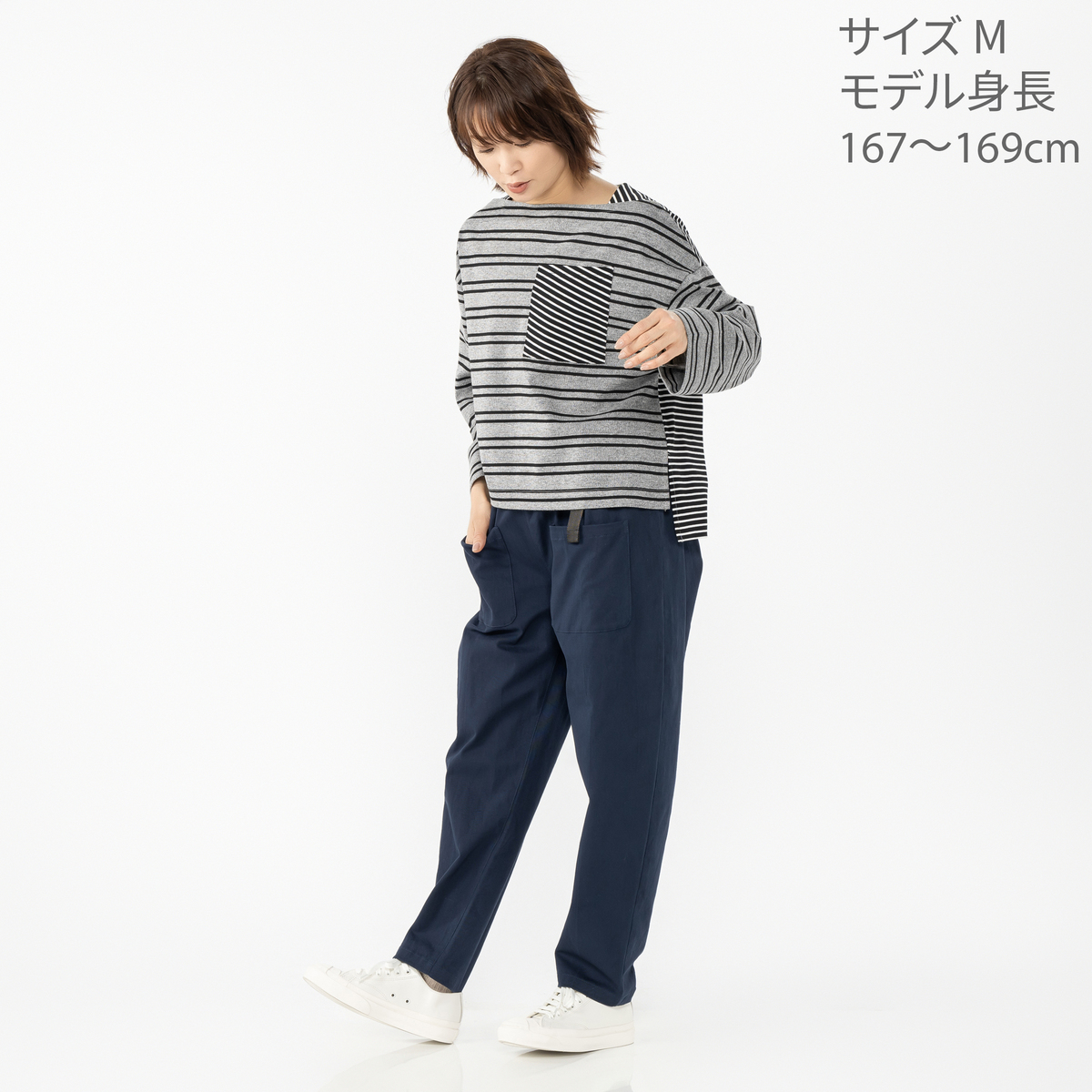 [商品寸法(ヌード)cm] サイズ バスト 着丈 S : 106(72〜80) 59.5 M : 110(79〜87) 59.5 L : 114(86〜94) 59.5 LL : 120(93〜101) 61.5 3L : 126(100〜108) 61.5 サイズ 裄丈 S : 76 M : 76.5 L : 77 LL : 78.5 3L : 79 [素材] 太ボーダー:ポリエステル70% 綿25% ポリウレタン5% 細ボーダー:綿50% ポリエステル50% [お手入れ] 洗濯機洗い可 [注意事項] ※商品寸法の誤差は多少発生します。ご了承下さい ※淡色製品には蛍光増白剤入り洗剤を使用しないで下さい ※洗濯後はすぐに脱水し、形を整えて干して下さい。長時間、水につけたままにしないで下さい ※洗濯・クリーニングの際、色落ちすることがありますので他の物と分けて洗って下さい ※ドライクリーニングの際は洗濯ネットを使用して下さい ※濃色製品は着用中の摩擦により色移りすることがあります。また、雨や汗等で濡れた状態で着用すると色移りすることがあります。その際はお早めに洗濯をして下さい ※アイロン時にはあて布を使用して下さい ※洗濯ネットを必ず使用して下さい ※この製品は、光により退色しやすいので太陽光や蛍光灯等が長時間当たる所で保管しないで下さい ※着用時にベルトやバッグ、周囲の壁など、表面の粗いものとの摩擦や引っかかりに注意して下さい 【中国製】