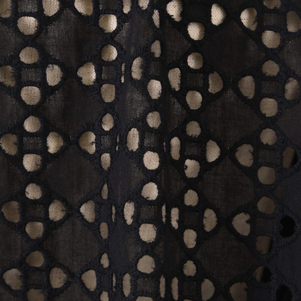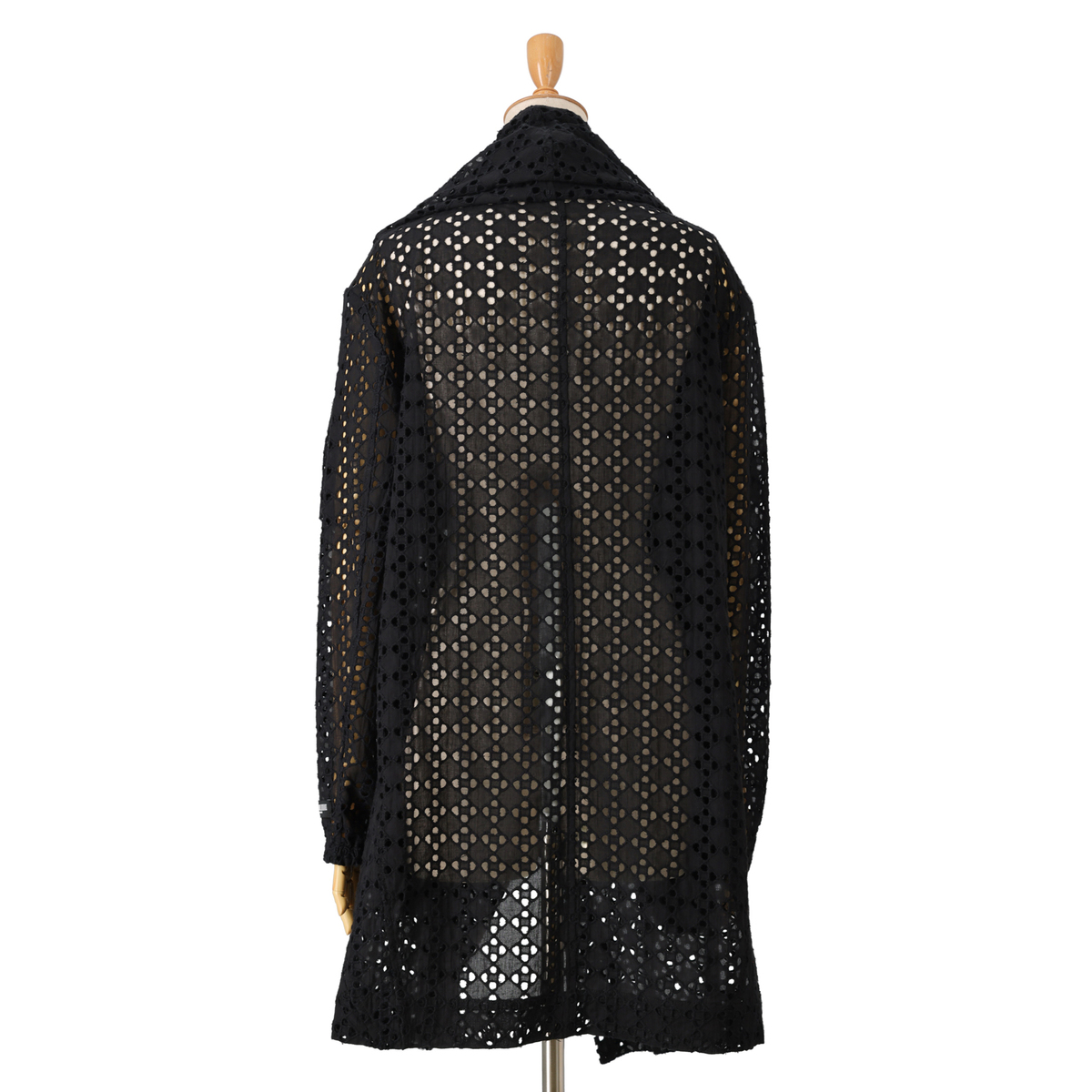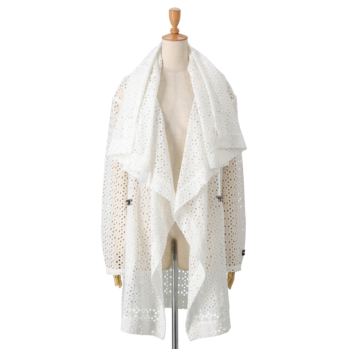 カットワークレース素材のひざ丈コート。中に合わせるアイテムの色がレイヤーで重なり、コーディネートが楽しめます。身巾がたっぷりありながら、前身頃のドレープラインで縦長な印象をもたらしてくれます