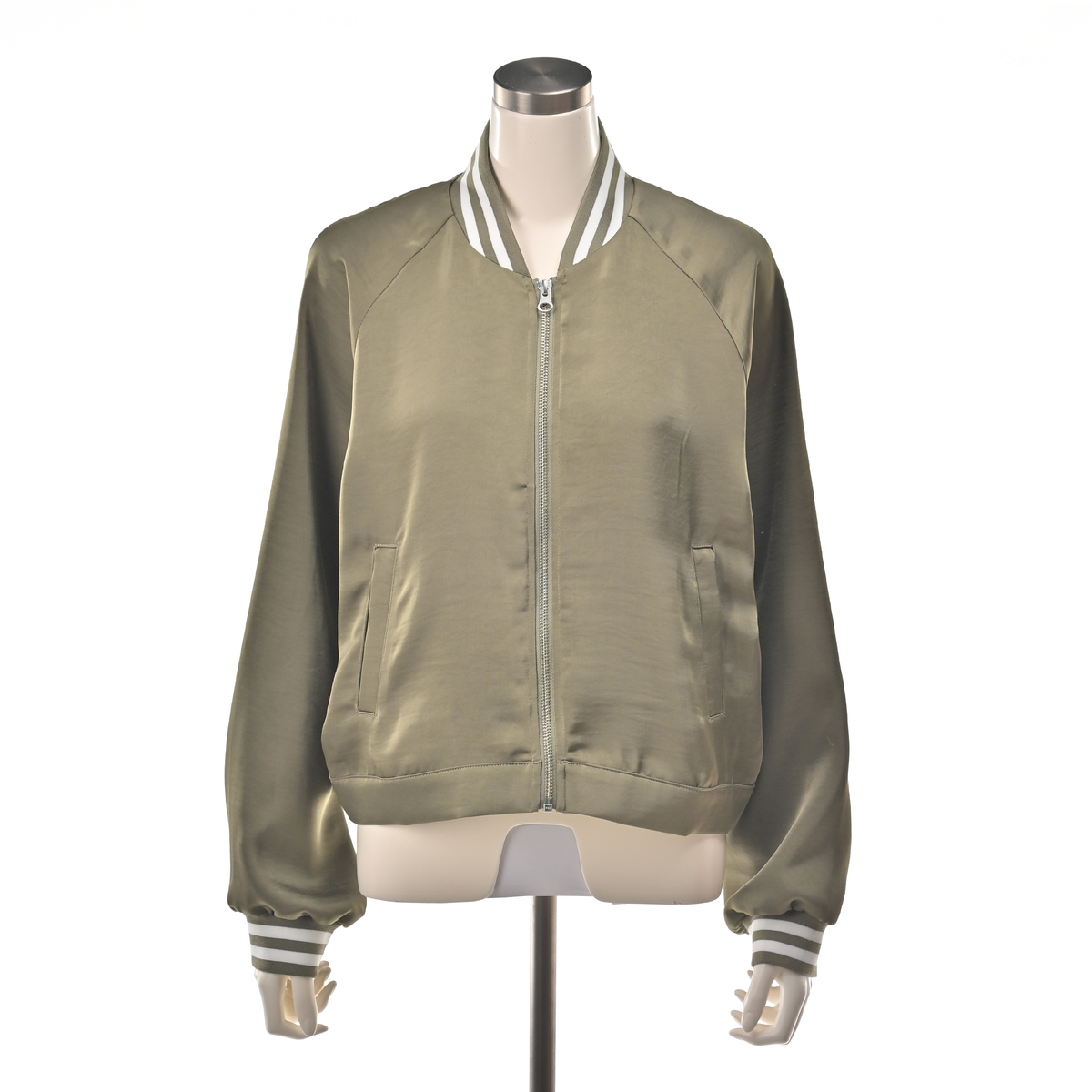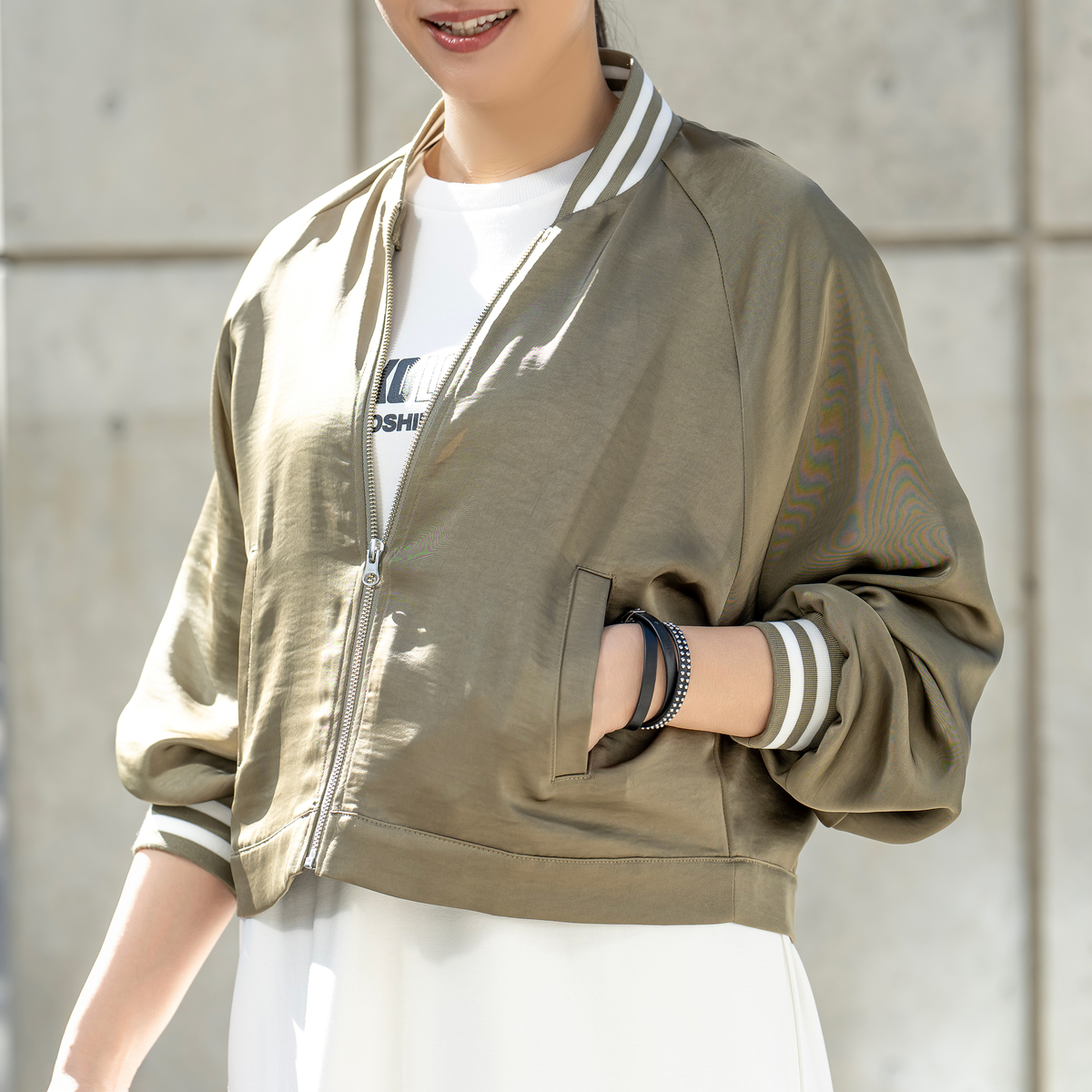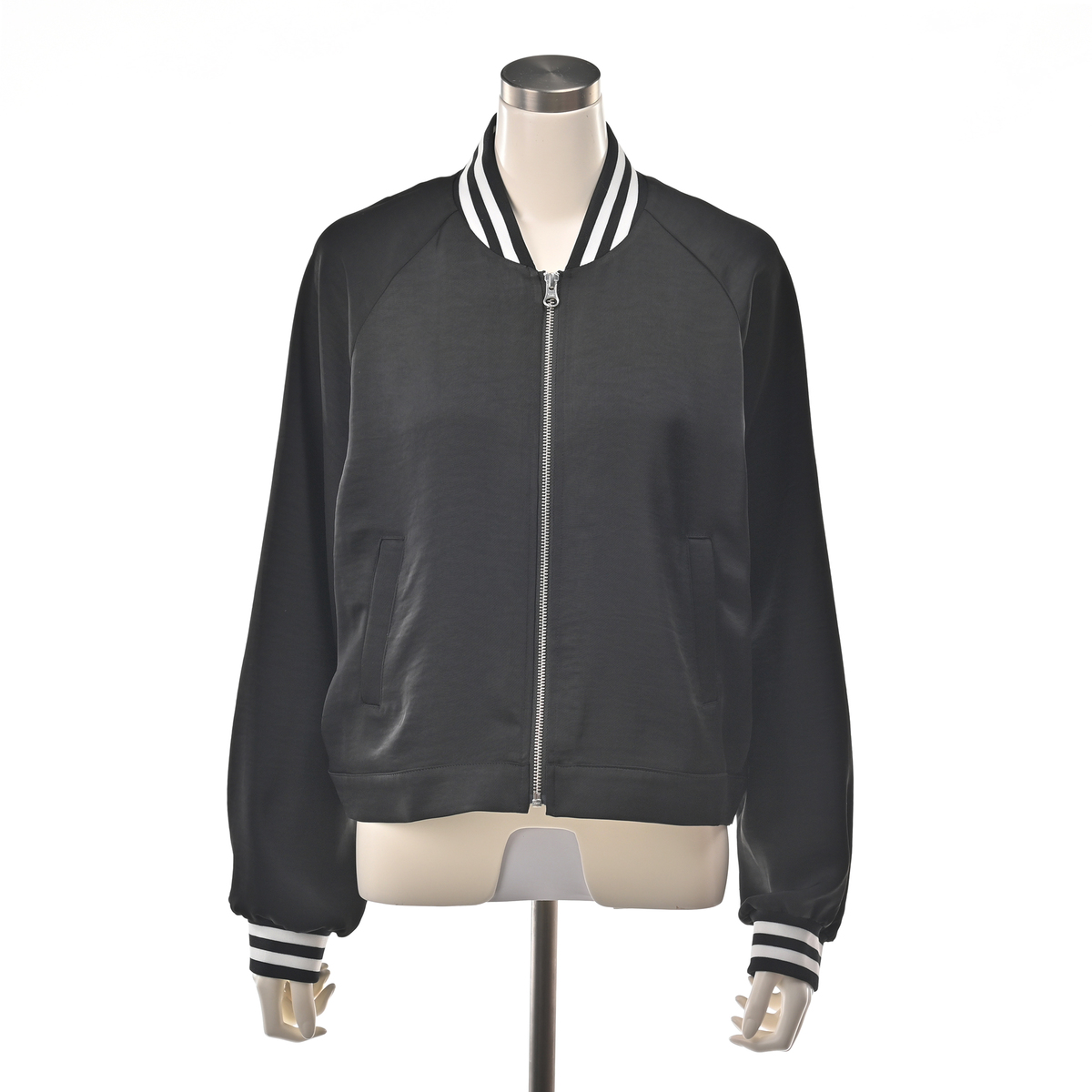 光沢感のあるサテン素材とリブ使いが、上品さと軽快さを両立させたブルゾン。短丈でゆとりのあるシルエットながら、素材の落ち感と袖のラインを細めにすることで、すっきりとした印象に仕上げました
