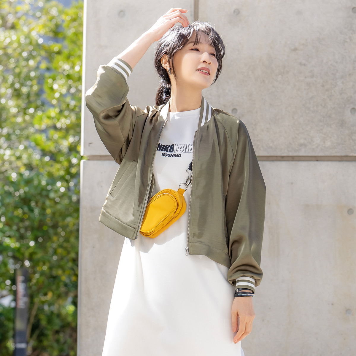 ワンピースやデニムなど幅広いスタイルに合わせやすい丈感。背中のロゴプリントが、カジュアル過ぎず大人のデザインで、日常のお出かけシーンに活躍します