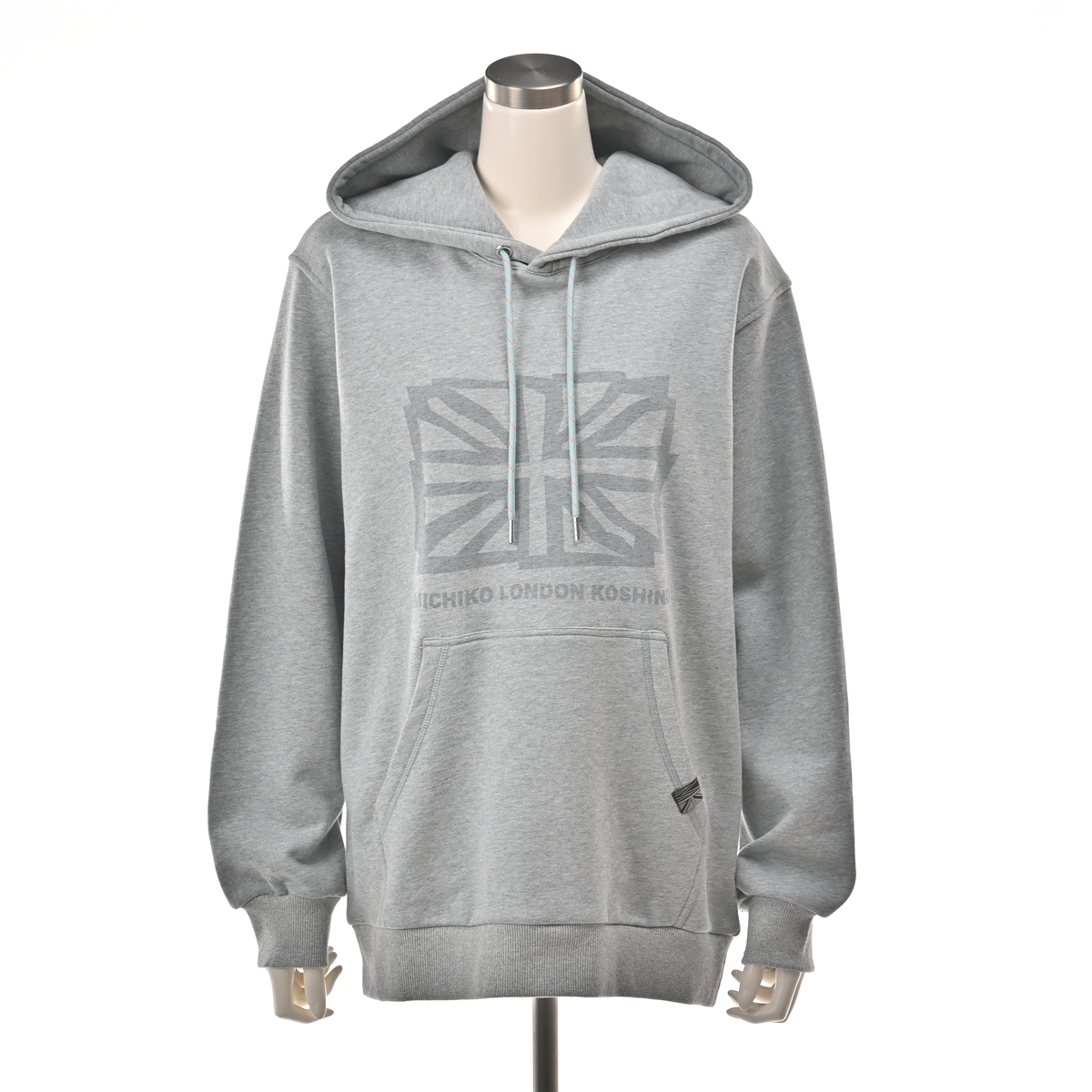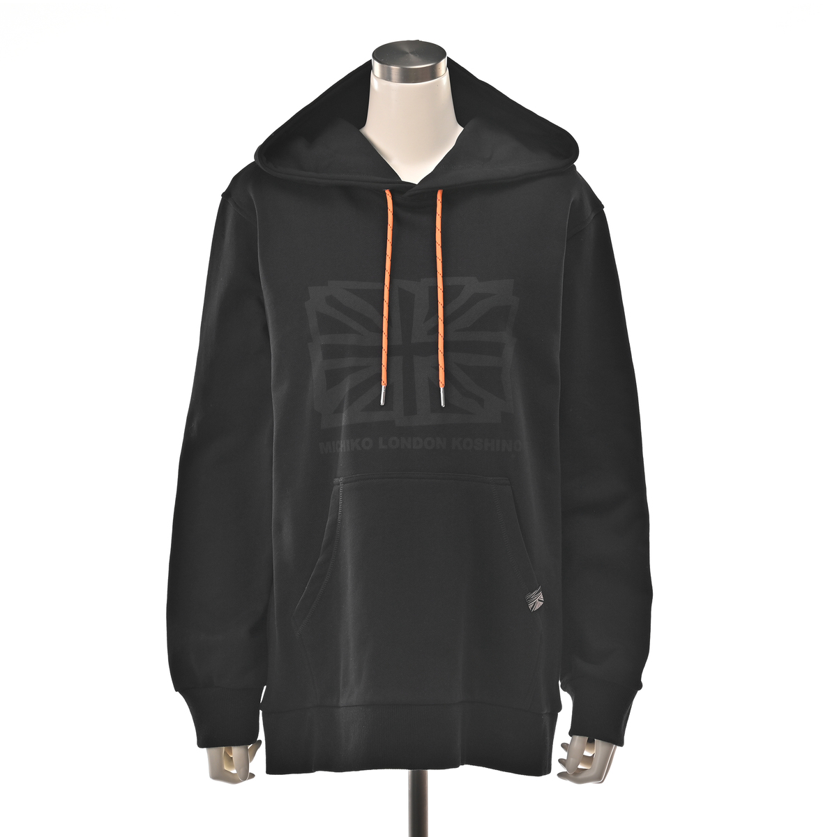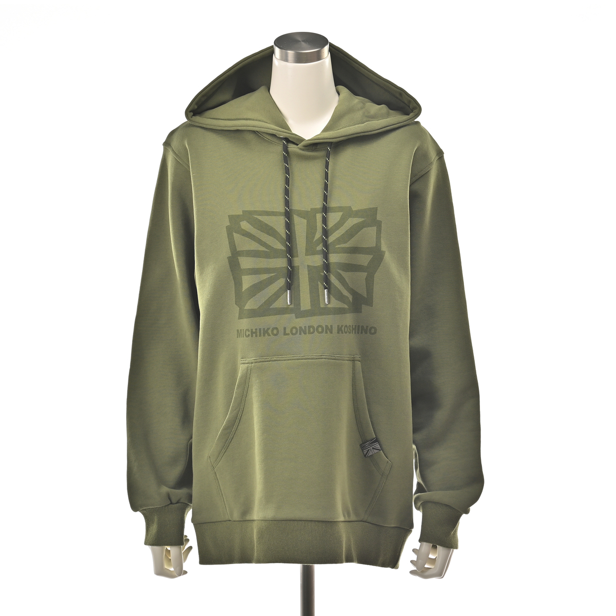 ユニオンジャックをフロントに配したフーディ。アクセントカラーのヒモが全体を引き締め、左ポケット口にはMKとユニオンジャックを合わせたデザインのピスネームでさりげなく個性を添えています